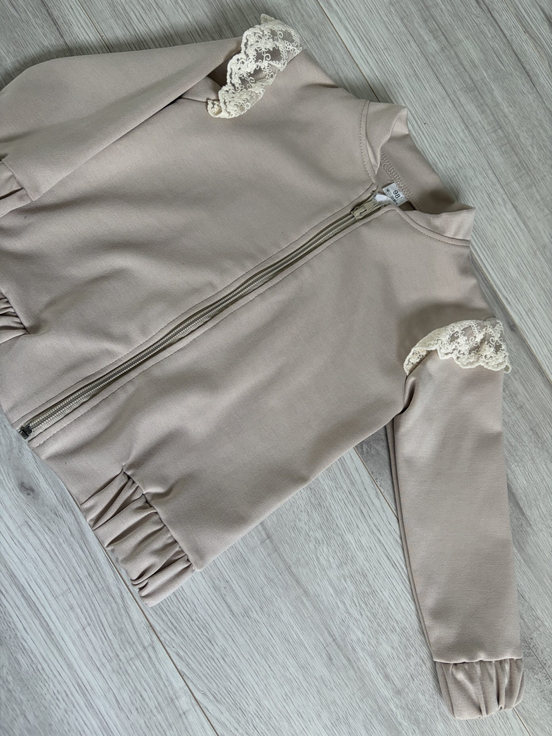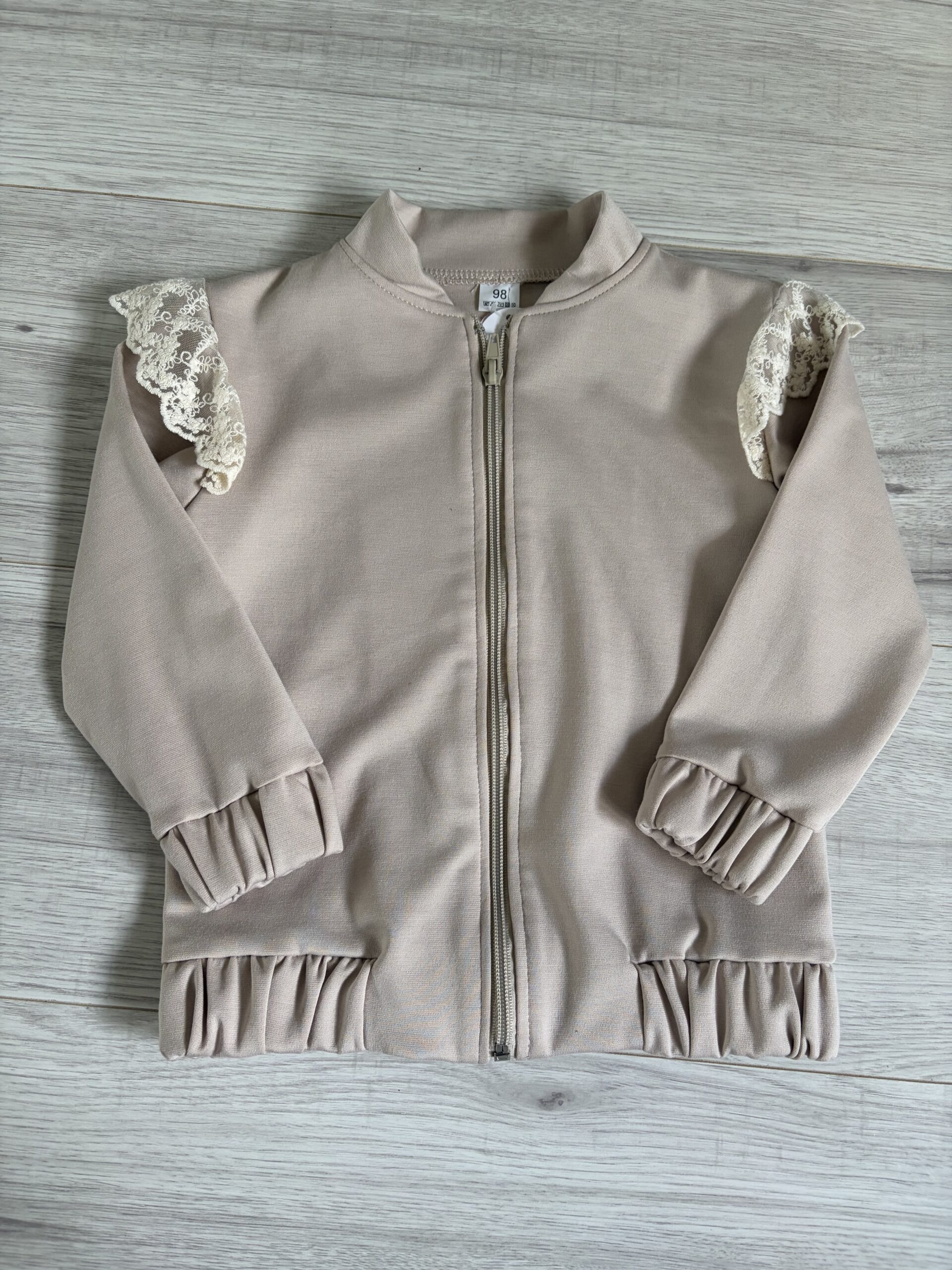 Stylowa bluza dziewczęca w modnym beżowym kolorze. Model zapinany na zamek błyskawiczny, z subtelną ozdobną koronką na rękawach, która nadaje całości eleganckiego charakteru.