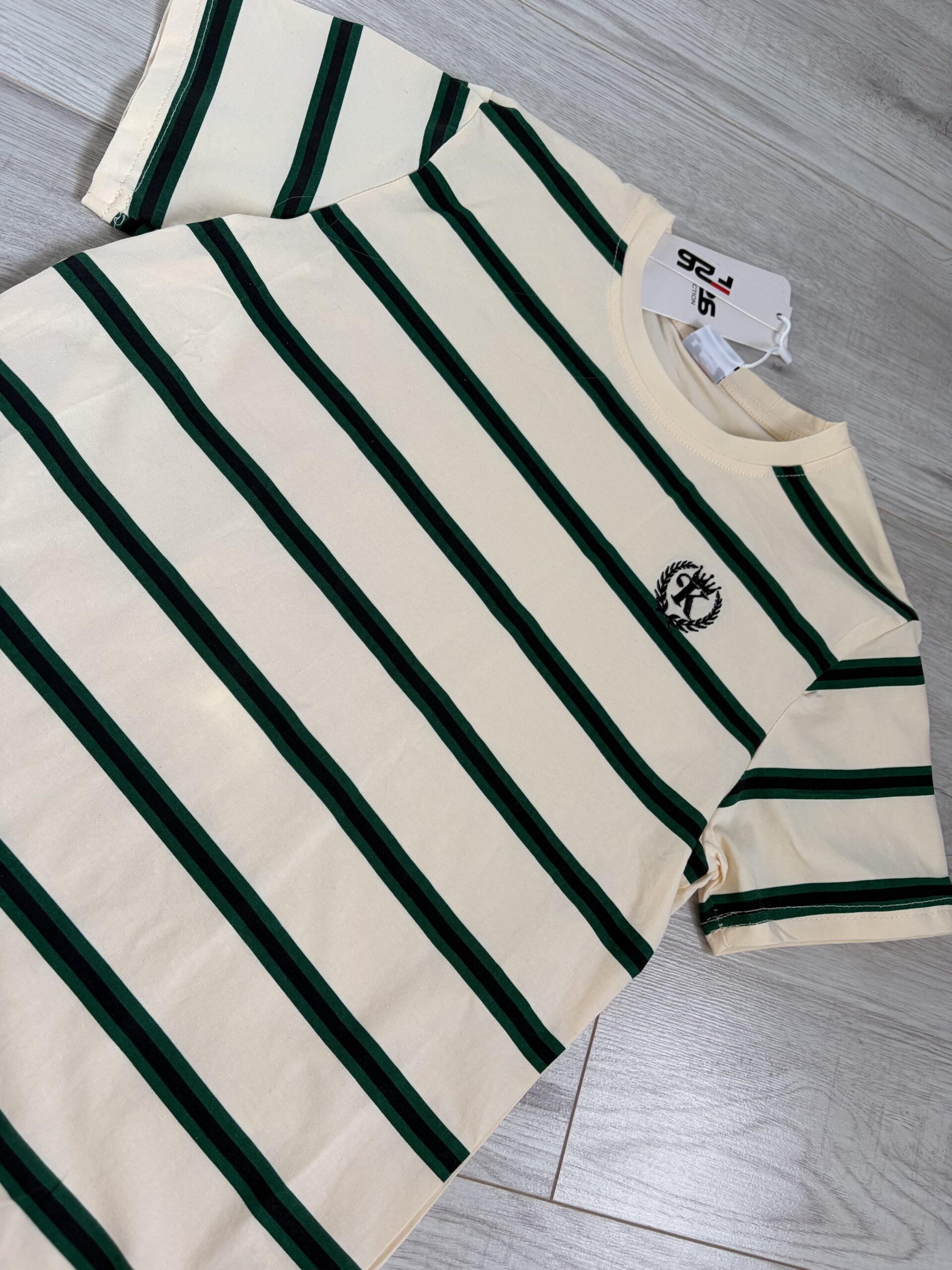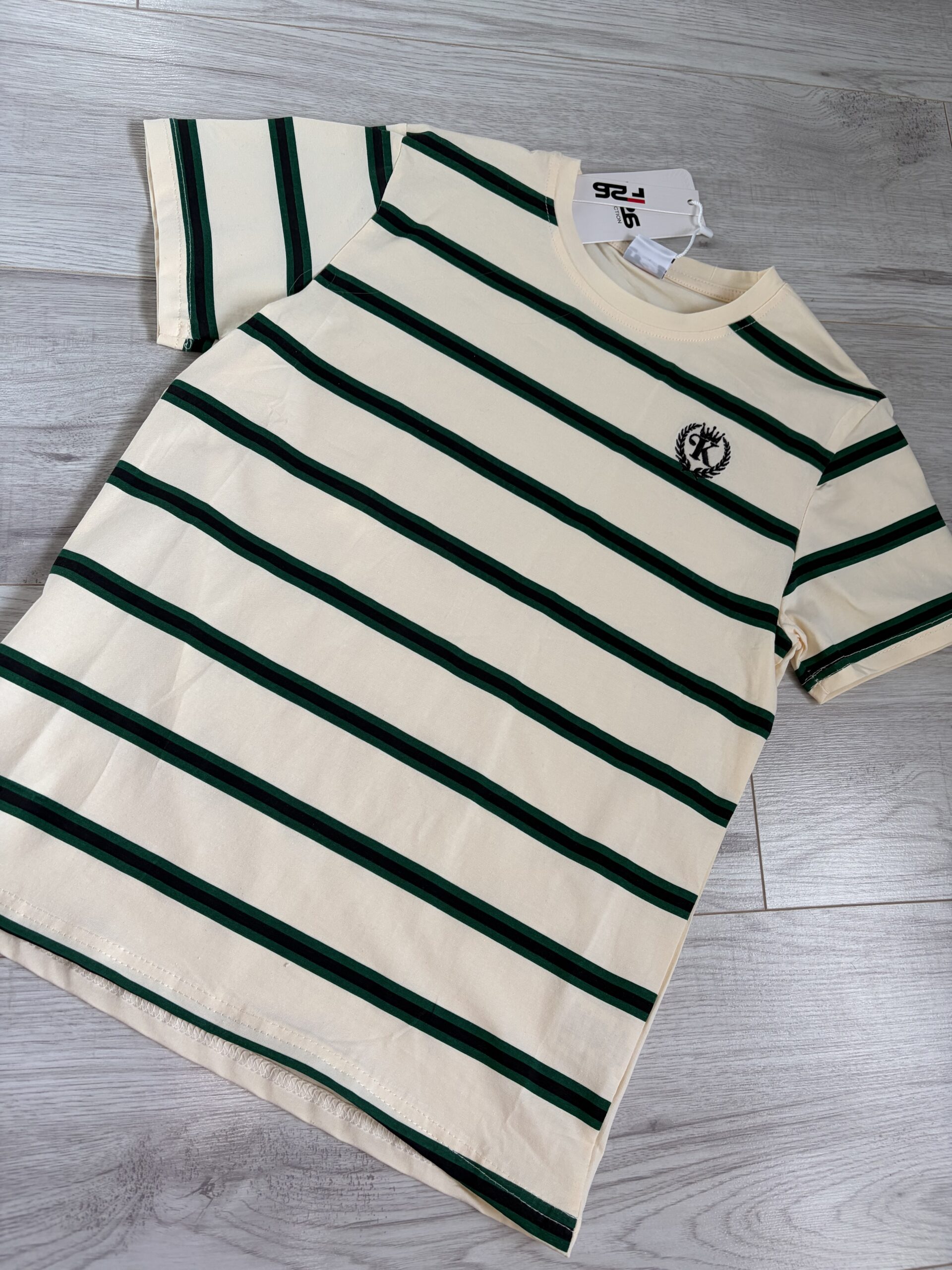 Stylowa koszulka dla chłopca w modnym beżowym kolorze z paskami