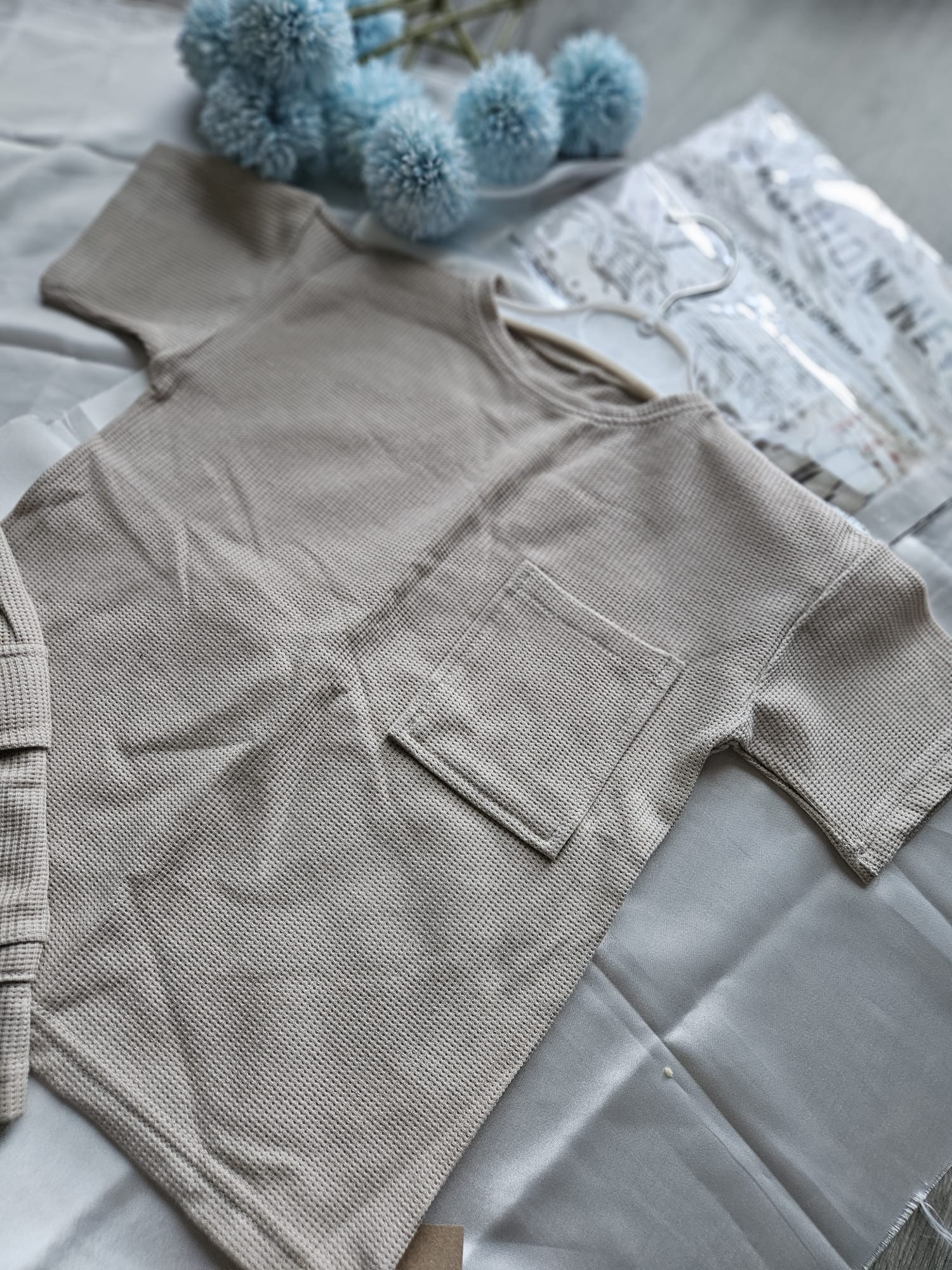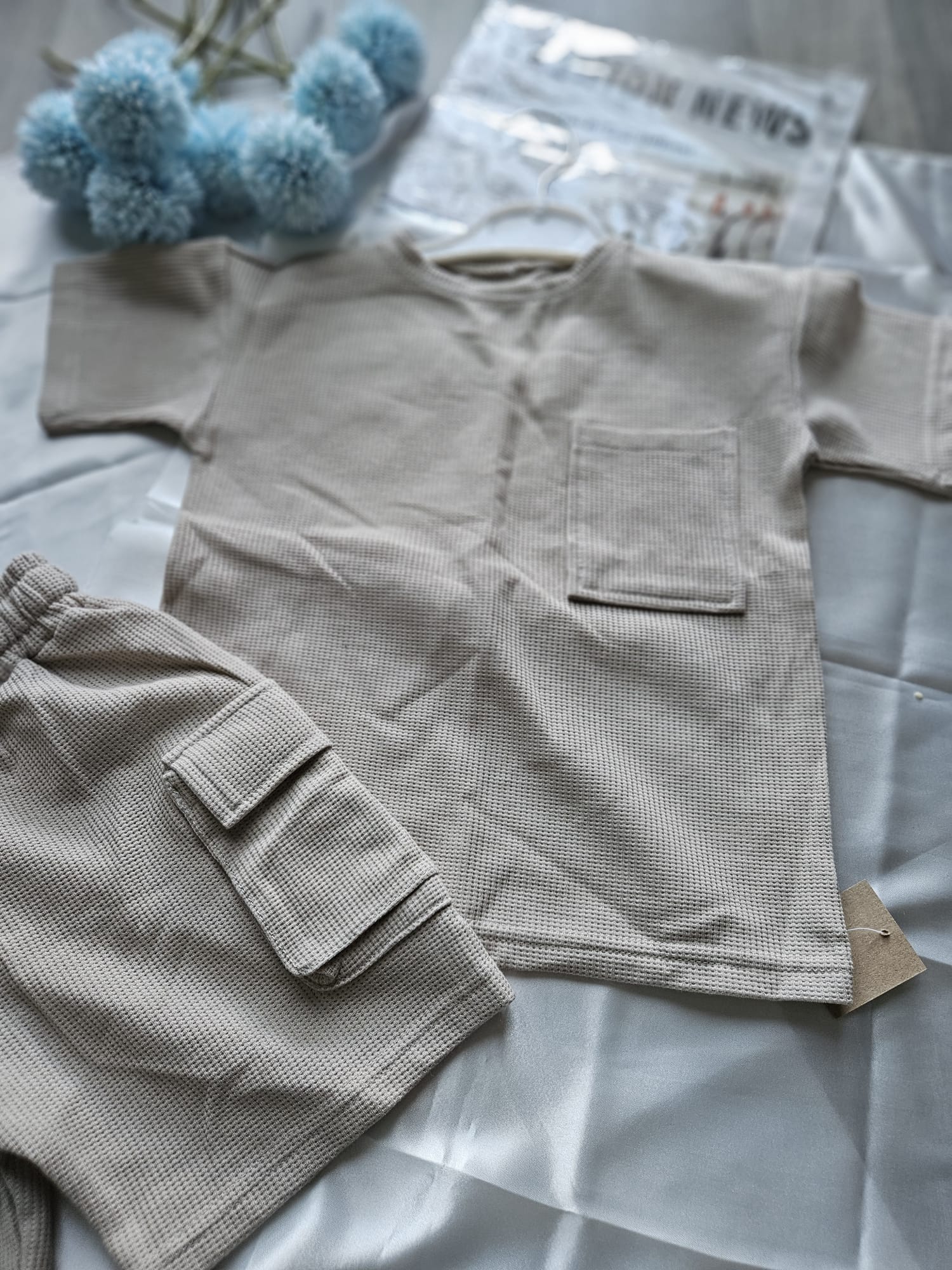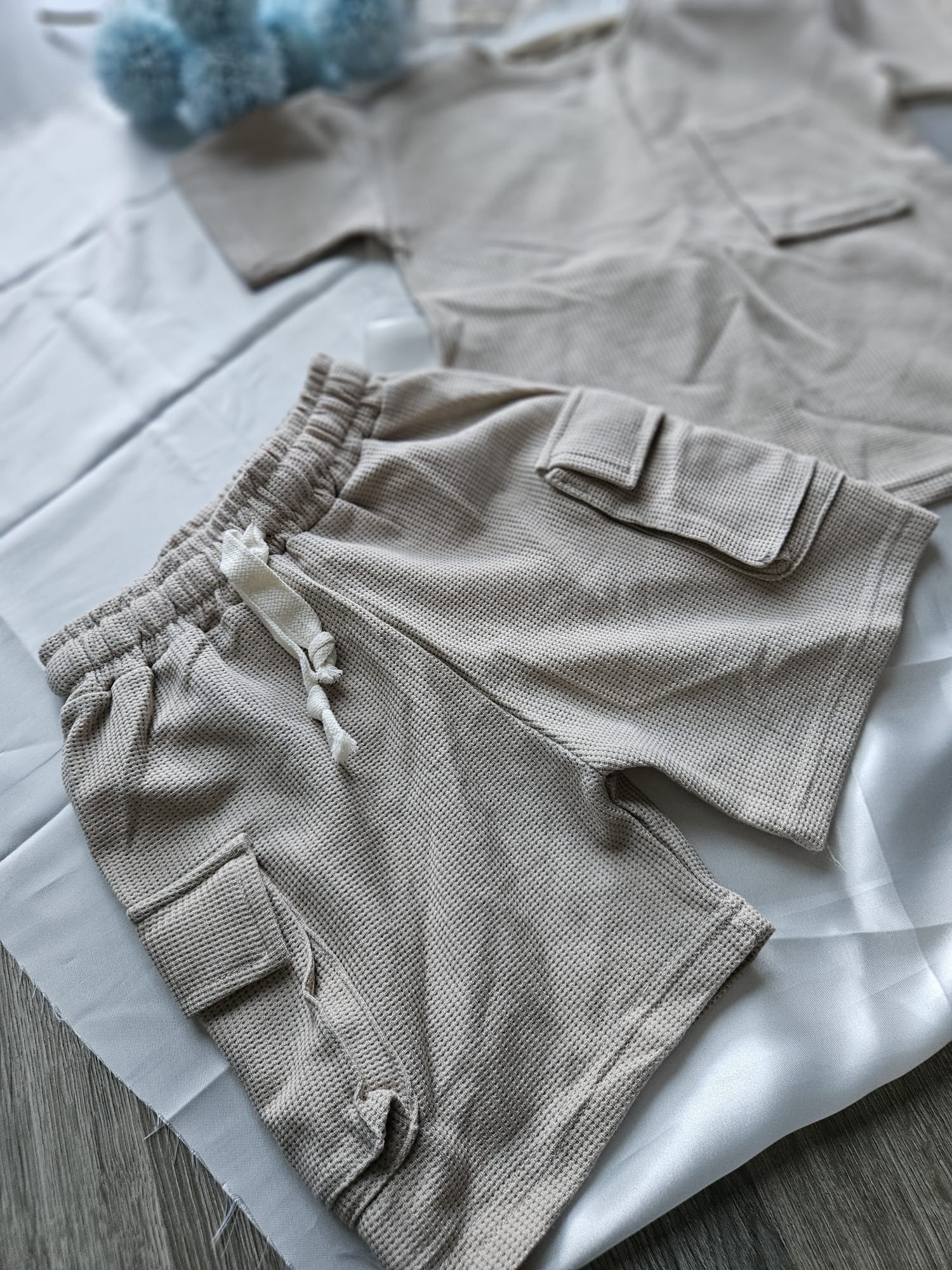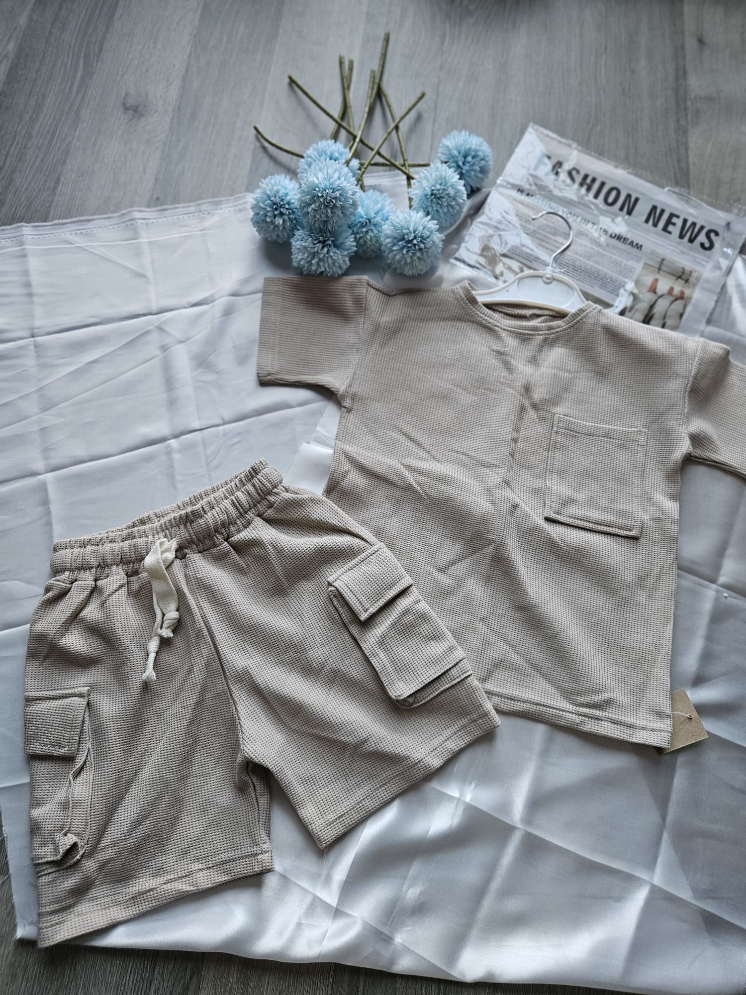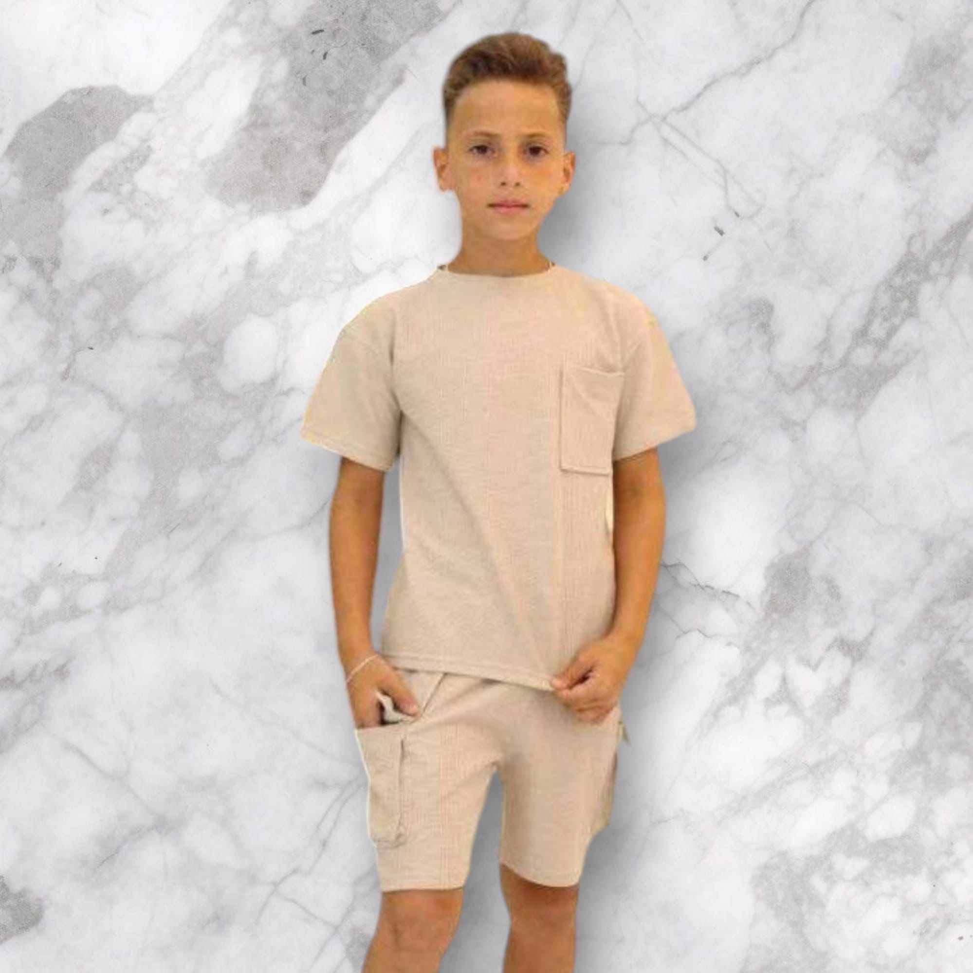 Beżowy komplet dla chłopca – wygodna koszulka i spodenki stworzone do zabawy.