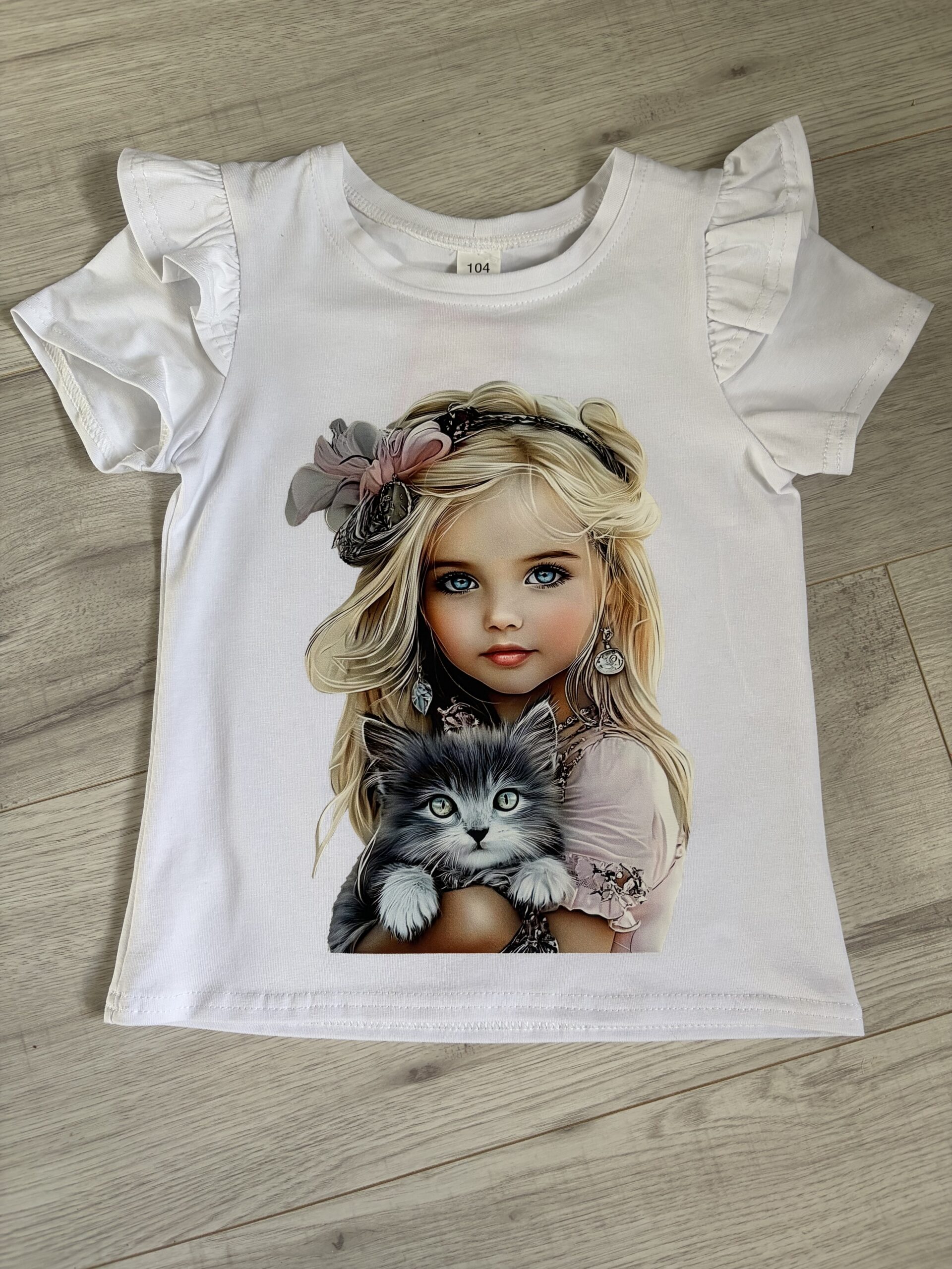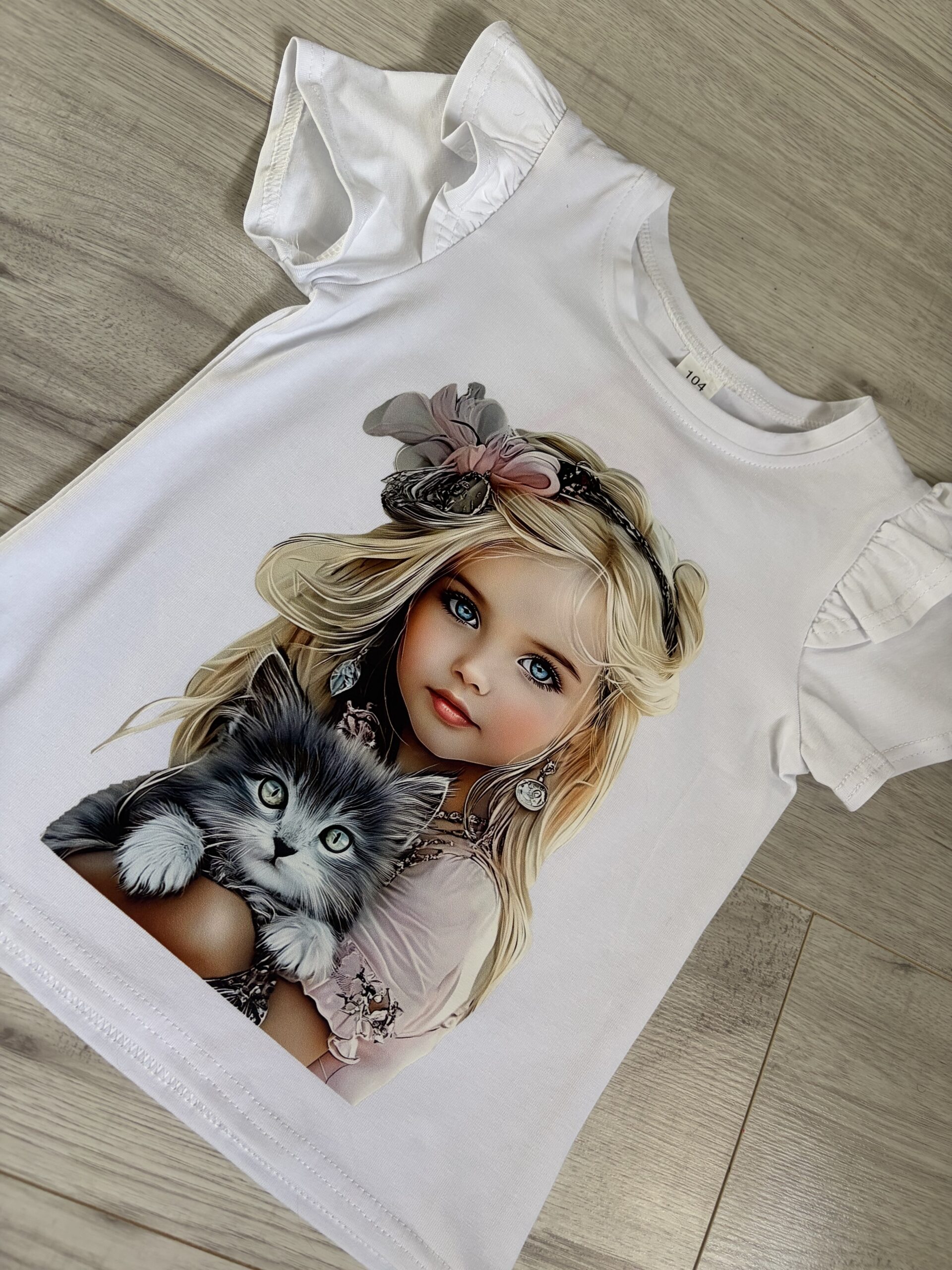 Urocza biała koszulka dziewczęca wykonana z miękkiej bawełny. Model ozdobiony efektowną grafiką przedstawiającą lalkę z kotkiem oraz delikatnymi falbankami na rękawkach.