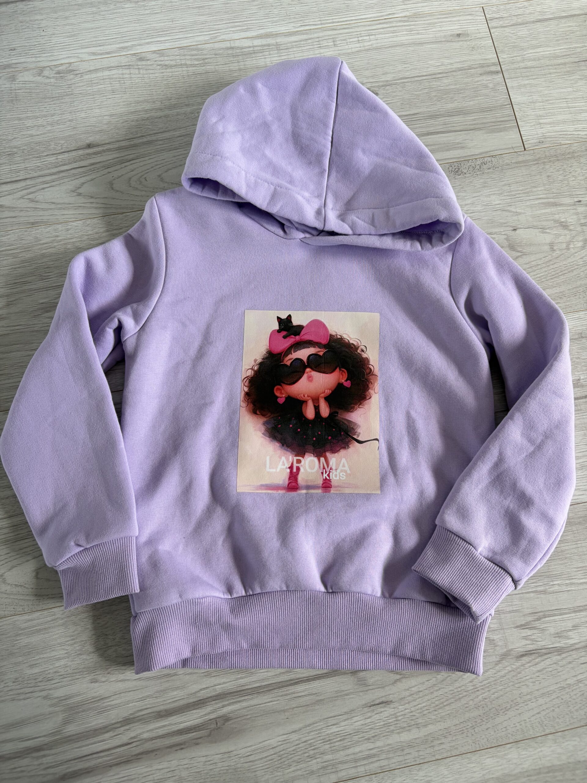 Bluza ocieplana w pięknym kolorze lila z kapturem , z aplikacją lali .