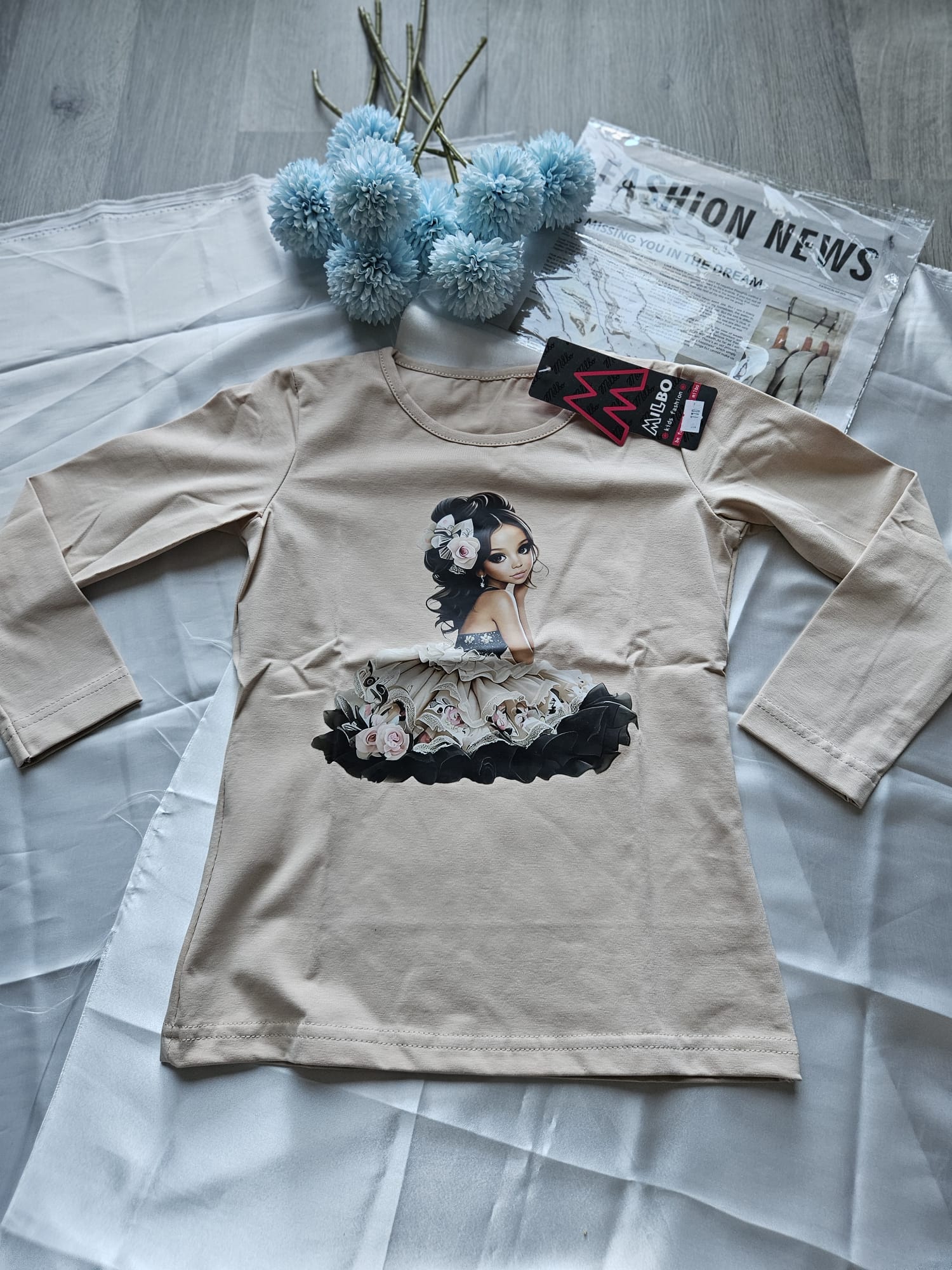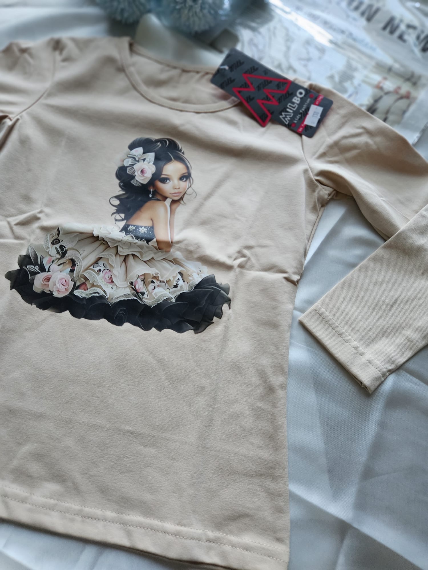 Miękka i wygodna bluzka na długi rękaw dla dziewczynki! Beżowy kolor i urocza aplikacja lali na przodzie dodają subtelnego uroku, a połączenie bawełny z elastanem zapewnia elastyczność i swobodę ruchów przez cały dzień.