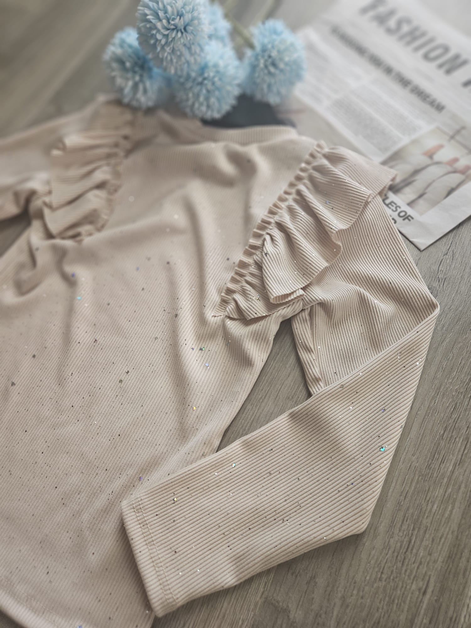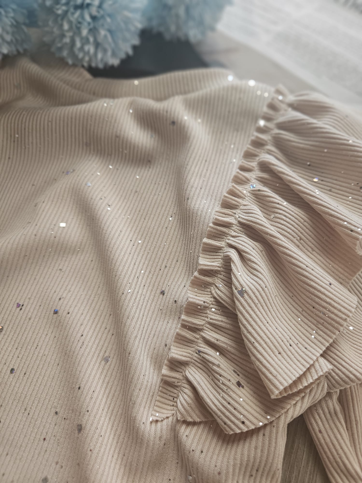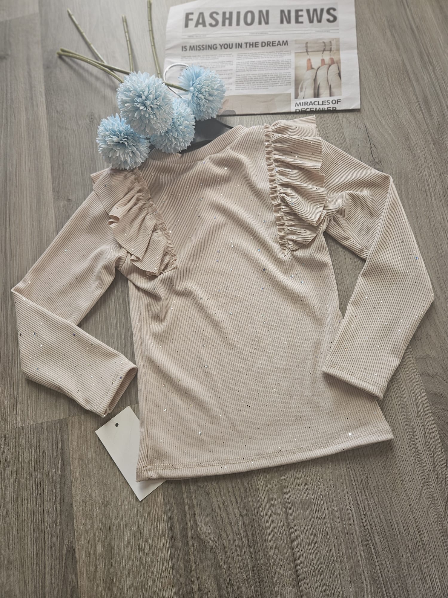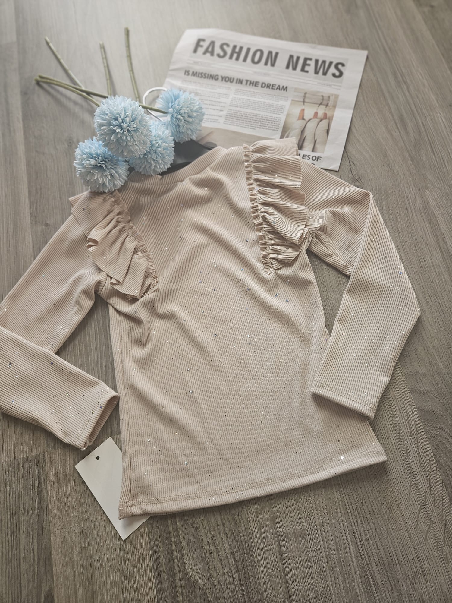 Bluzka w kolorze beżowym z długim rękawem dla dziewczynki, która zachwyca subtelnym blaskiem. Całość pokryta jest ozdobnym, błyszczącym pyłkiem, dodającym wyjątkowego uroku każdej stylizacji. Idealna na co dzień i na specjalne okazje – wygodna, a jednocześnie efektowna.