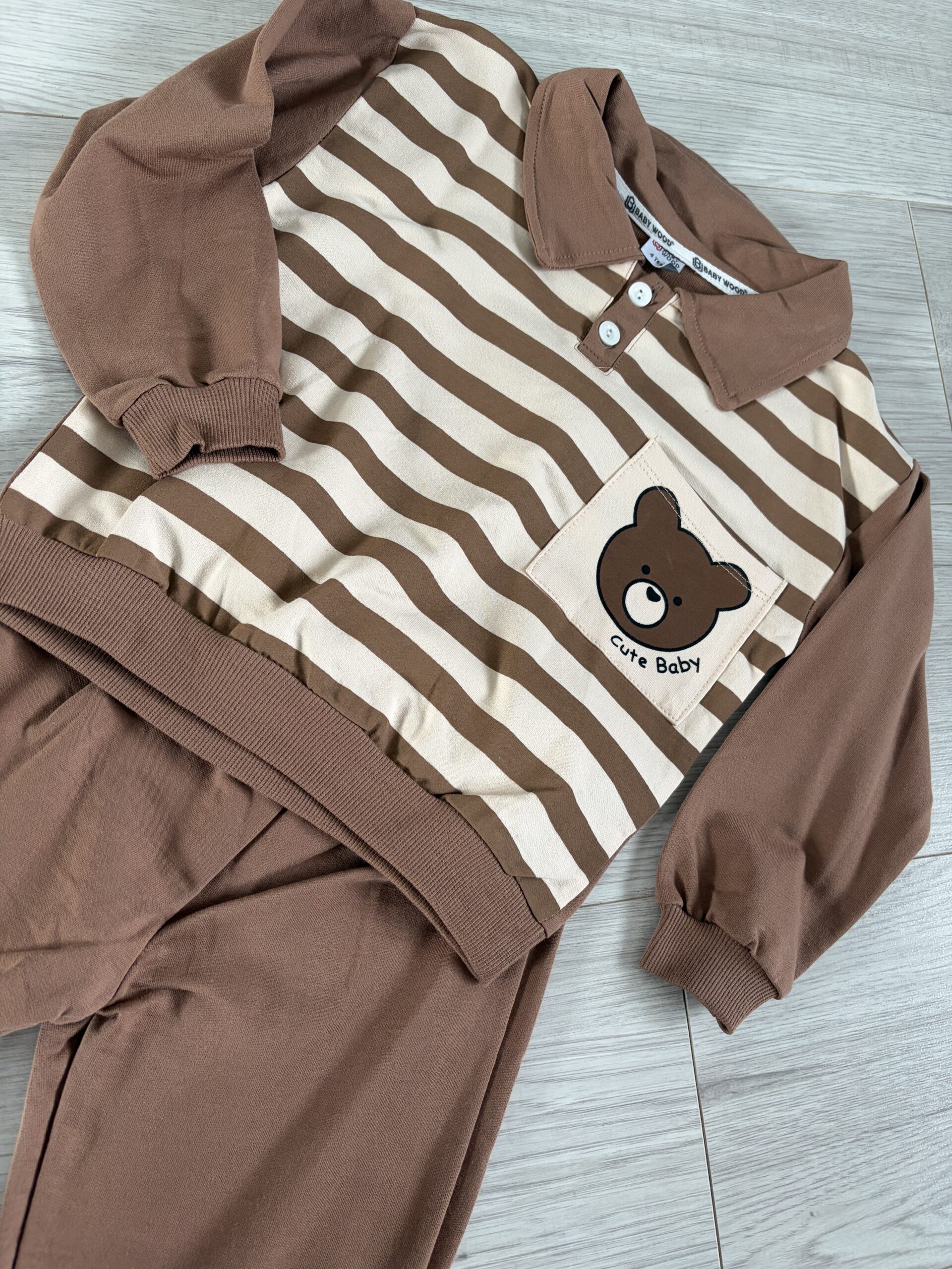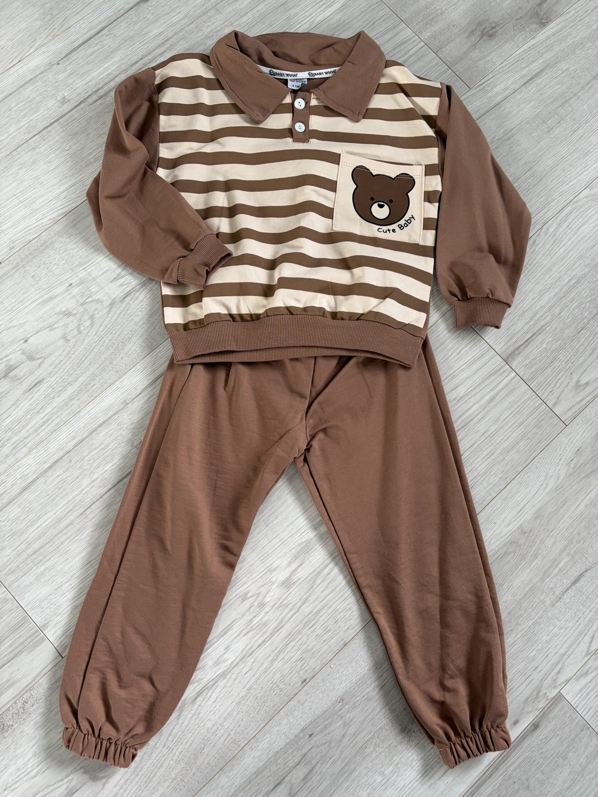 Brązowy komplet chłopięcy z misiem – bluzka w paski + spodnie