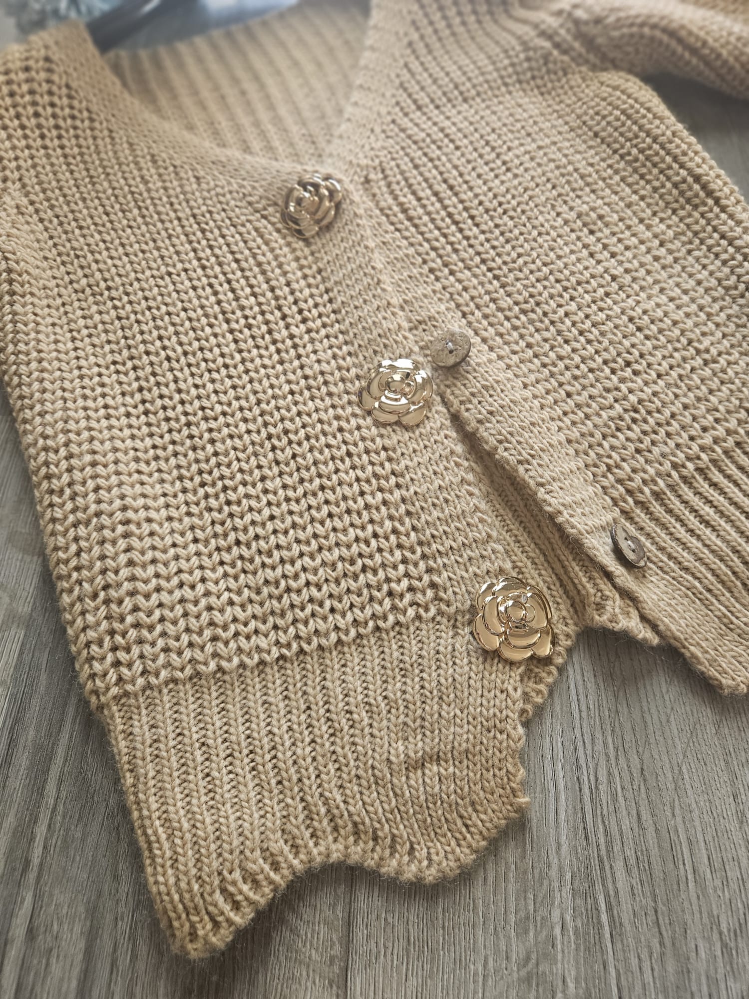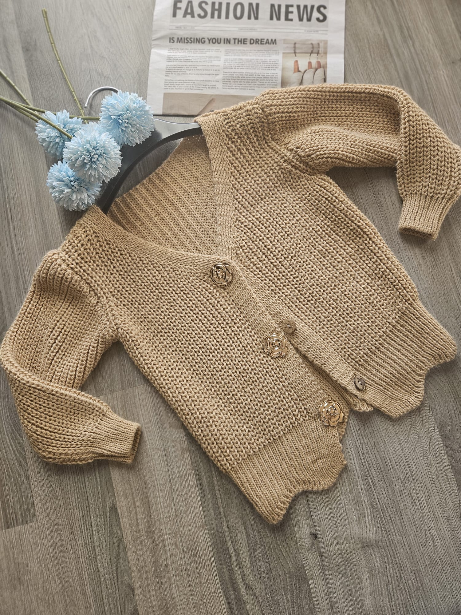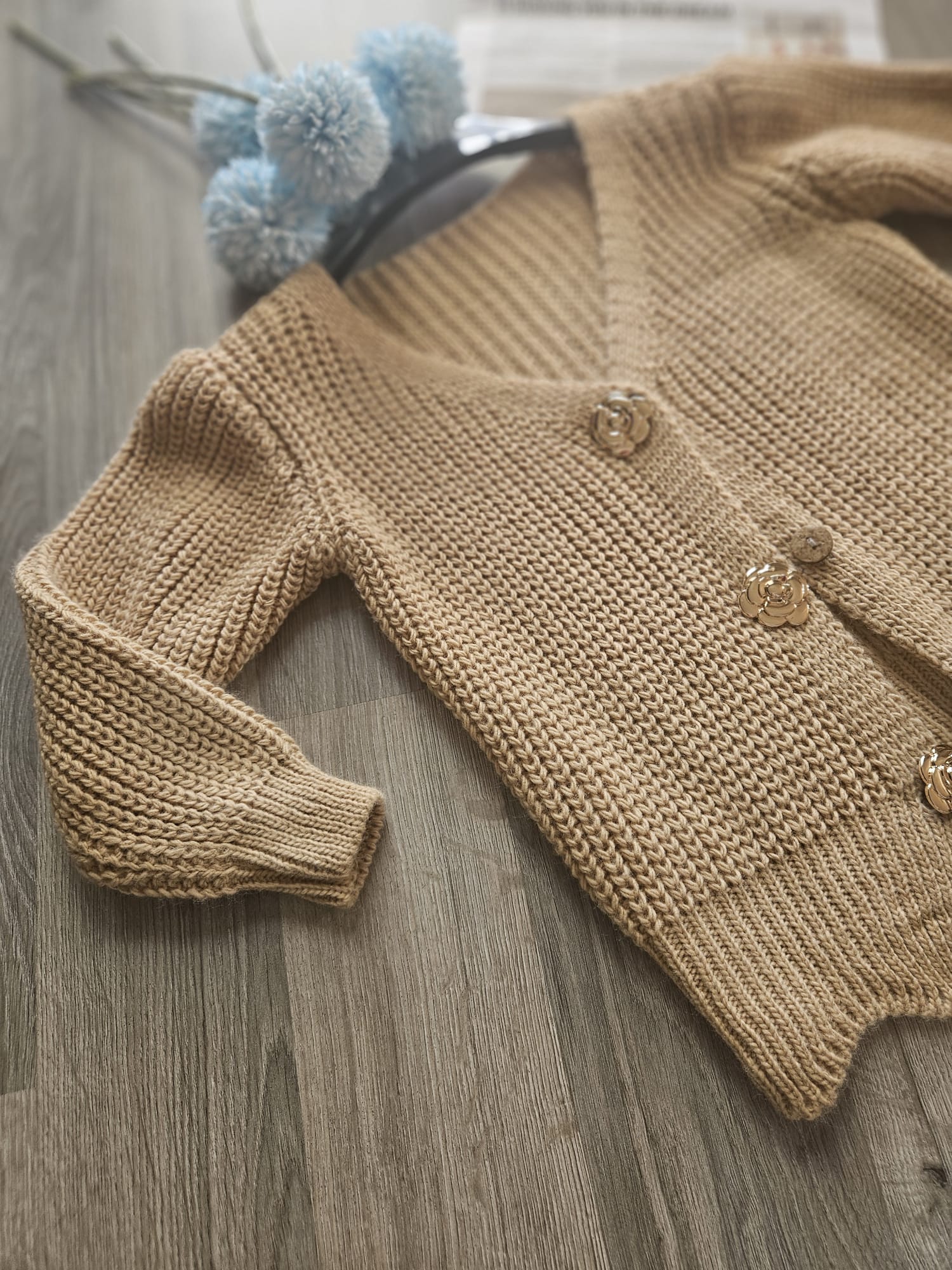 Brązowy sweterek dla dziewczynki zapinany na guziki, ozdobiony uroczymi kwiatkami na grafice. Miękki i wygodny, łączy praktyczność z dziewczęcym stylem – idealny na codzienne i nieco bardziej eleganckie stylizacje.