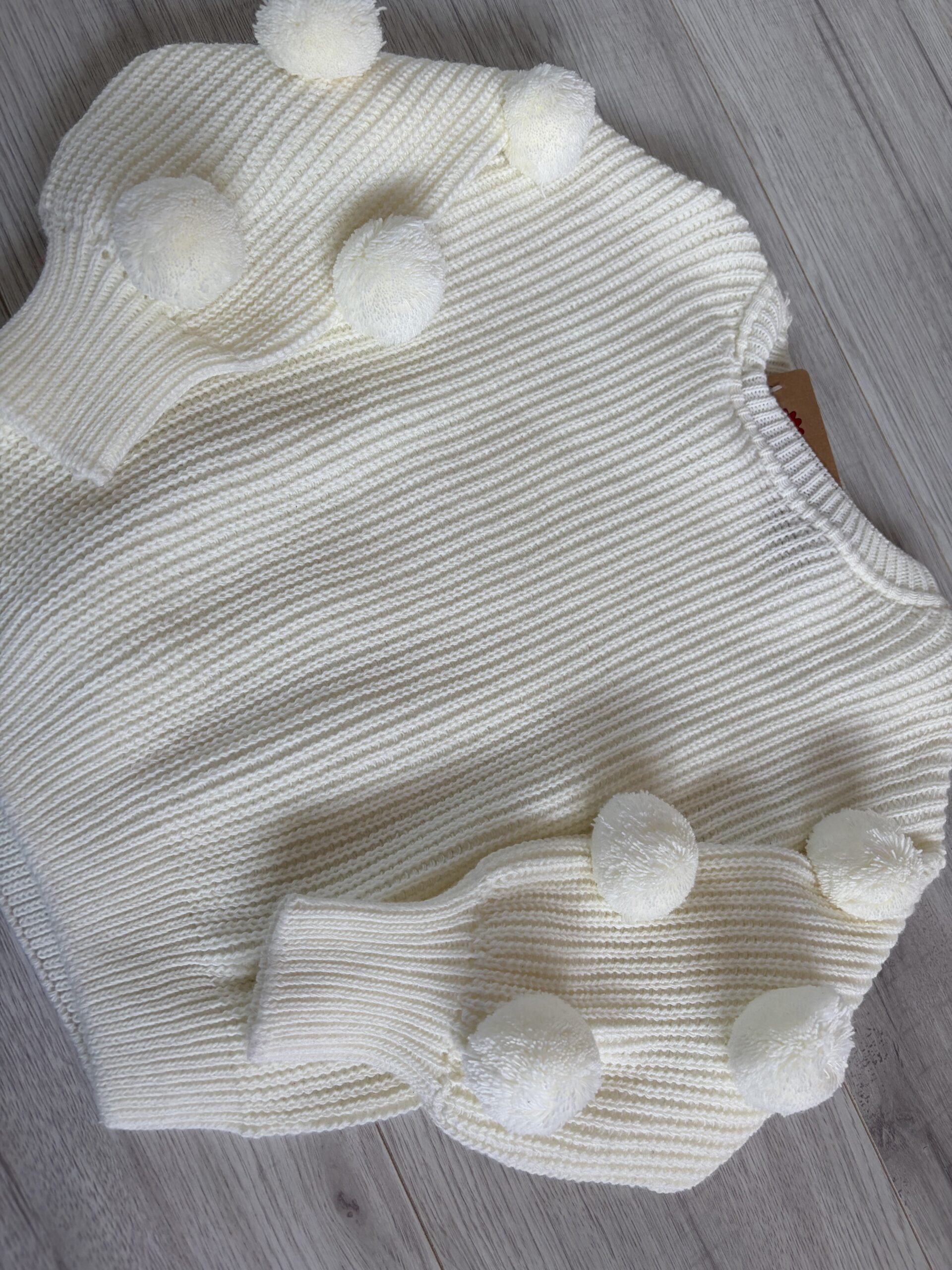 Modny sweter oversize w kolorze śmietankowym z ozdobnymi pomponami na rękawach .