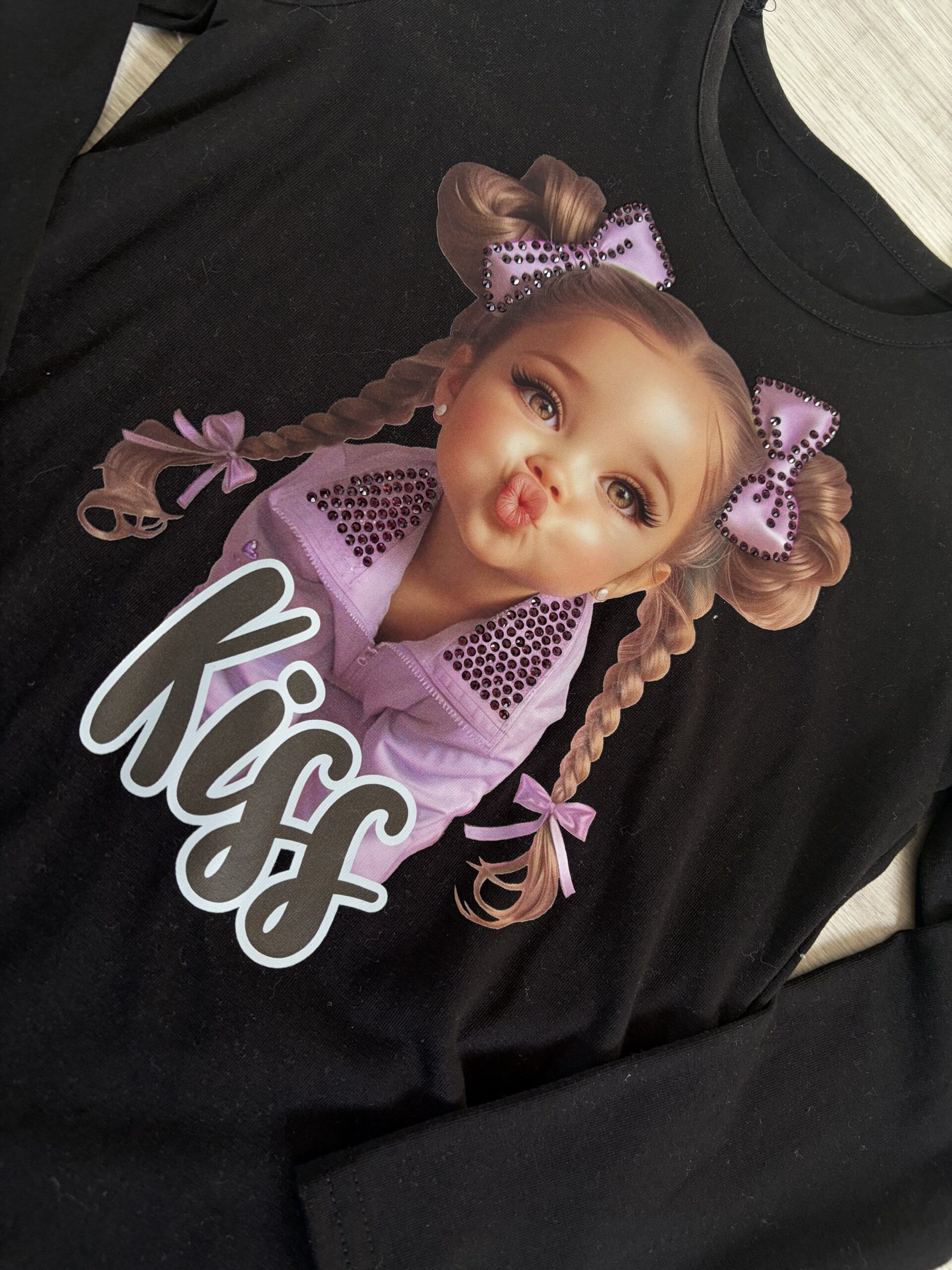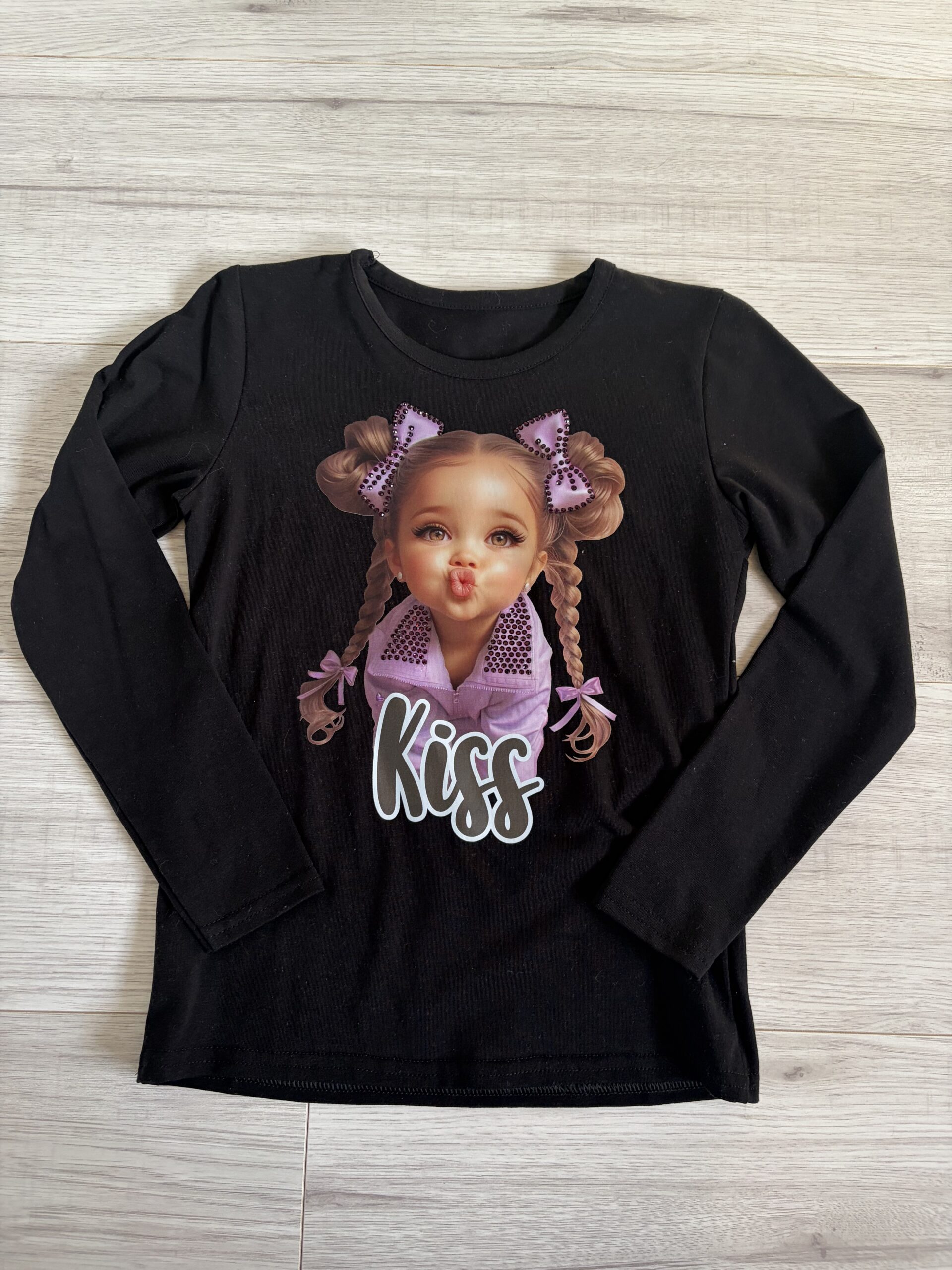 Bawełniana bluzka w czarnym kolorze na długi rękaw z aplikacją słodkiej lali w bardzo modnym kolorze lila z napisem KISS 🙂