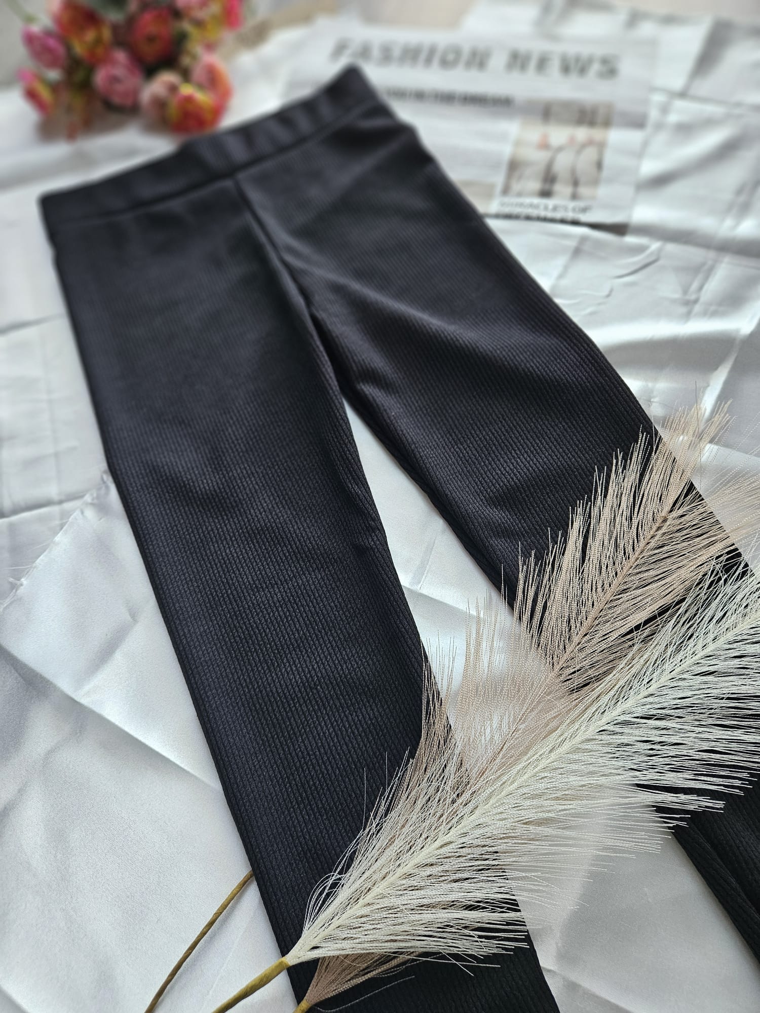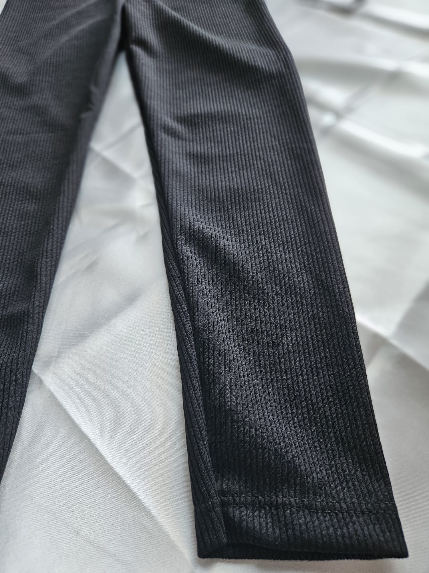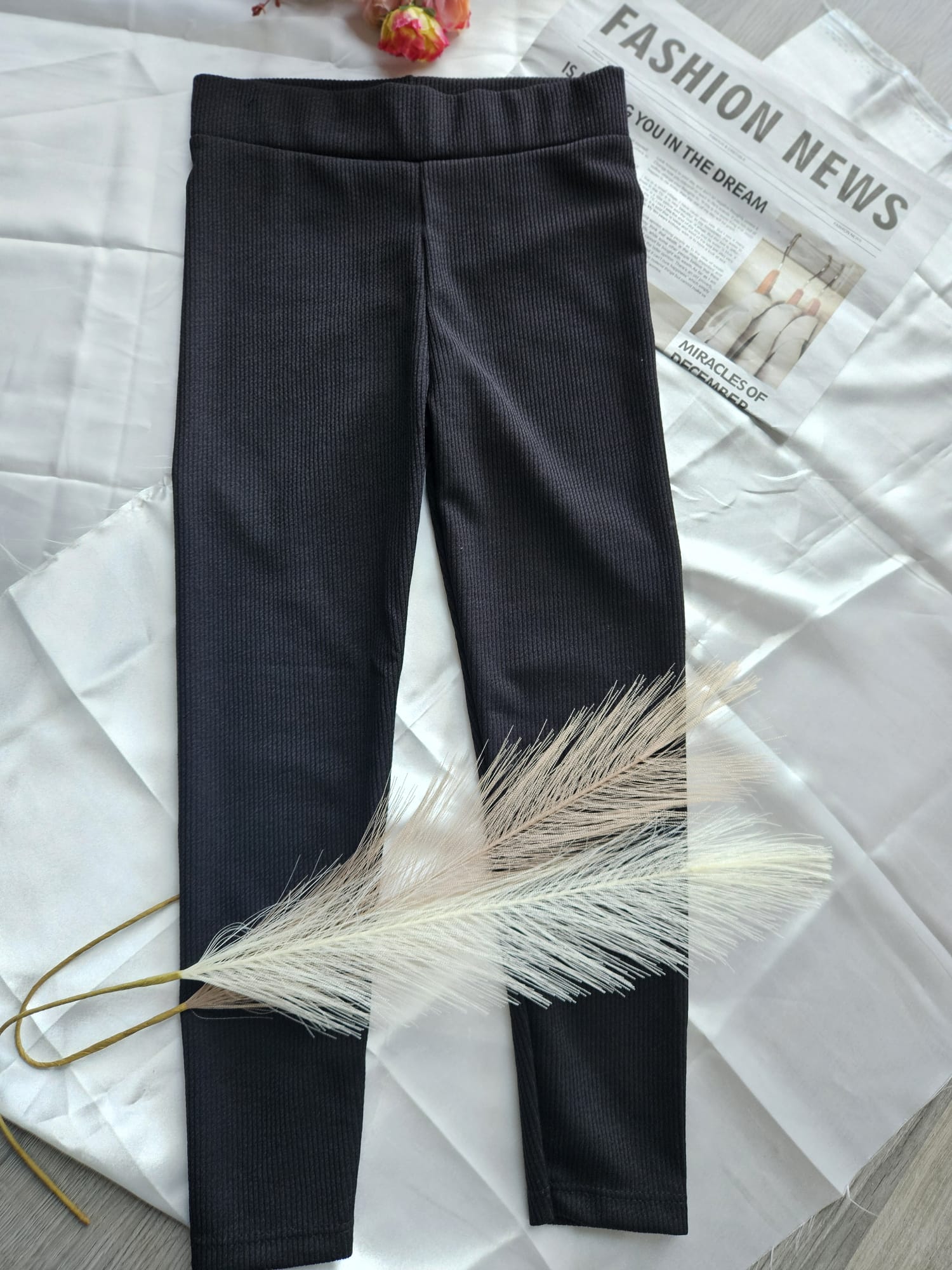 Czarne legginsy dla dziewczynki z materiału w prążek to wygodna i uniwersalna propozycja na co dzień. Elastyczna, prążkowana tkanina dopasowuje się do sylwetki i zapewnia pełną swobodę ruchów. Klasyczny czarny kolor sprawia, że łatwo dopasować je do wielu stylizacji – idealne do szkoły, przedszkola i zabawy. 🖤👧