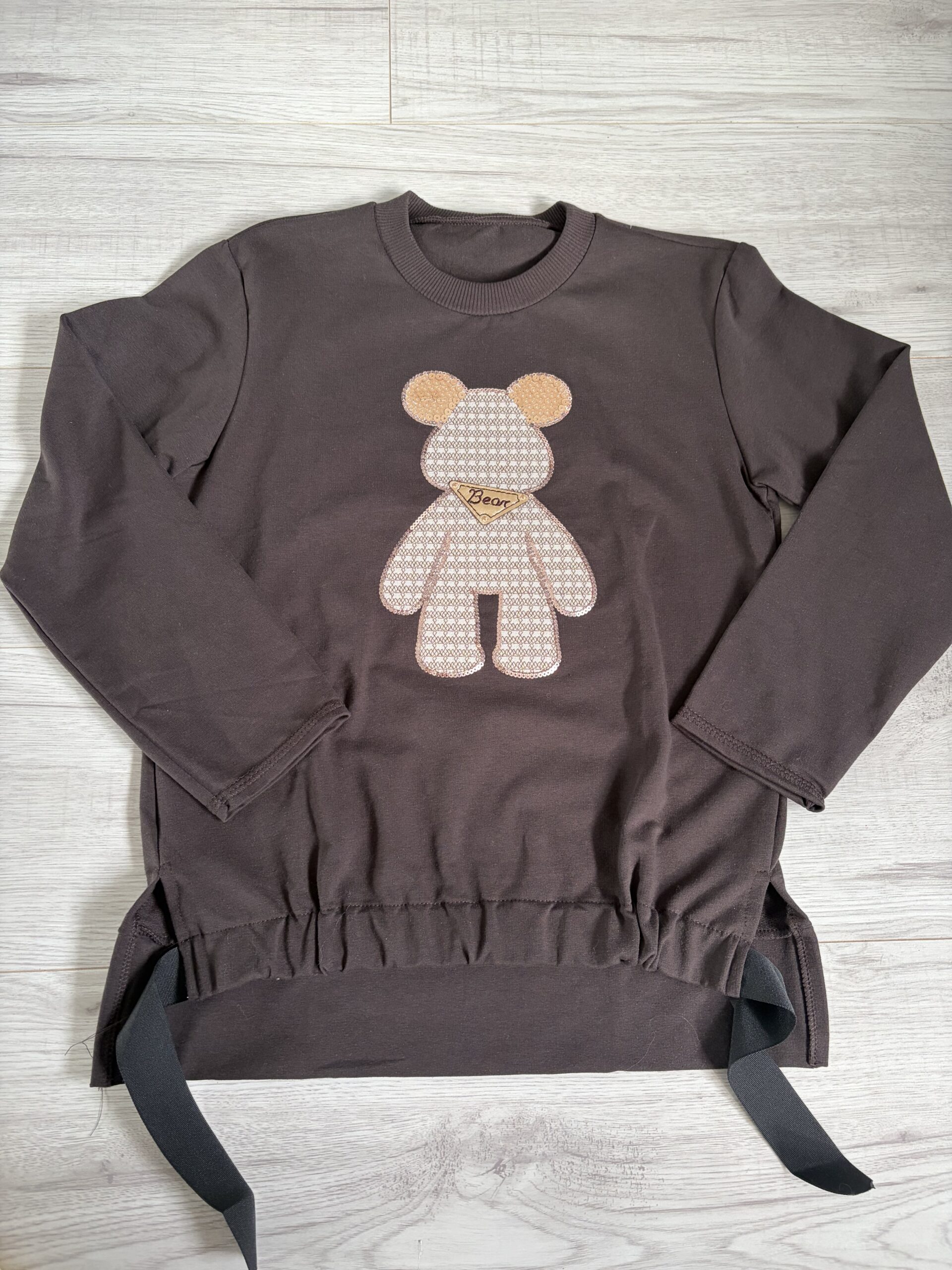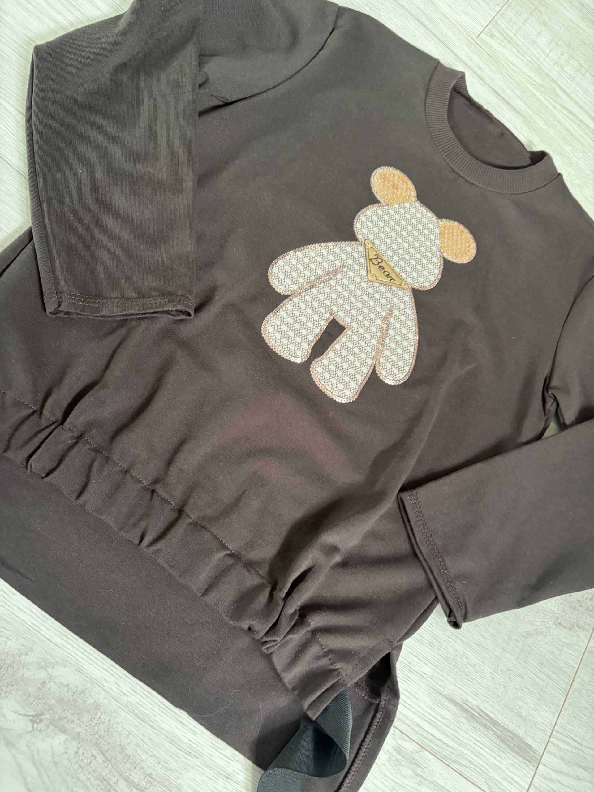 Stylowa, dłuższa bluza dziewczęca w modnym, czekoladowym kolorze. Ozdobiona uroczą aplikacją misia, która nadaje jej wyjątkowego charakteru.