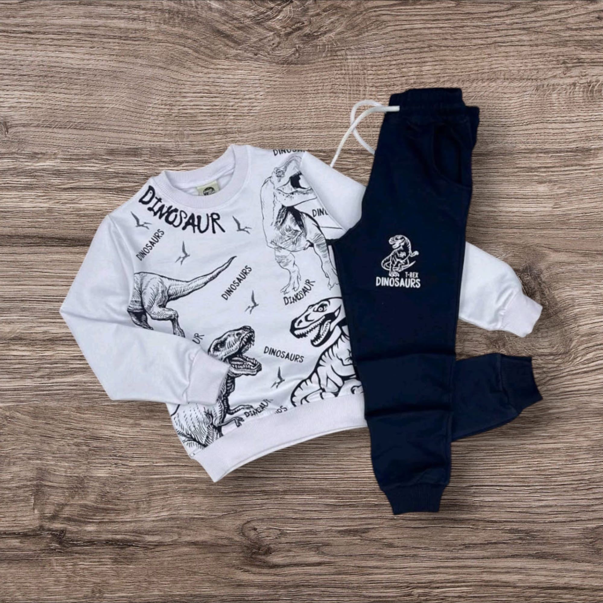Zestaw składa się z białej bluzy z nadrukiem oraz granatowych spodni. Wygodny krój zapewnia komfort i swobodę ruchów – idealny do szkoły, przedszkola oraz codziennej zabawy.