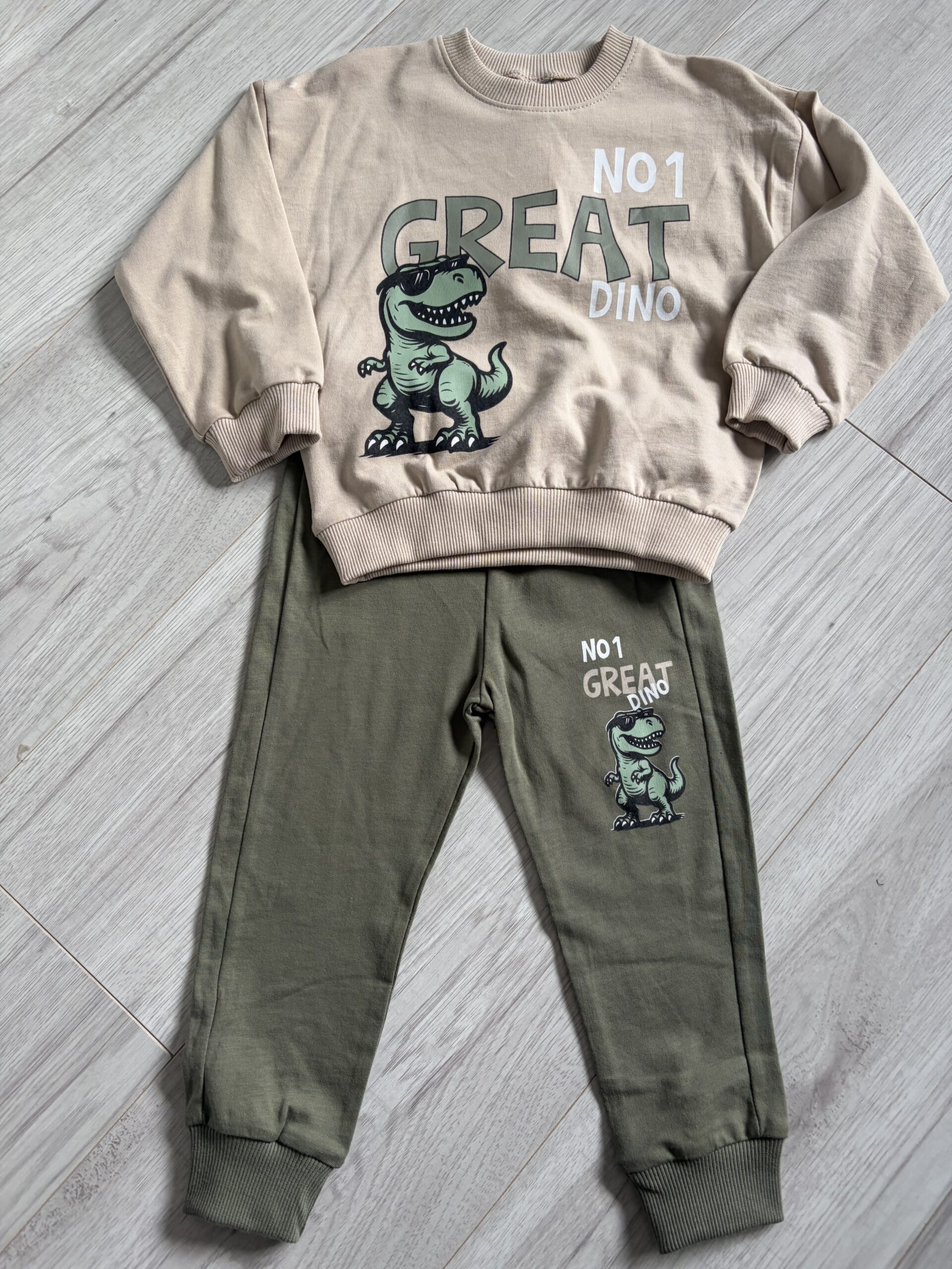 bluza w kolorze beżowym z dinozaurem oraz spodnie w kolorze oliwkowym .