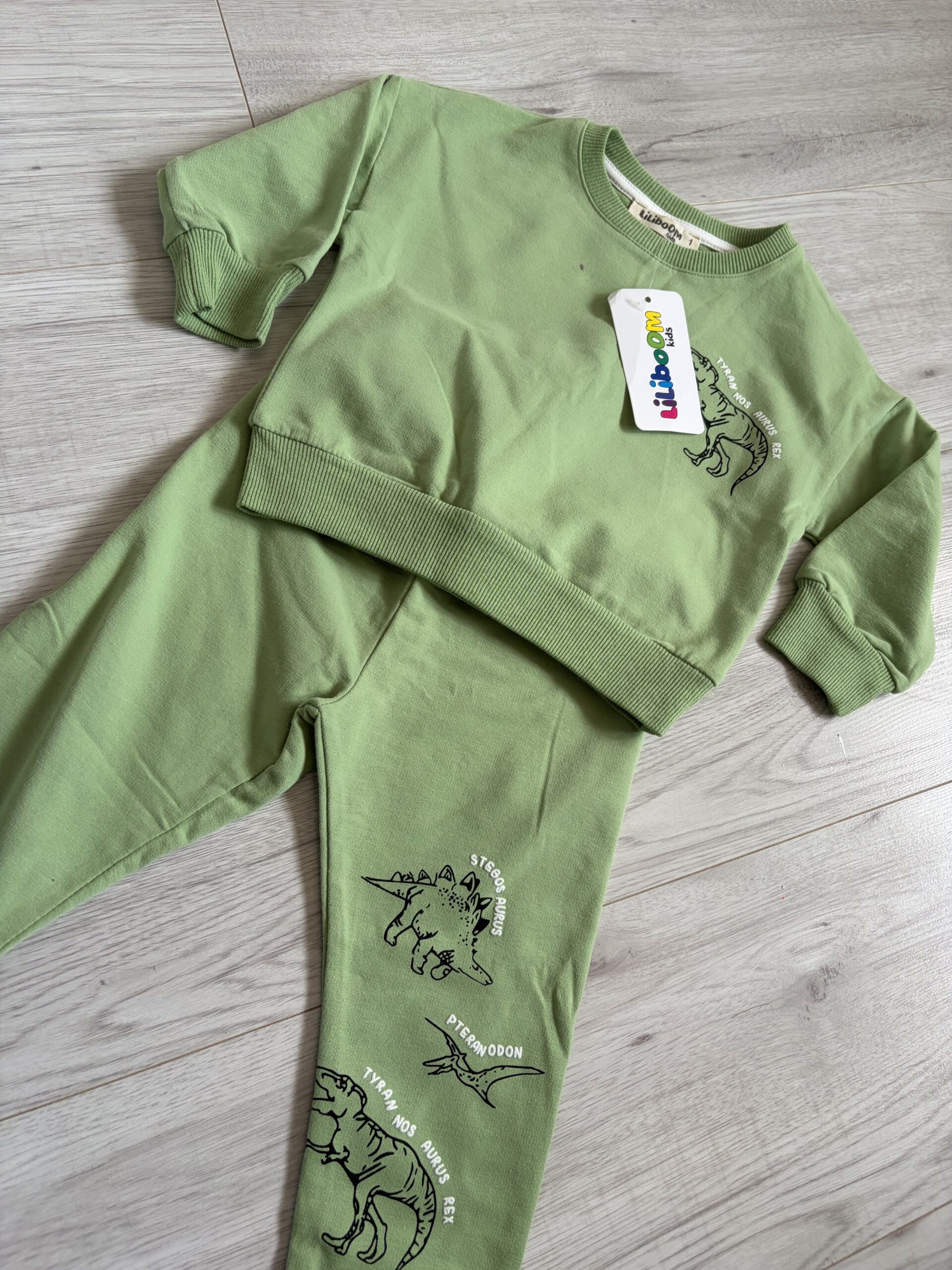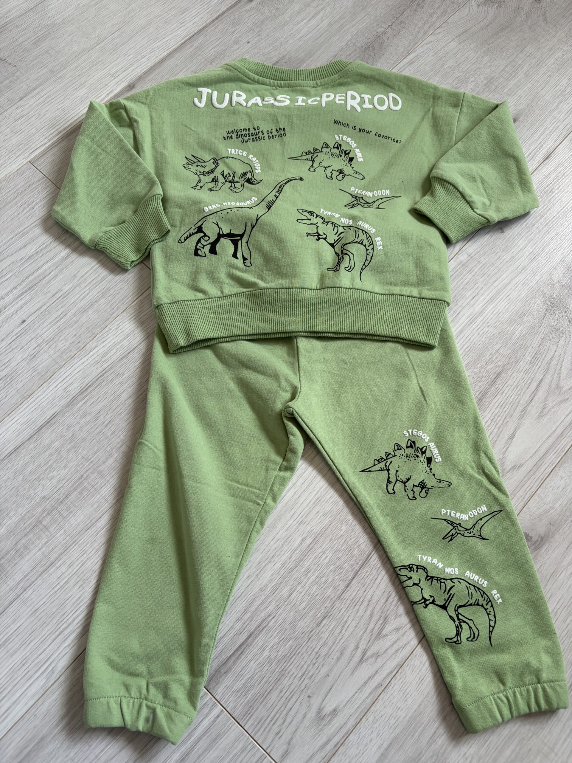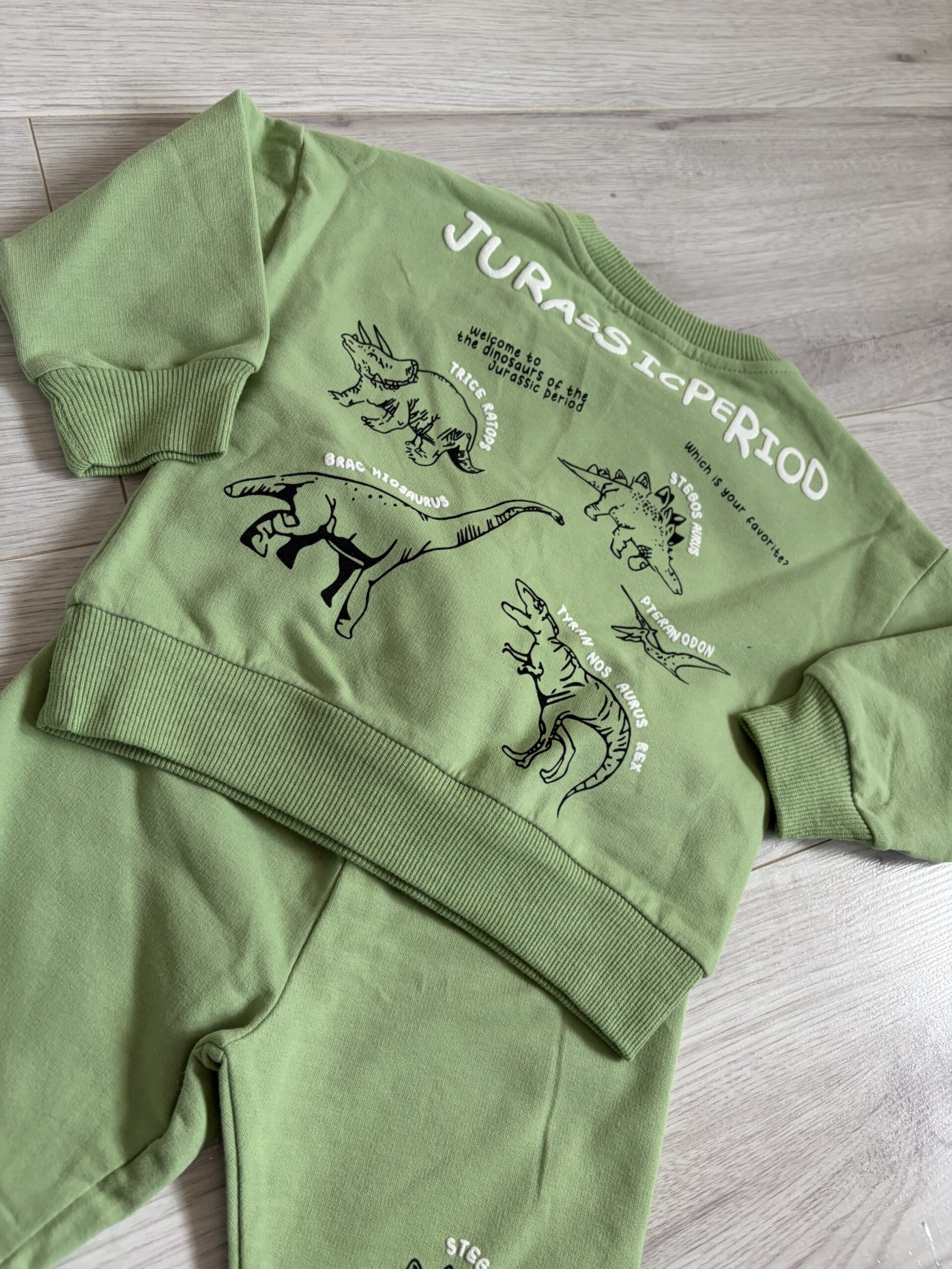 Dresik dla chłopca w kolorze zielonym , z aplikacjami dinozaurów .