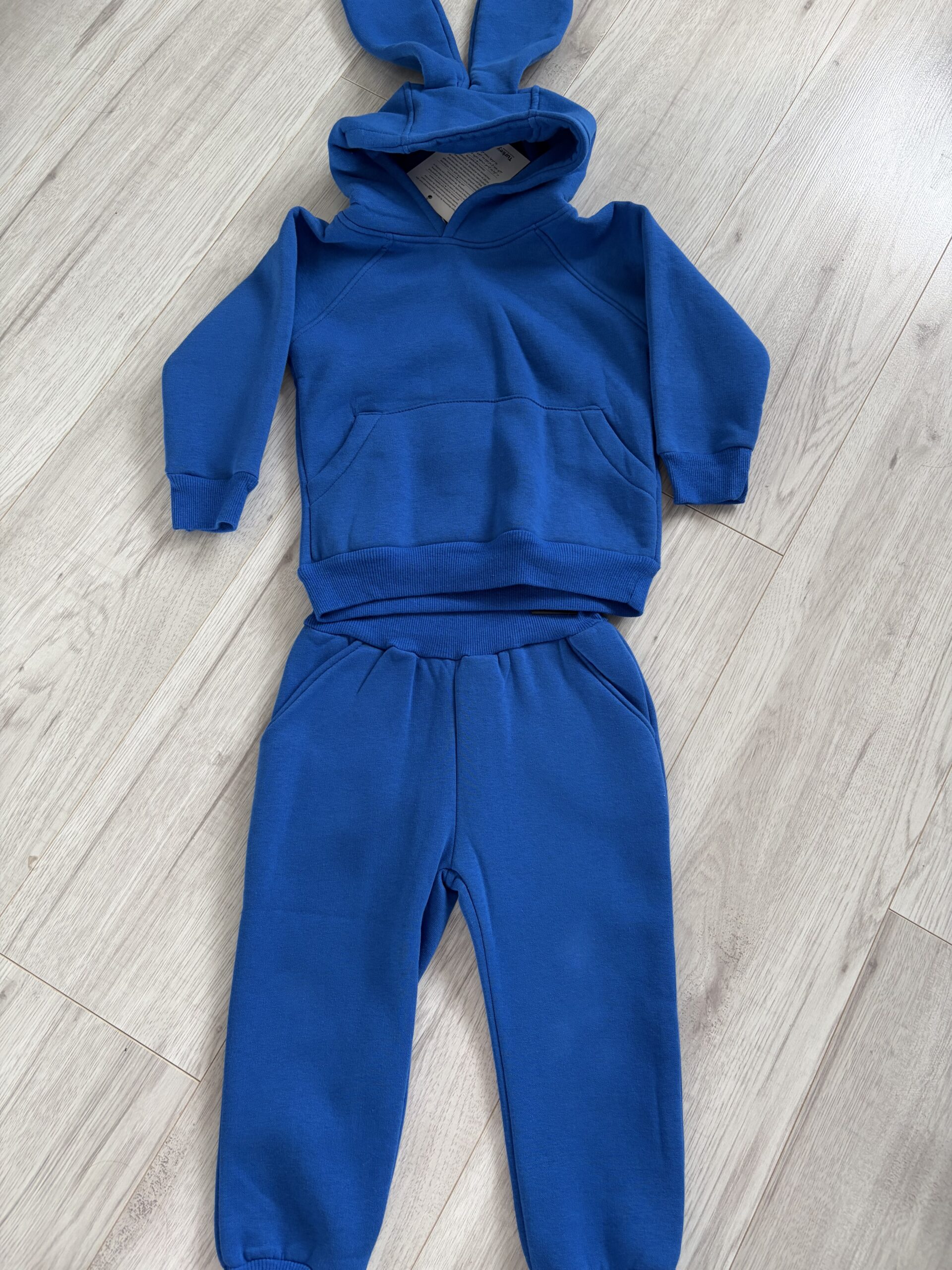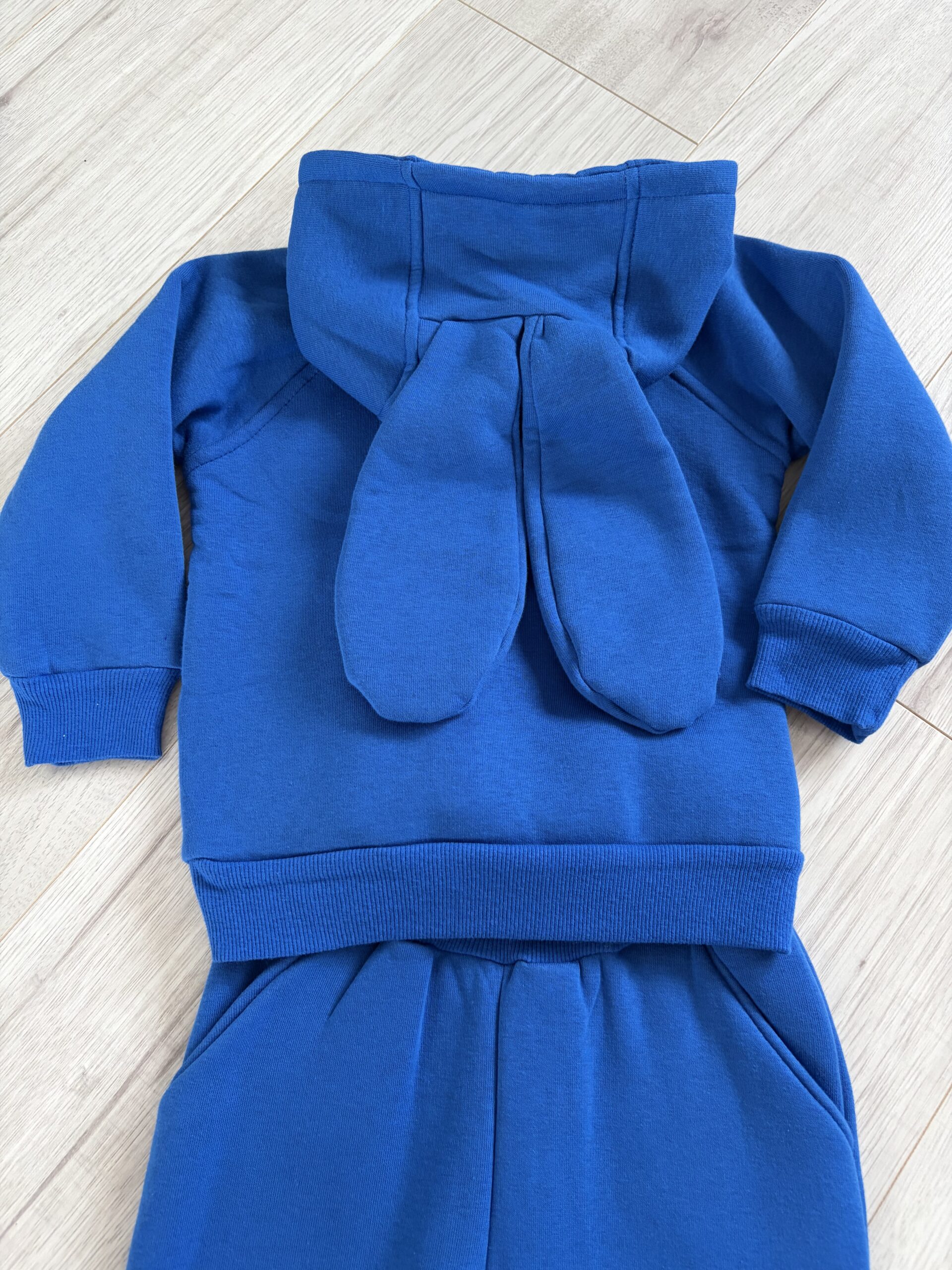 Piękny dres w niebieskim kolorze z kieszenią z przodu oraz kapturem z długimi uszami który tworzy oryginalny komplet .