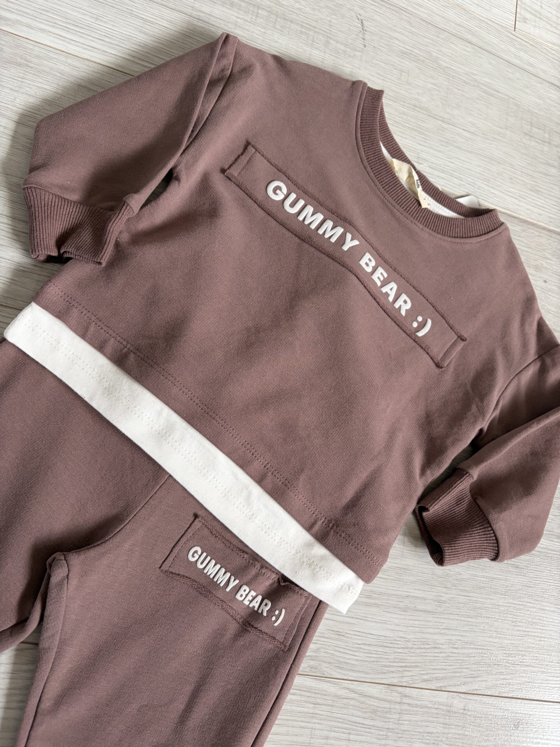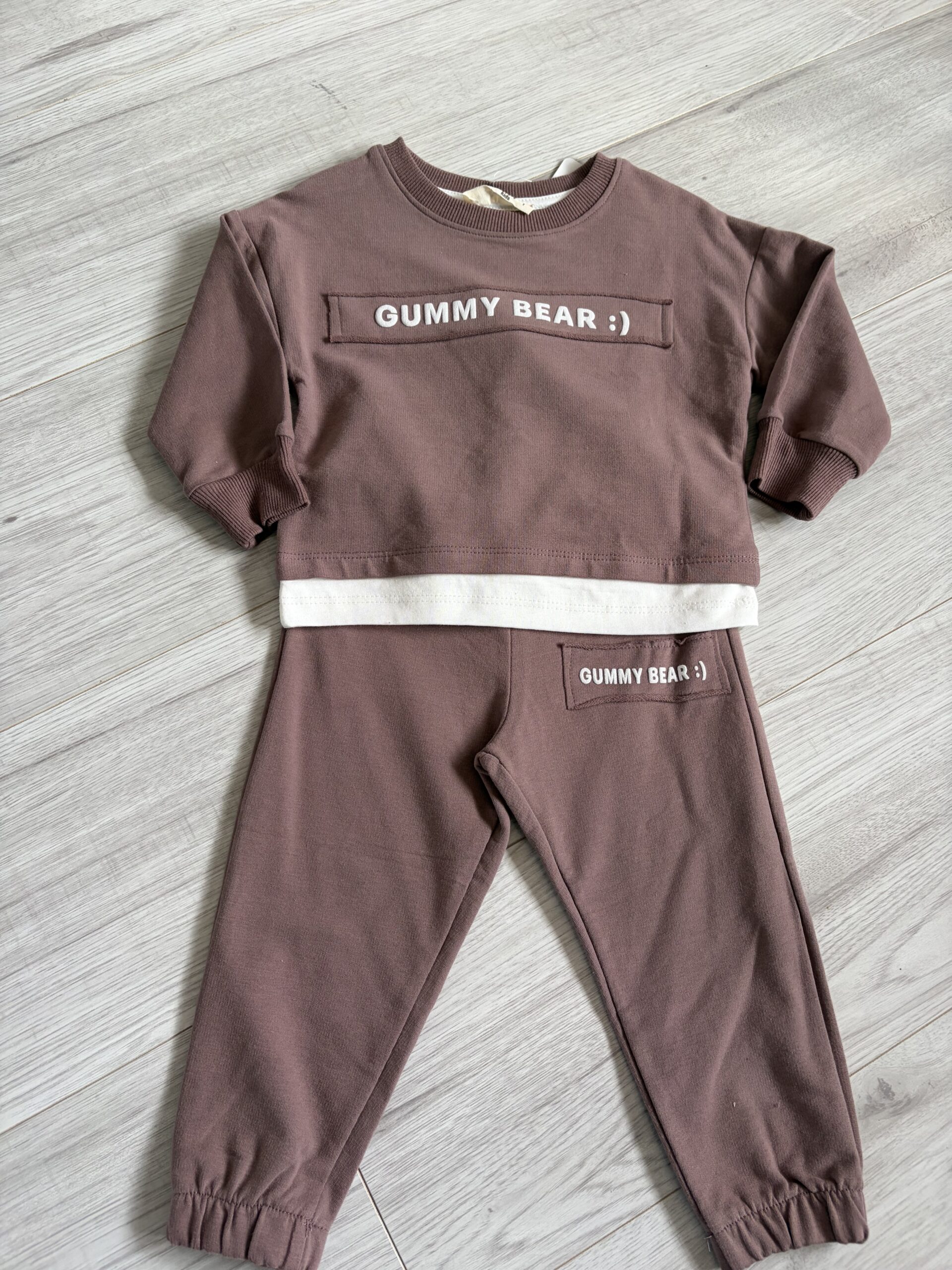 Milutki dresik dla maluszka w modnym kolorze czekoladowym. Bluza wykończona na biało, spodnie ze ściągaczem.