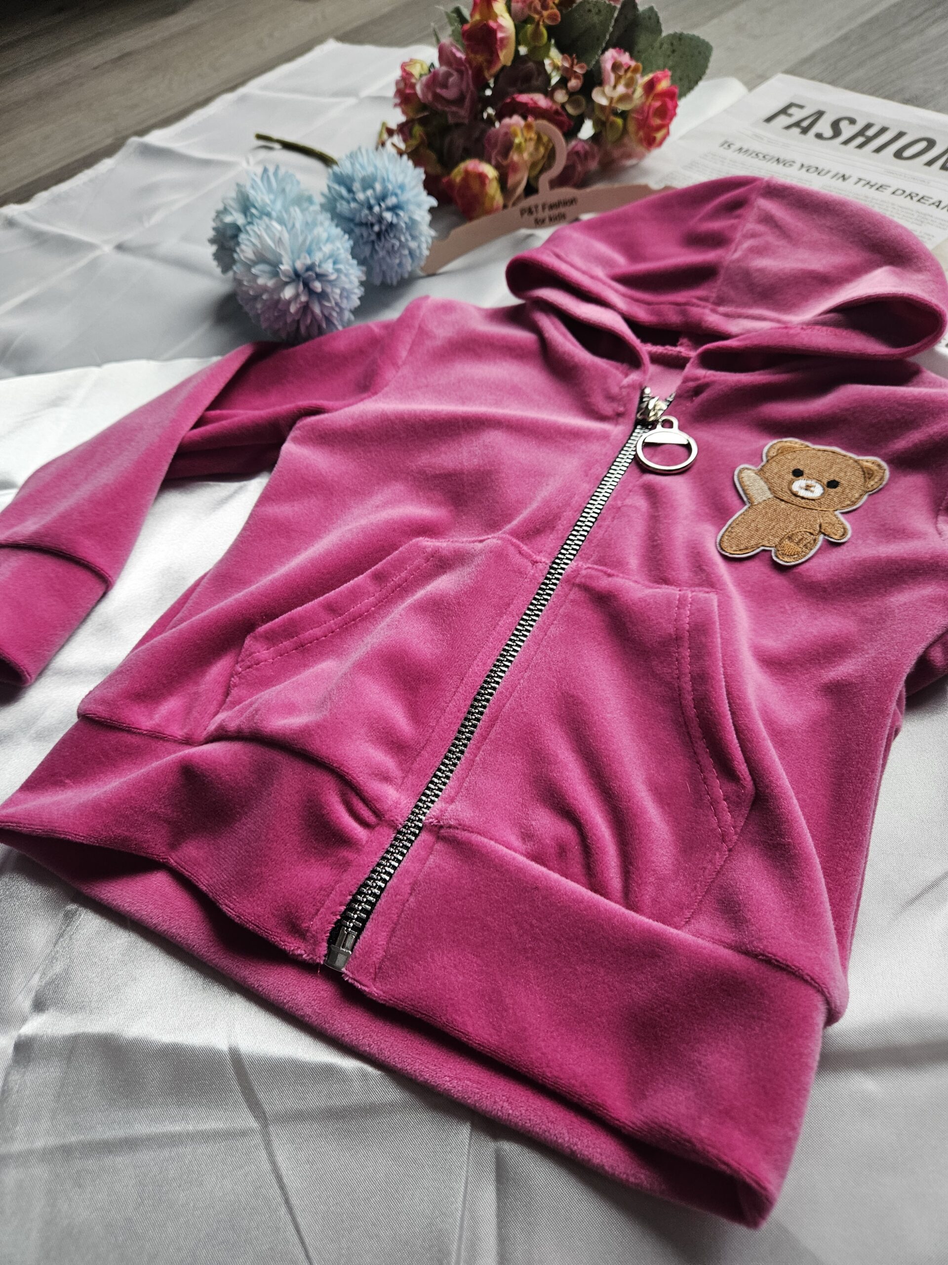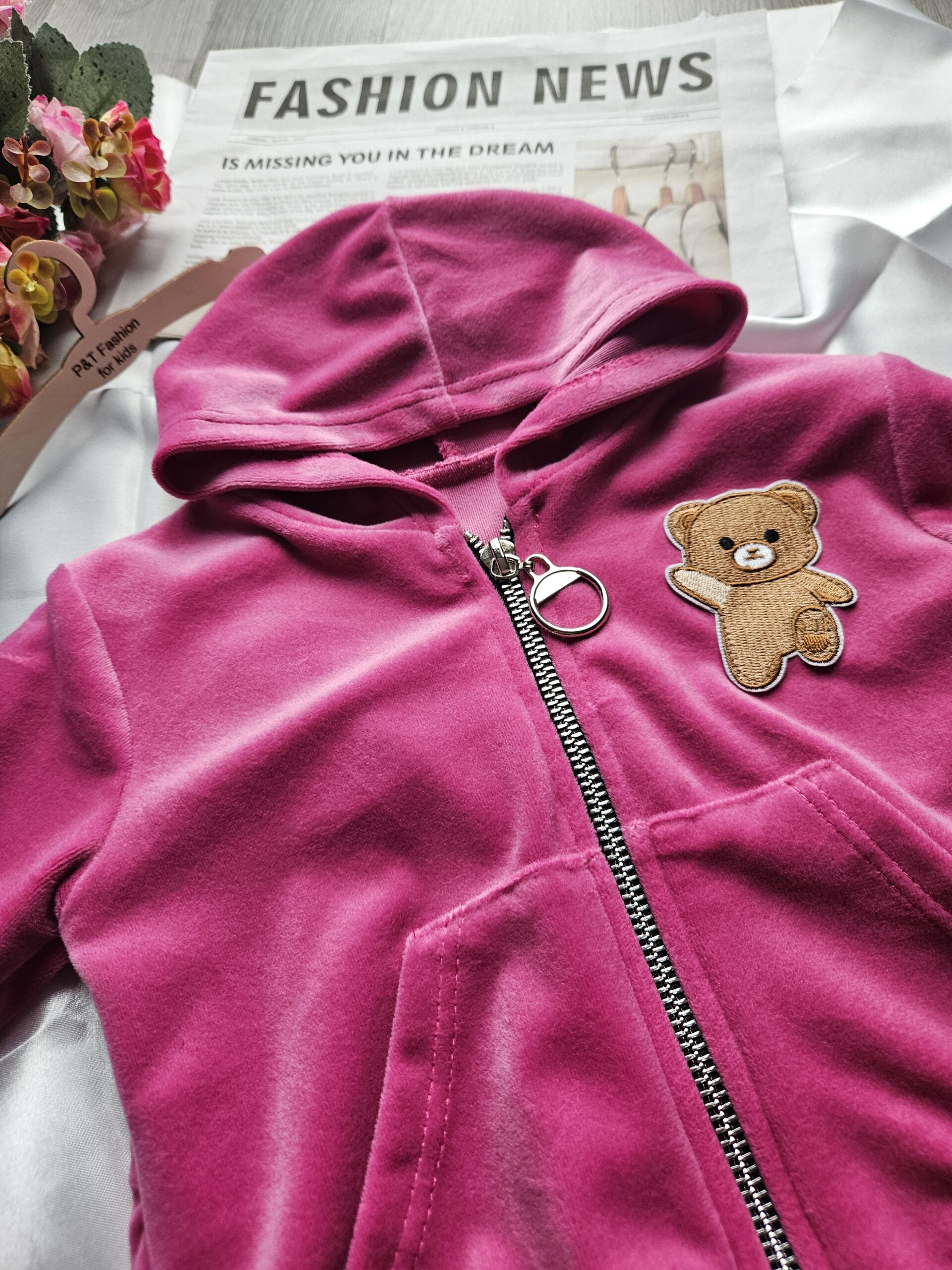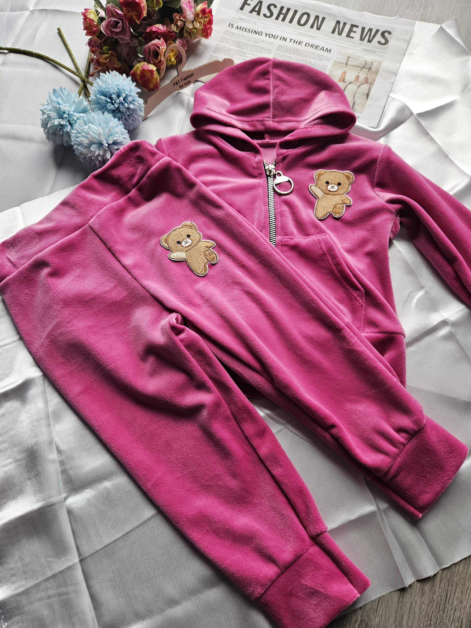 Stylowy i wygodny dres dziewczęcy w modnym różowym kolorze.