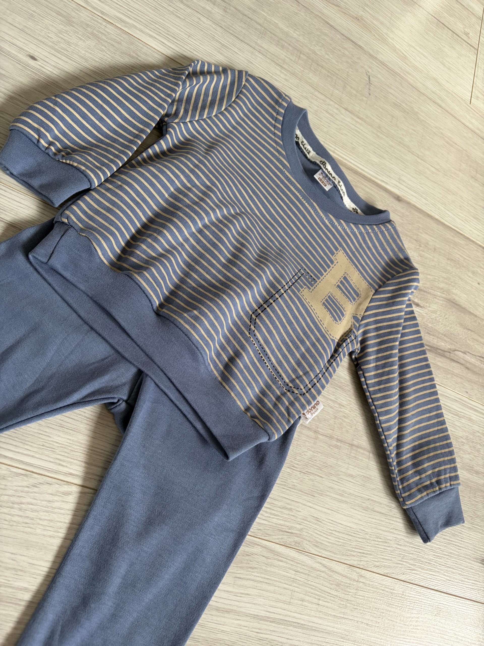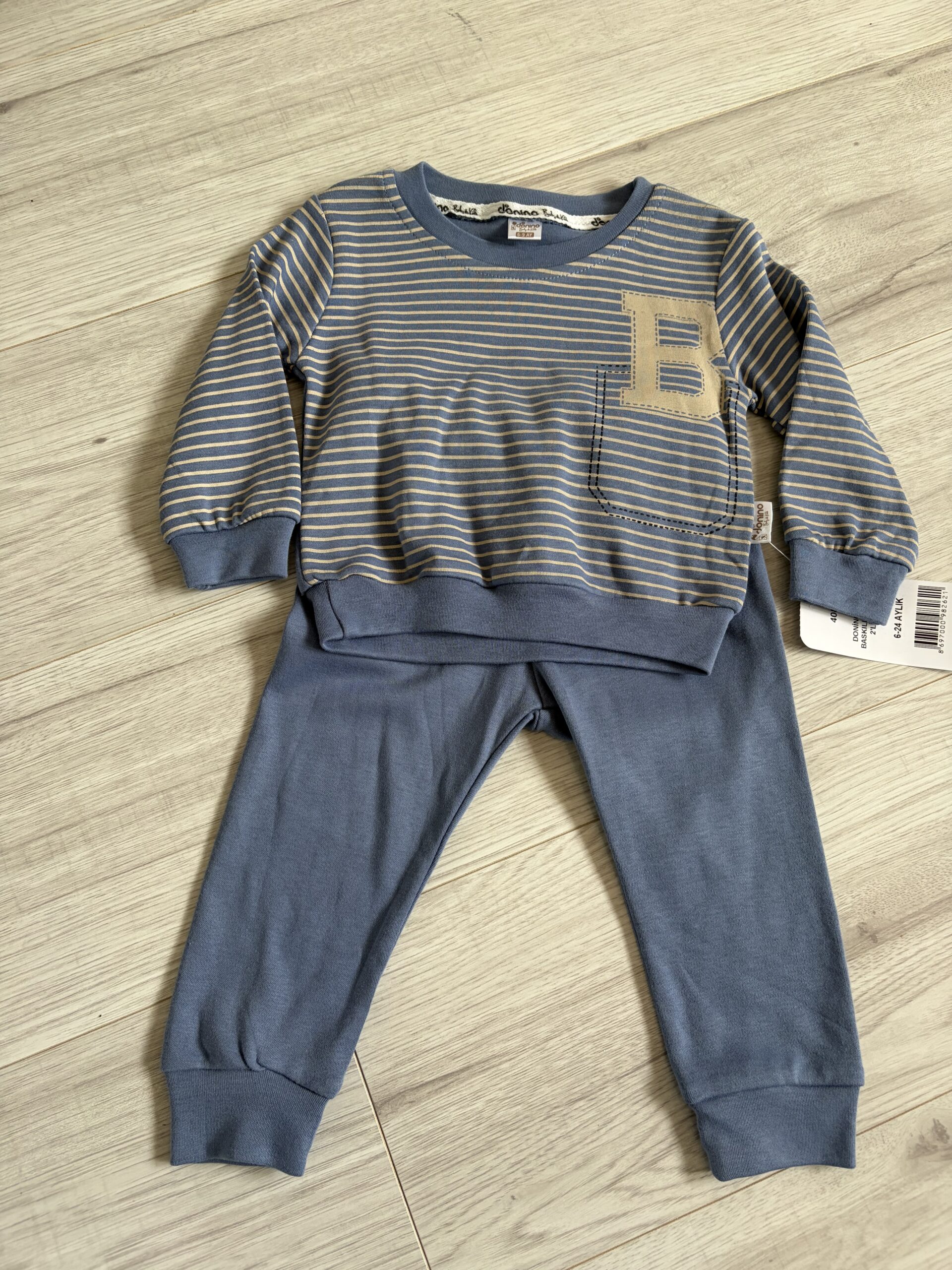 Dresik dla maluszka w niebieskim kolorze . Bluza w paski , spodnie gładkie.