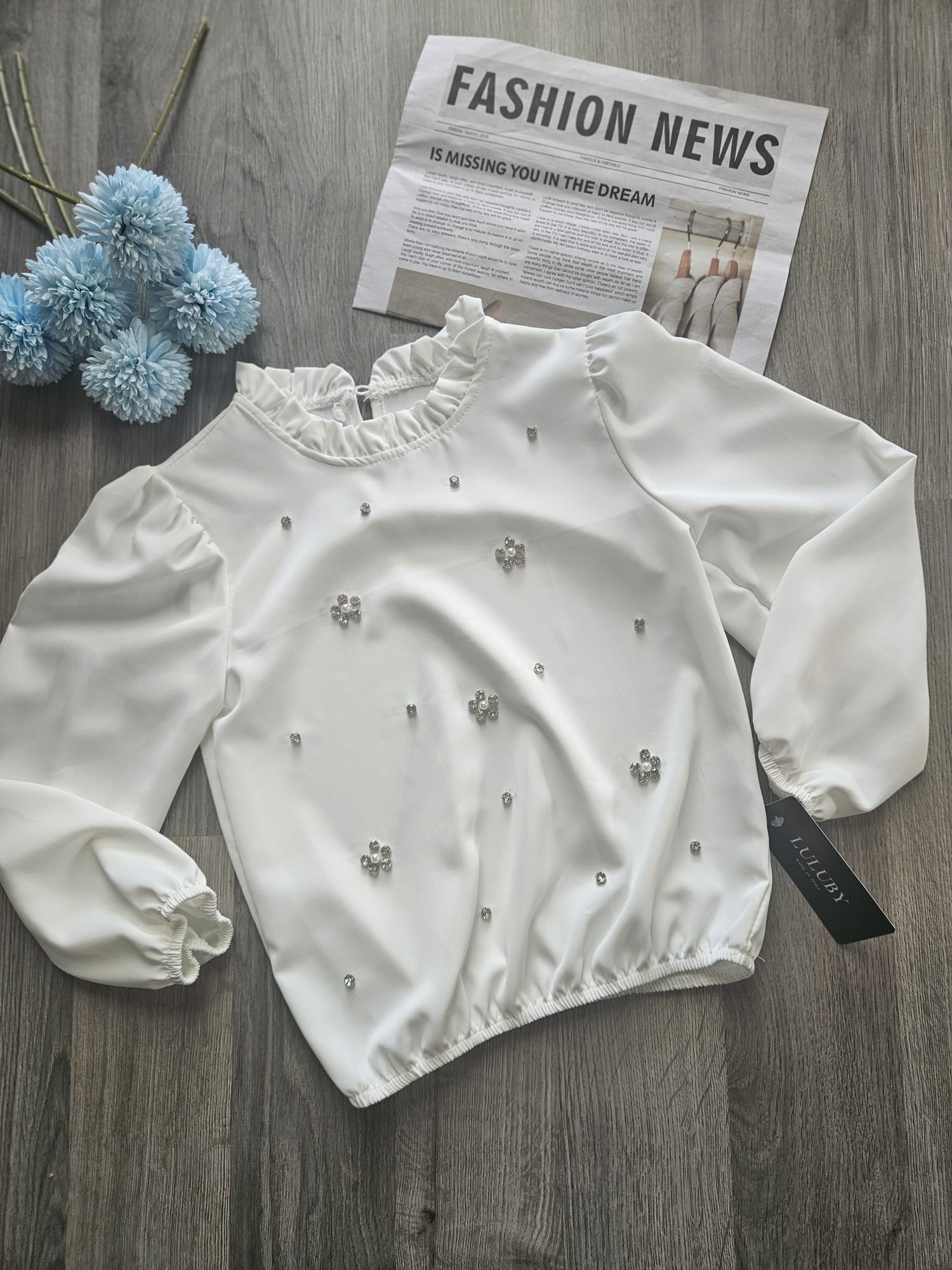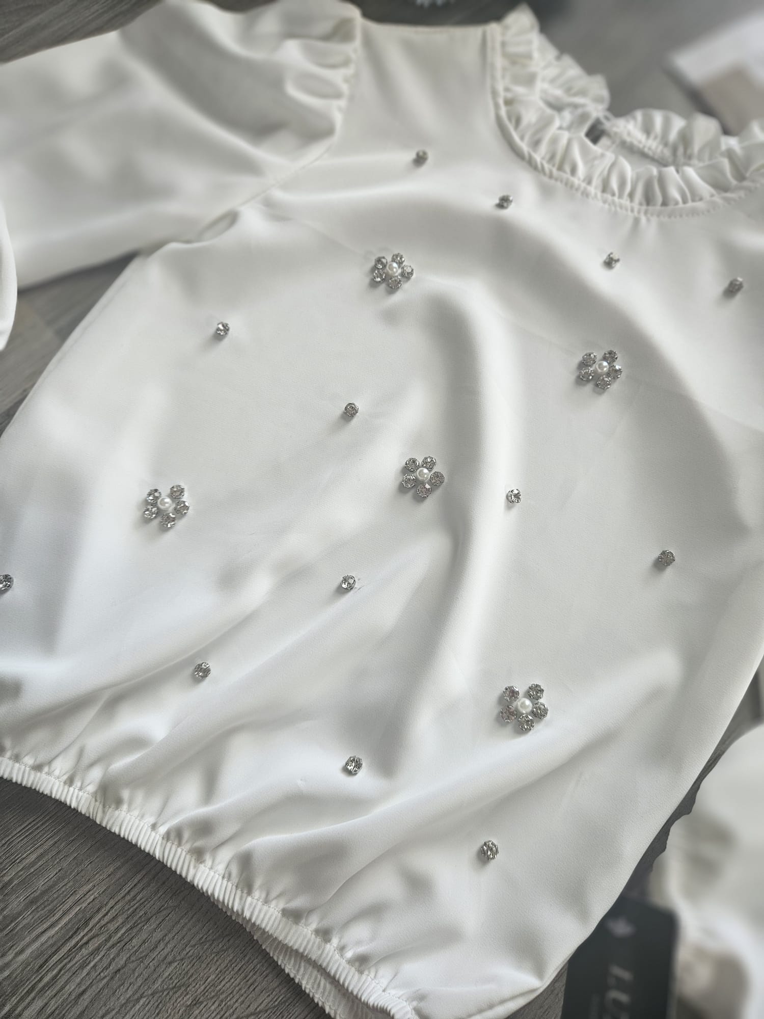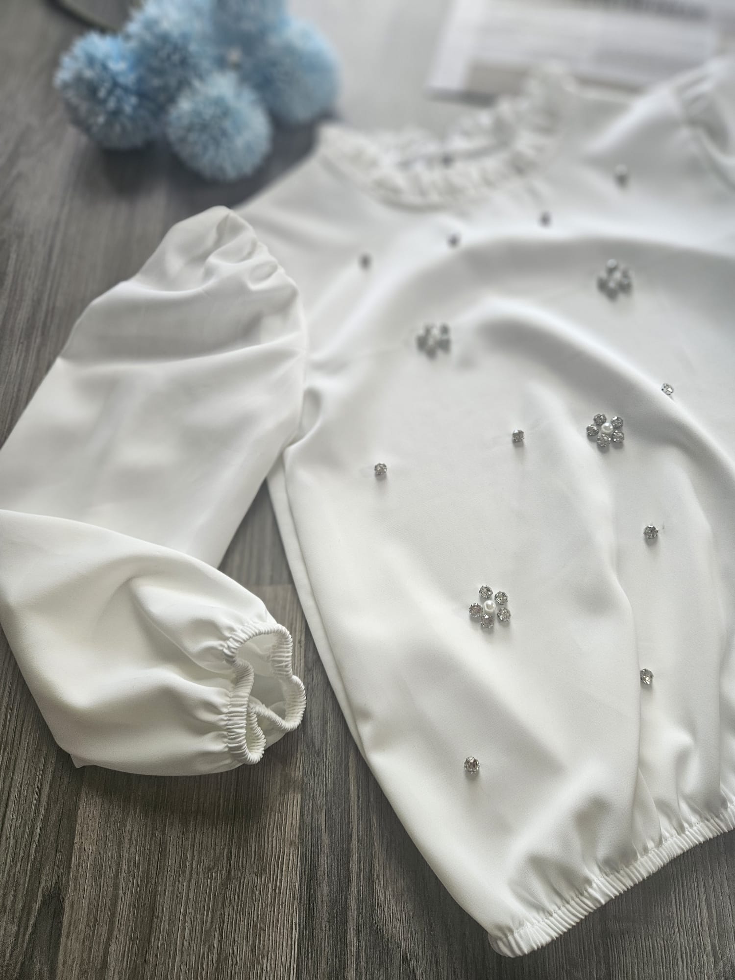 Elegancka biała bluzka dla dziewczynki zakładana przez głowę, idealna na wyjątkowe okazje. Przód zdobią subtelne ozdoby, które nadają jej stylowego charakteru. Rękawy zakończone elastyczną gumką zapewniają wygodę i doskonałe dopasowanie.