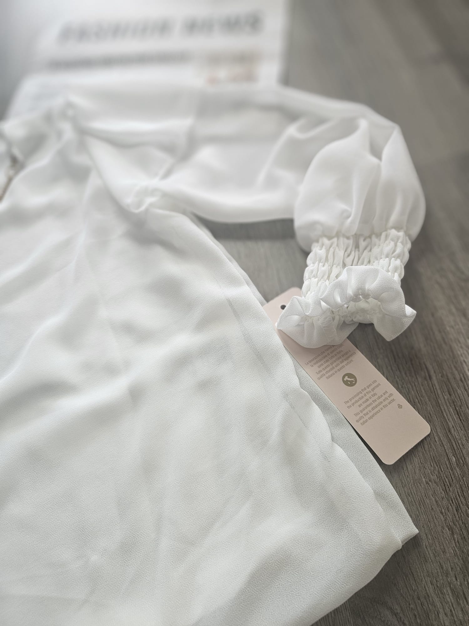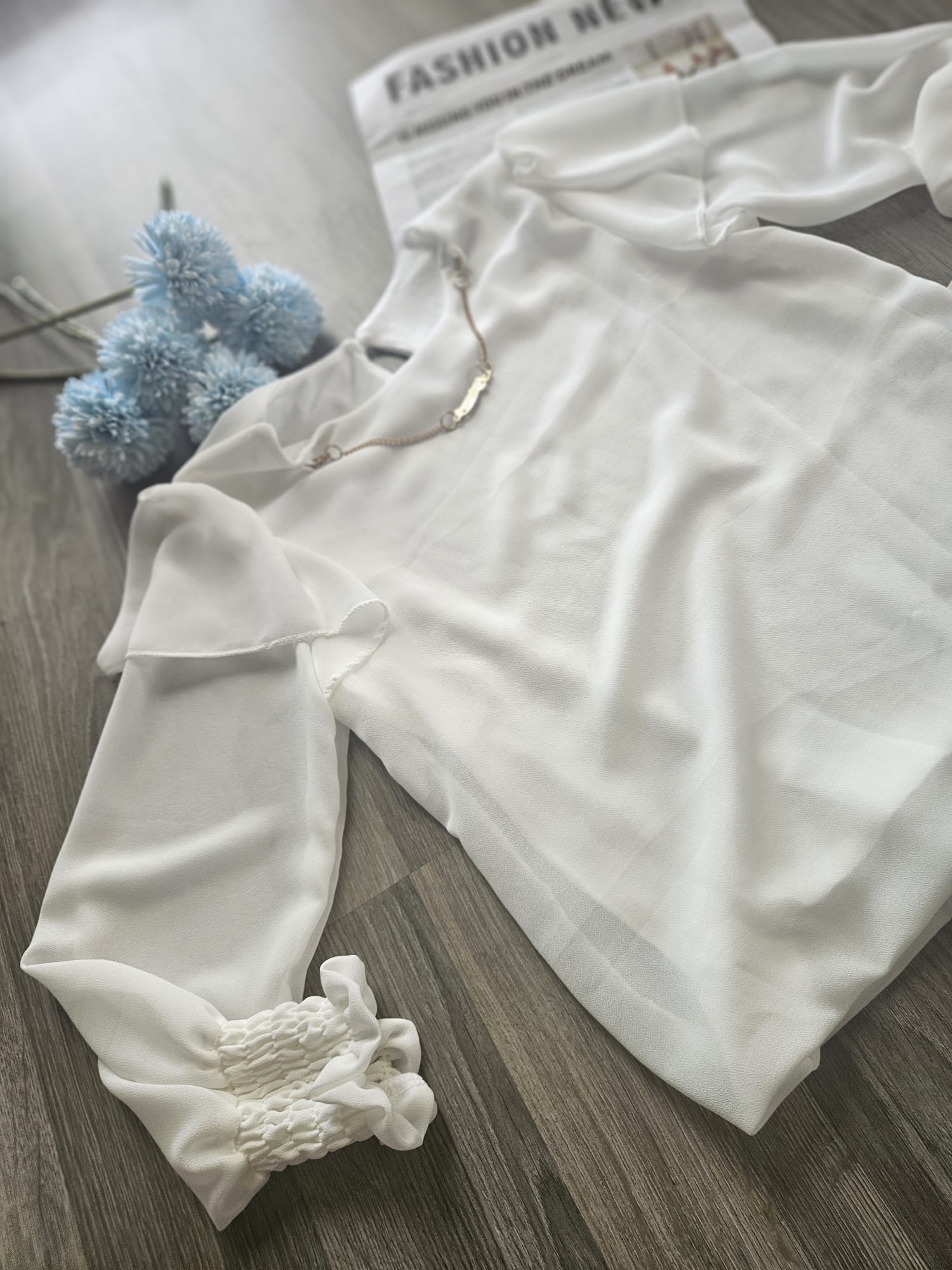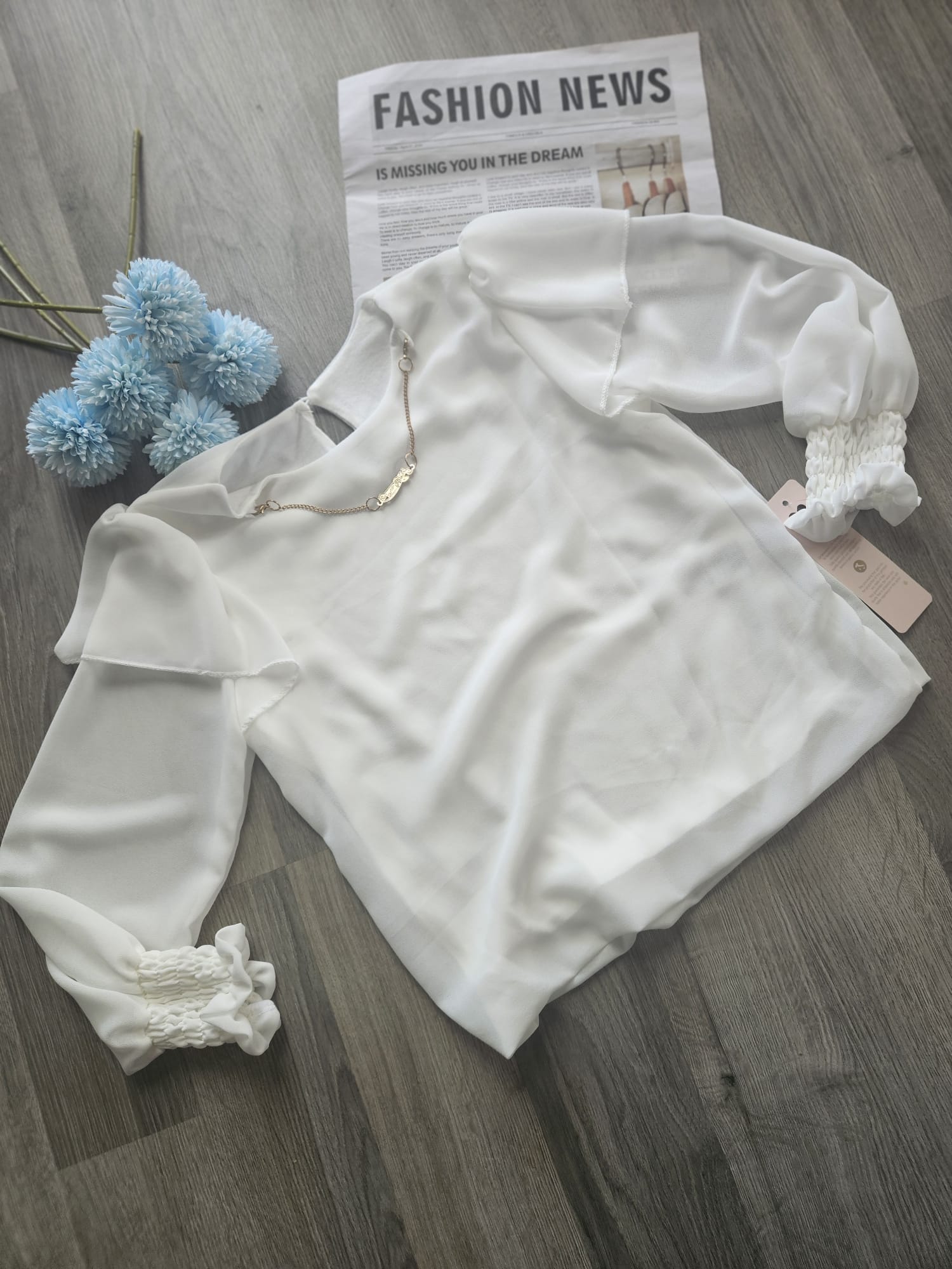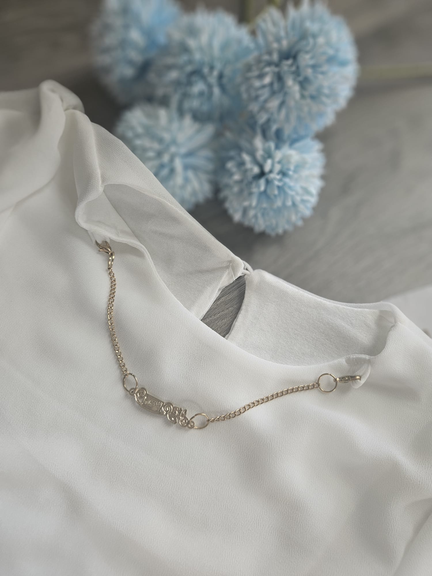 Elegancka biała bluzka dla dziewczynki o wyjątkowym wykończeniu. Na przodzie znajduje się ozdobny, odpinany łańcuszek, który dodaje stylowego charakteru. Rękawy zakończone są elastyczną gumką, zapewniając wygodę i idealne dopasowanie. Idealna na specjalne okazje i eleganckie stylizacje.
