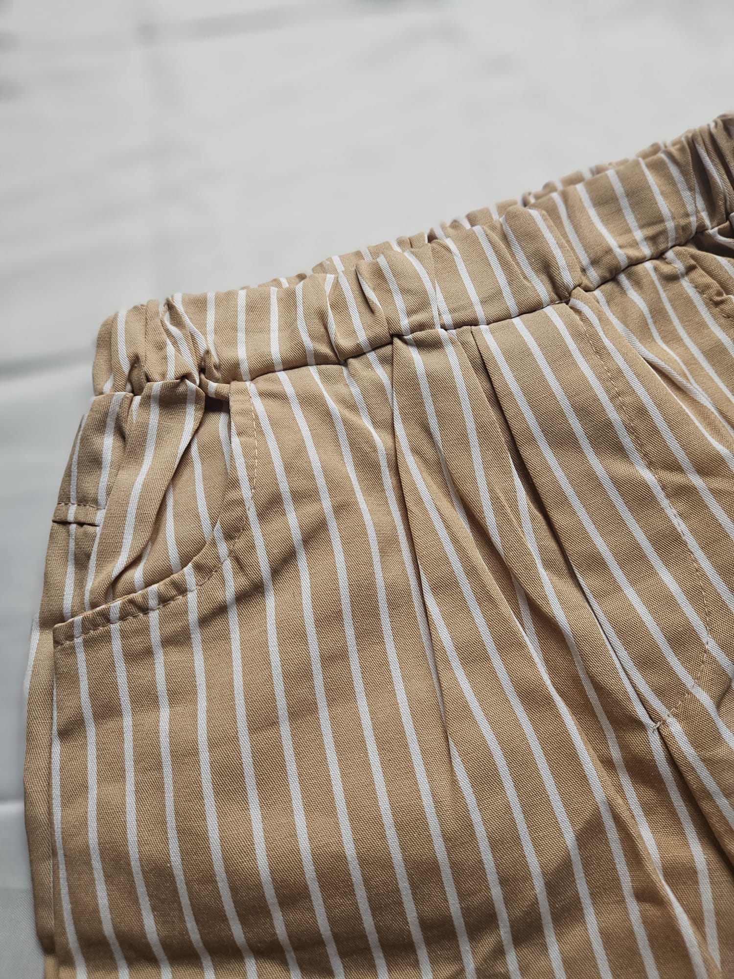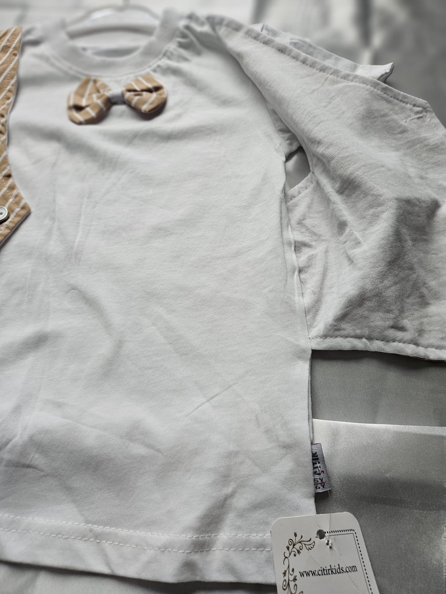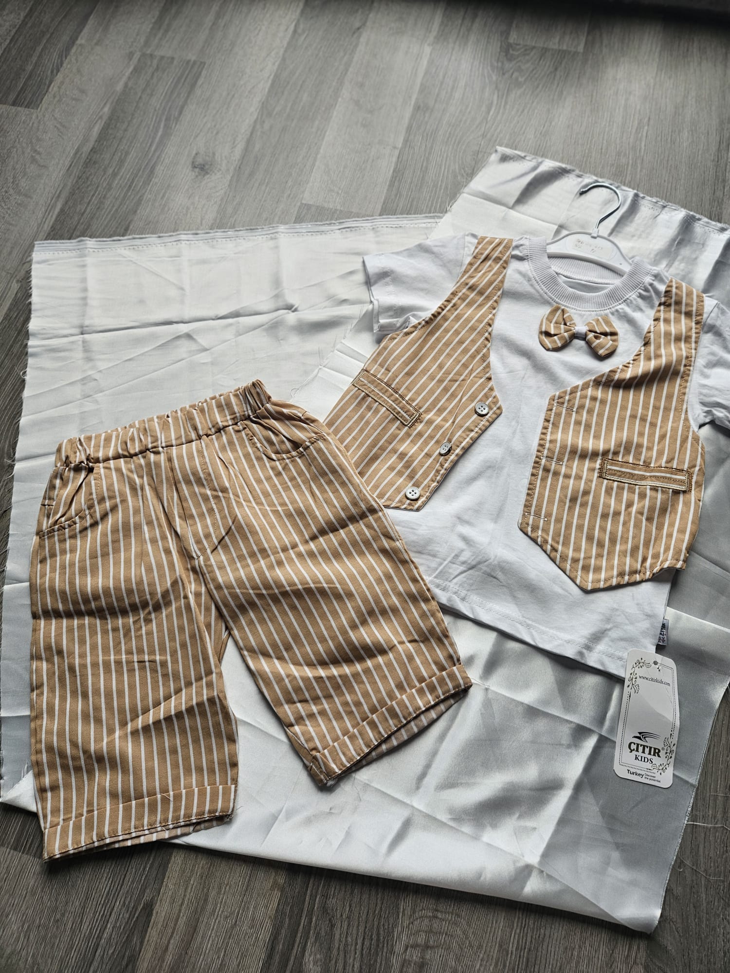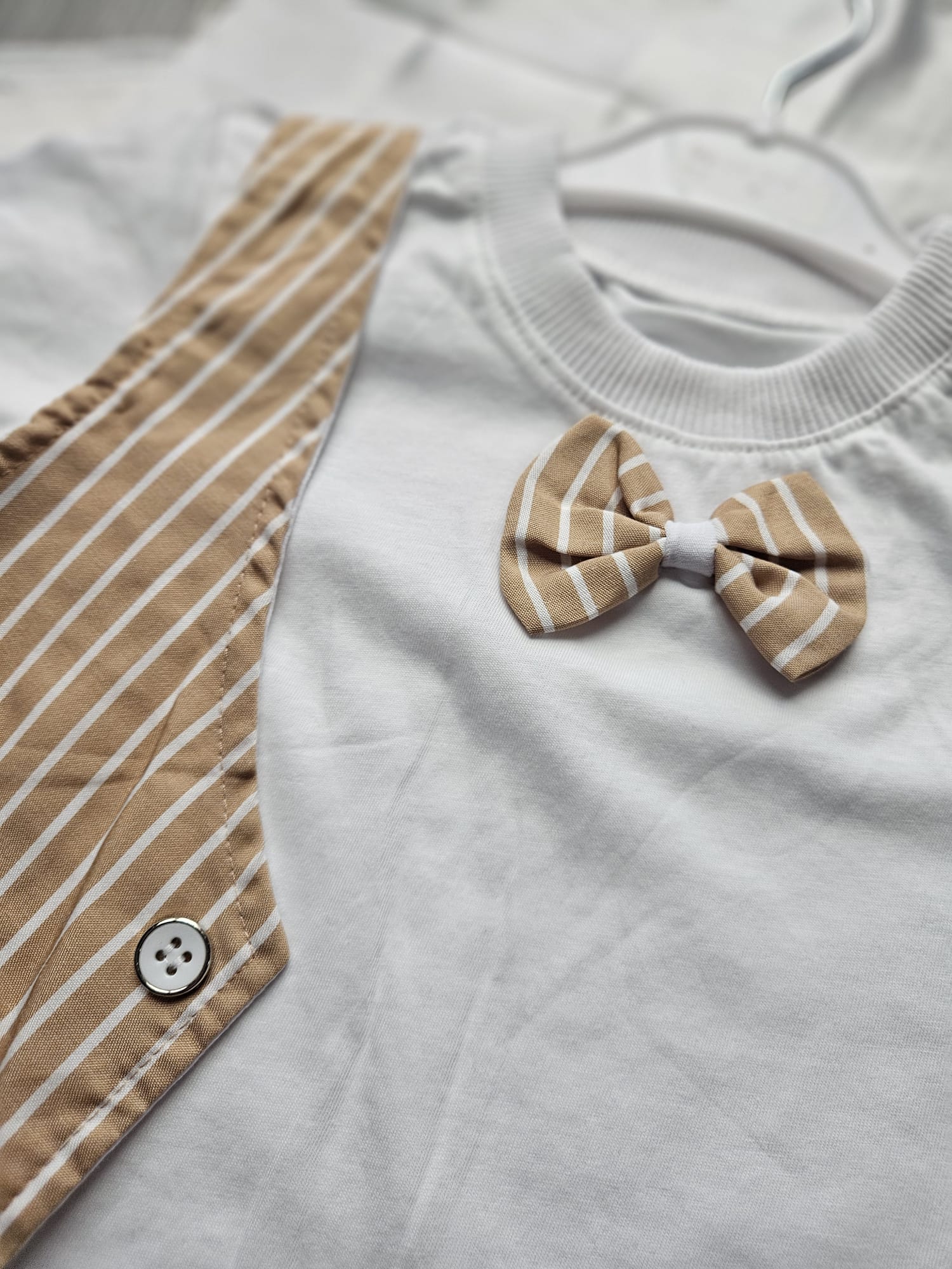 Koszulka z doszytą kamizelką i muszką nadaje wyjątkowego, szykownego wyglądu, a spodenki z gumką w pasie i kieszeniami zapewniają komfort noszenia. Paski na kamizelce i spodenkach dodają całości modnego charakteru – idealny wybór na uroczystości i letnie okazje! ✨