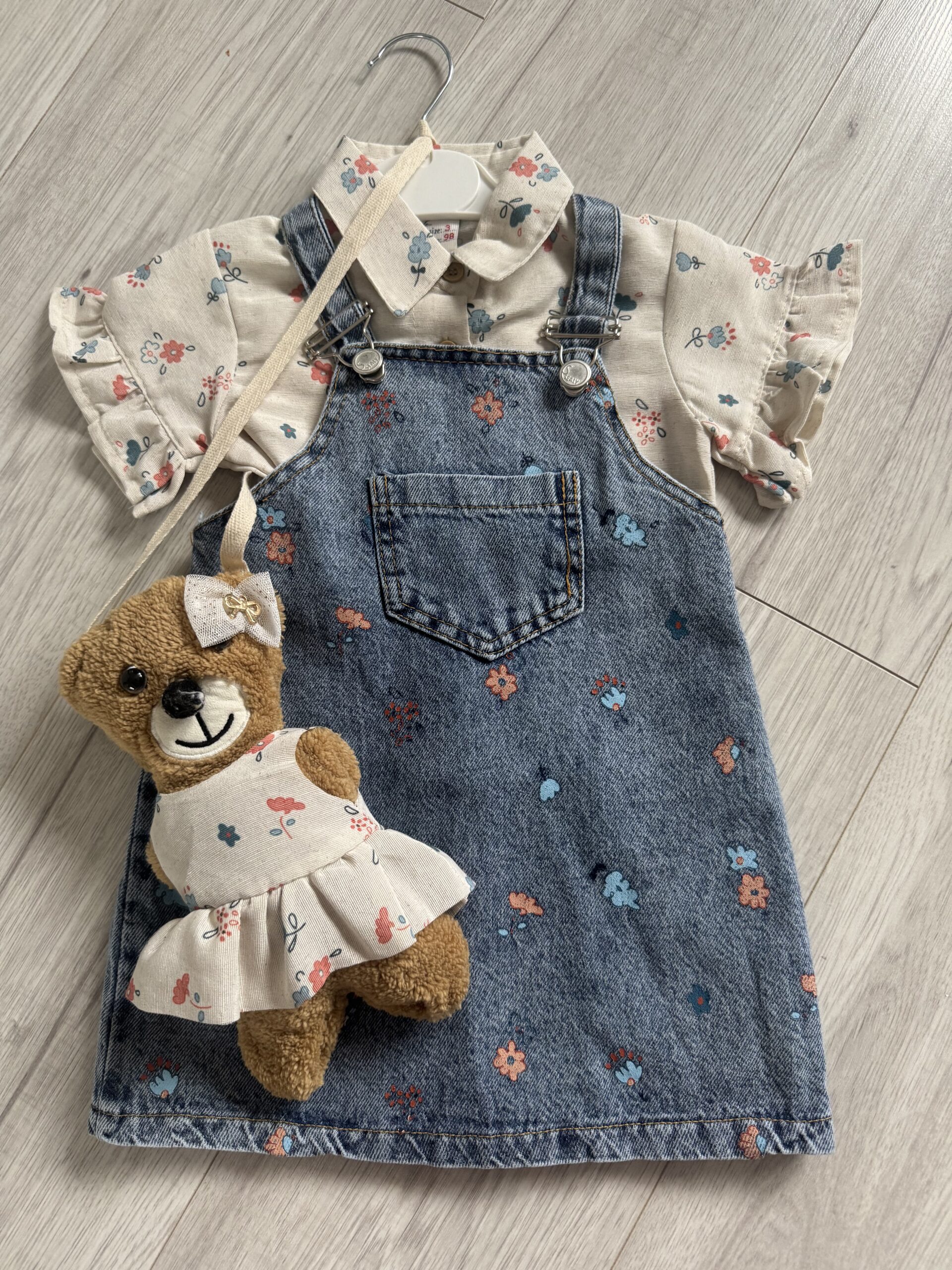 Stylowy zestaw dziewczęcy 3w1, który zachwyci każdą małą modnisię. W komplecie znajduje się jeansowa sukienka na szelkach z delikatnym kwiatowym wzorem, elegancka bluzka zapinana na guziki oraz urocza torebka w kształcie misia.