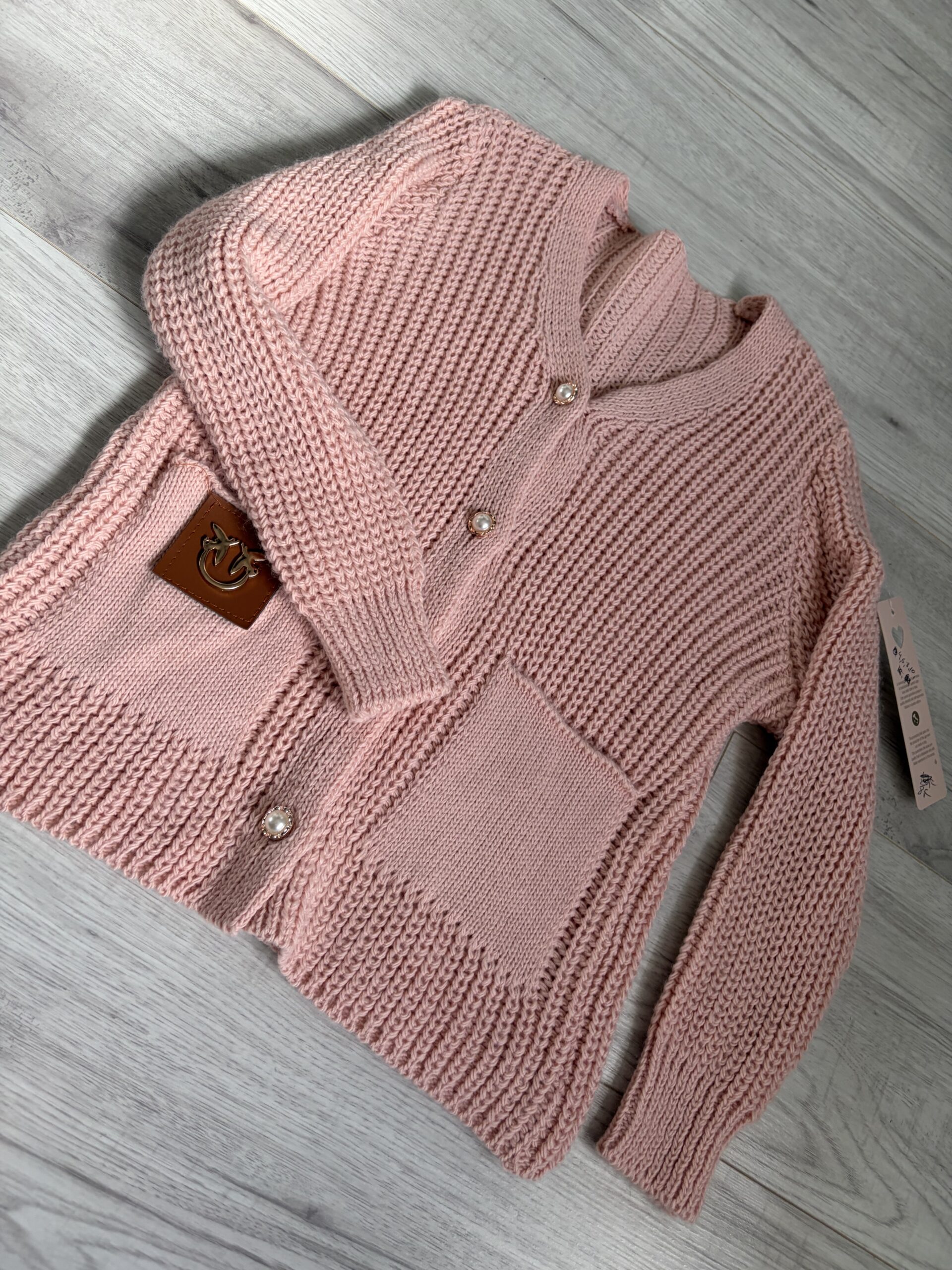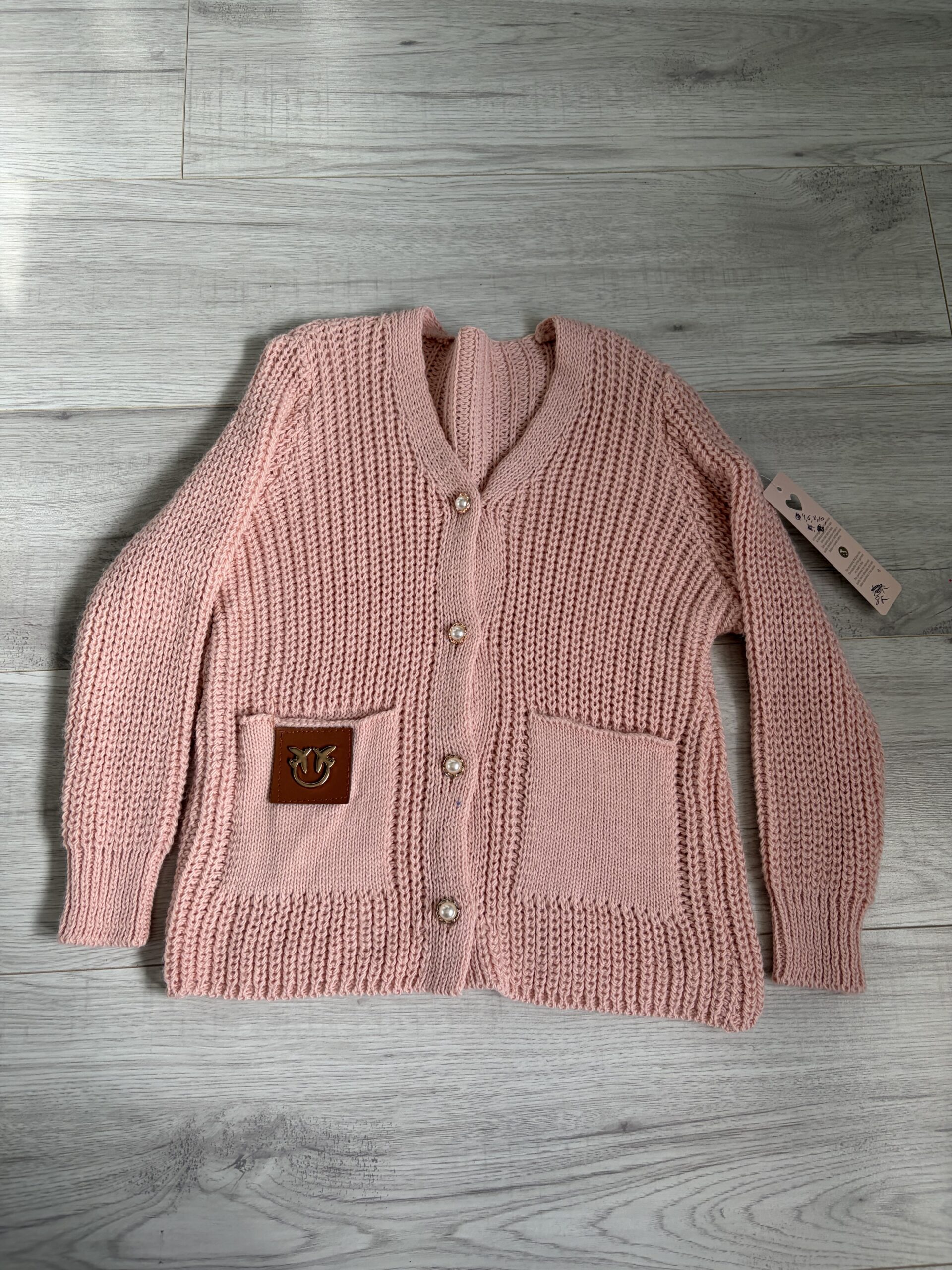 Elegancki sweterek dziewczęcy w modnym odcieniu pudrowego różu. Model zapinany na ozdobne guziki, z praktycznymi kieszonkami z przodu.