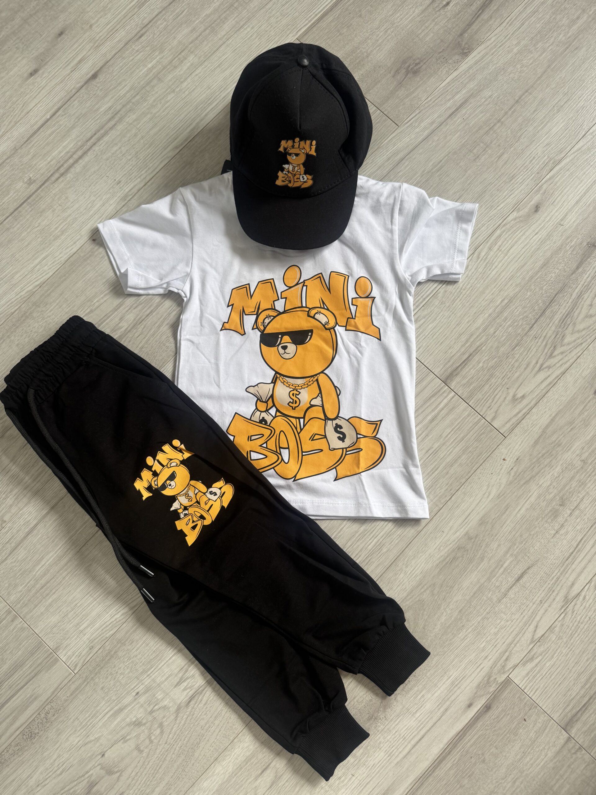 Biała koszulka z misiem , czarne spodnie z kieszeniami oraz czapka z daszkiem tworzą super oryginalny komplet 🙂