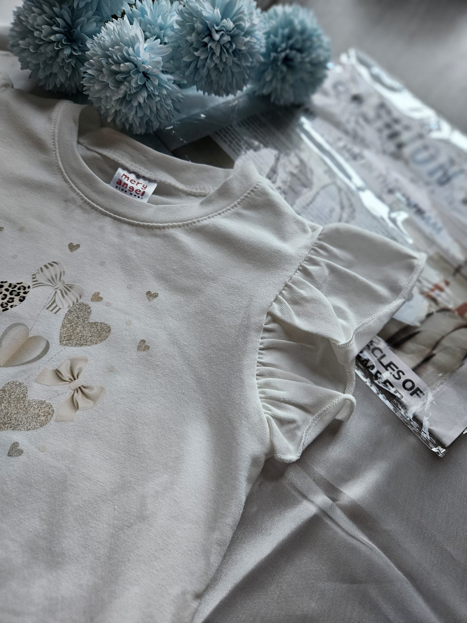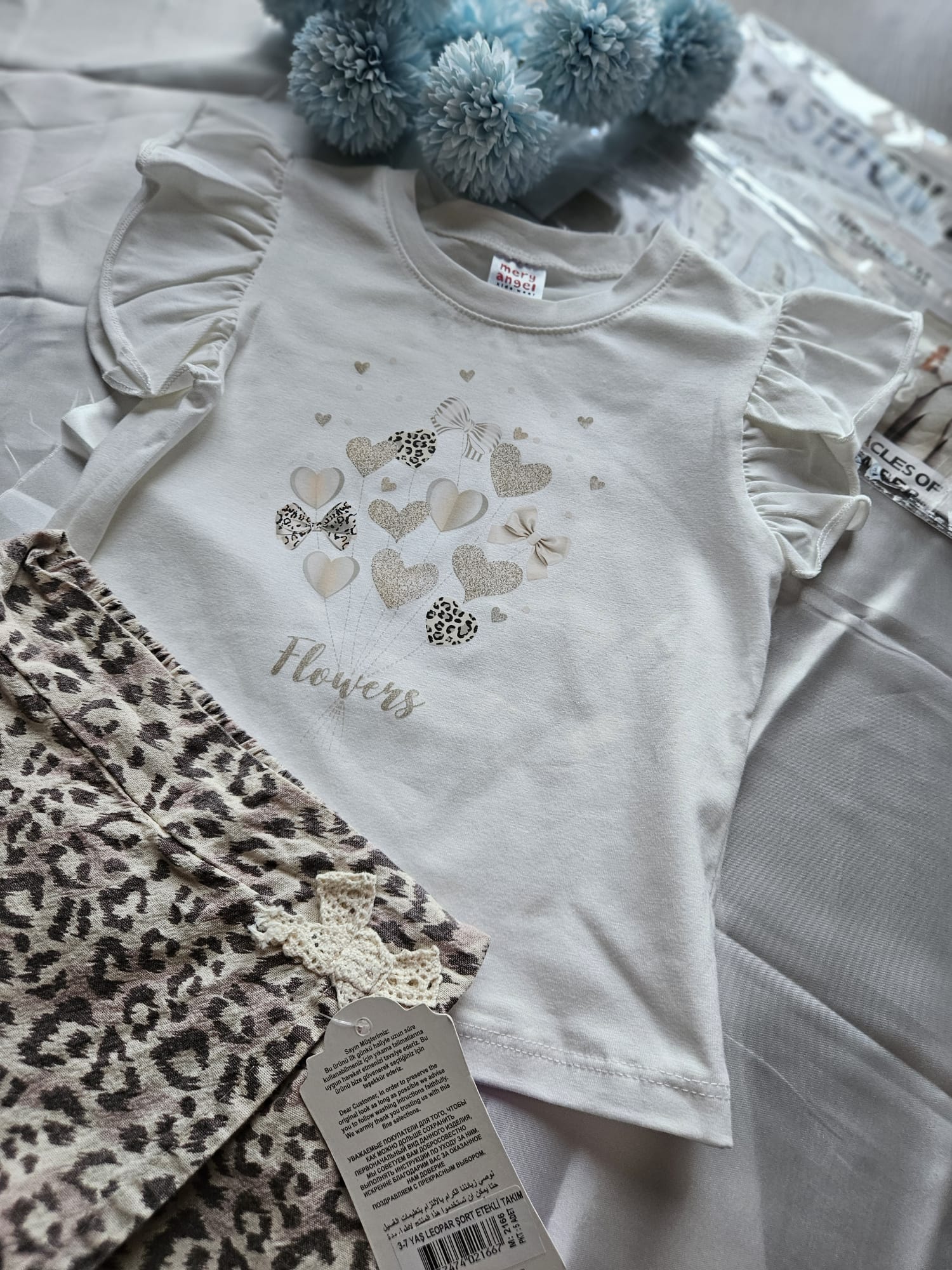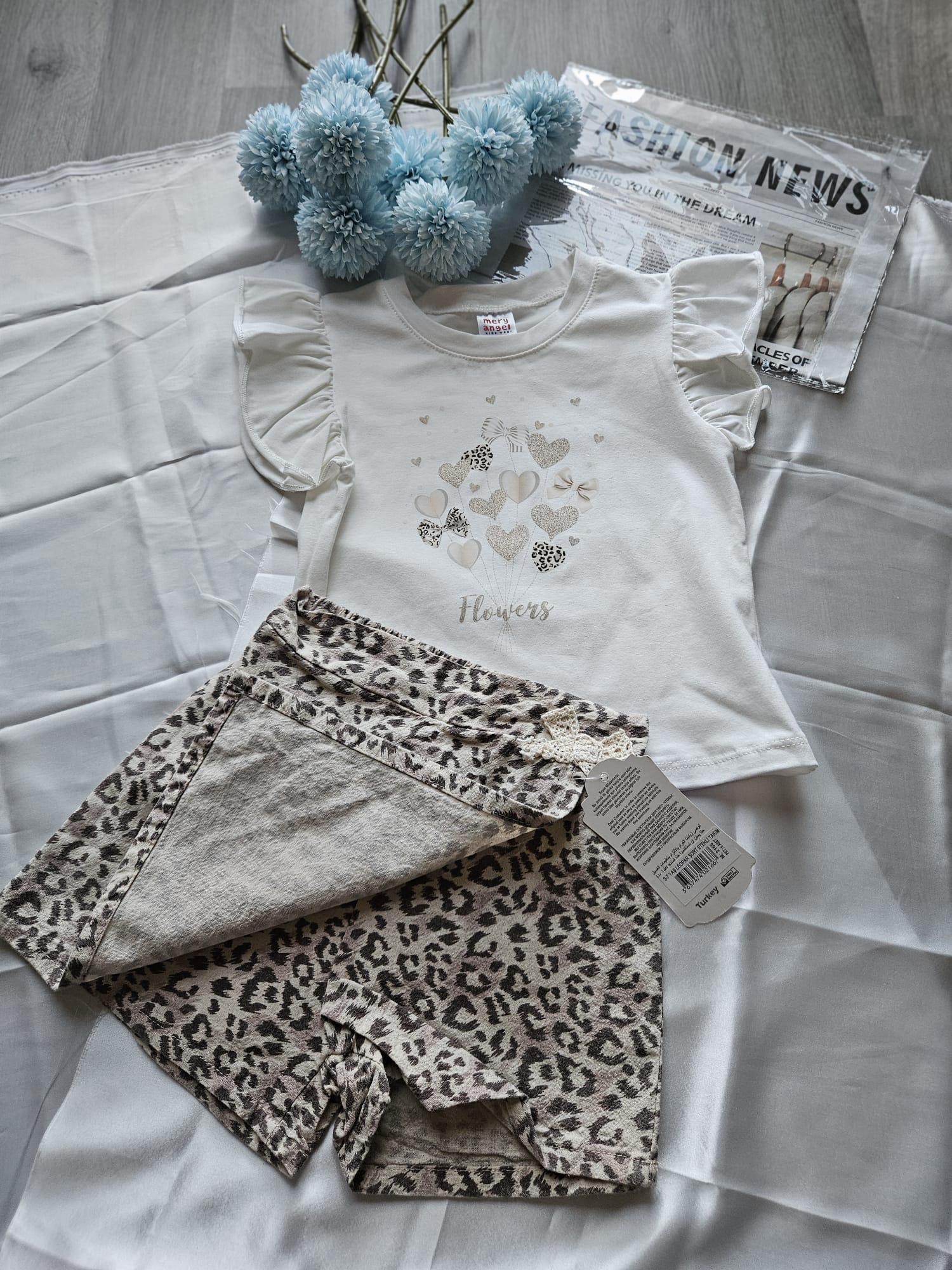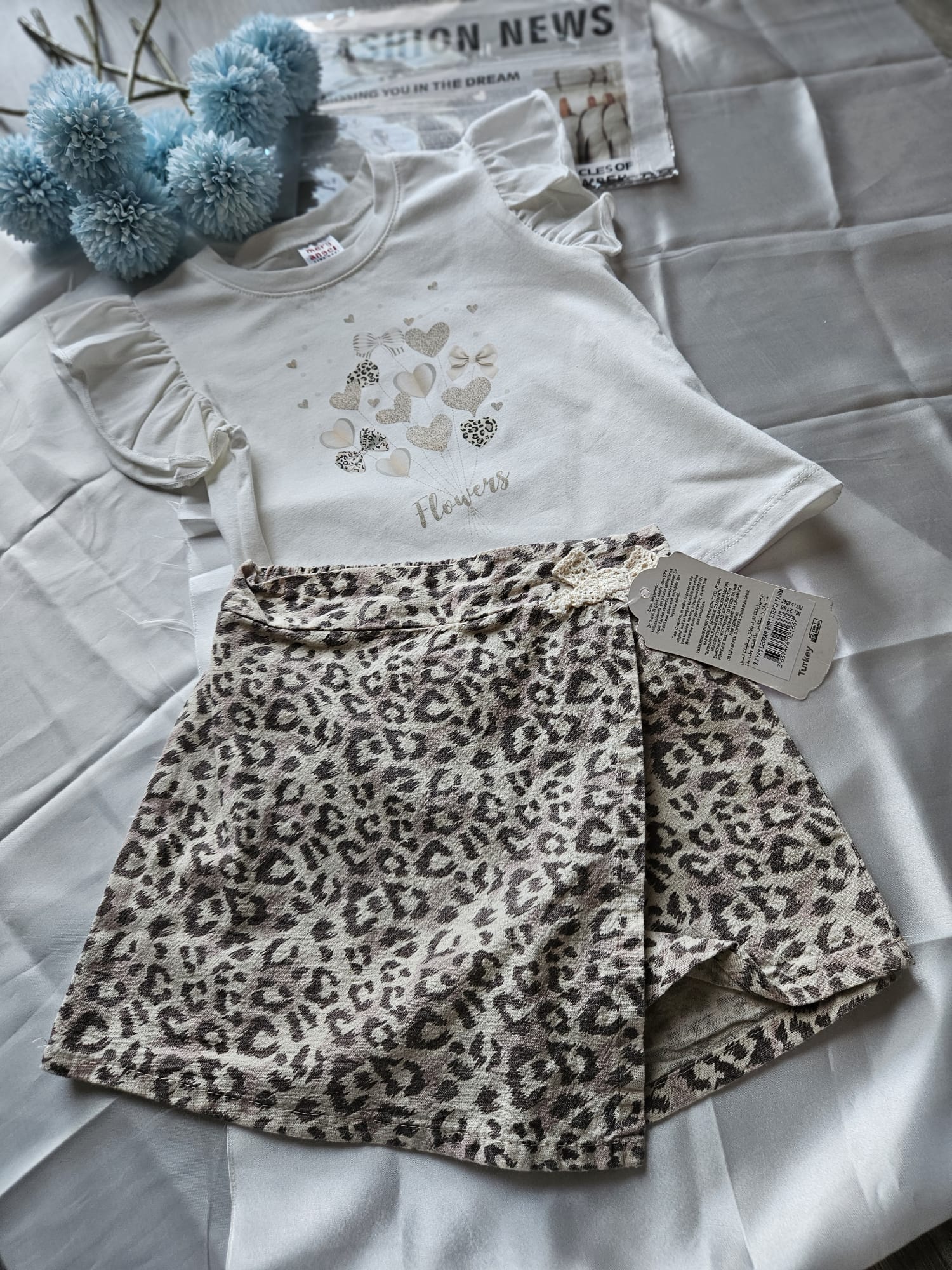 Biała bluzka z serduszkami w połączeniu z materiałową spódnico-spodenką w panterkę tworzy wygodny i stylowy look. Idealny na codzienne zabawy i wyjątkowe okazje!