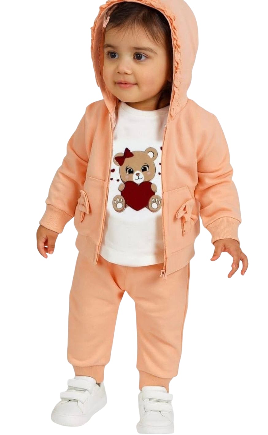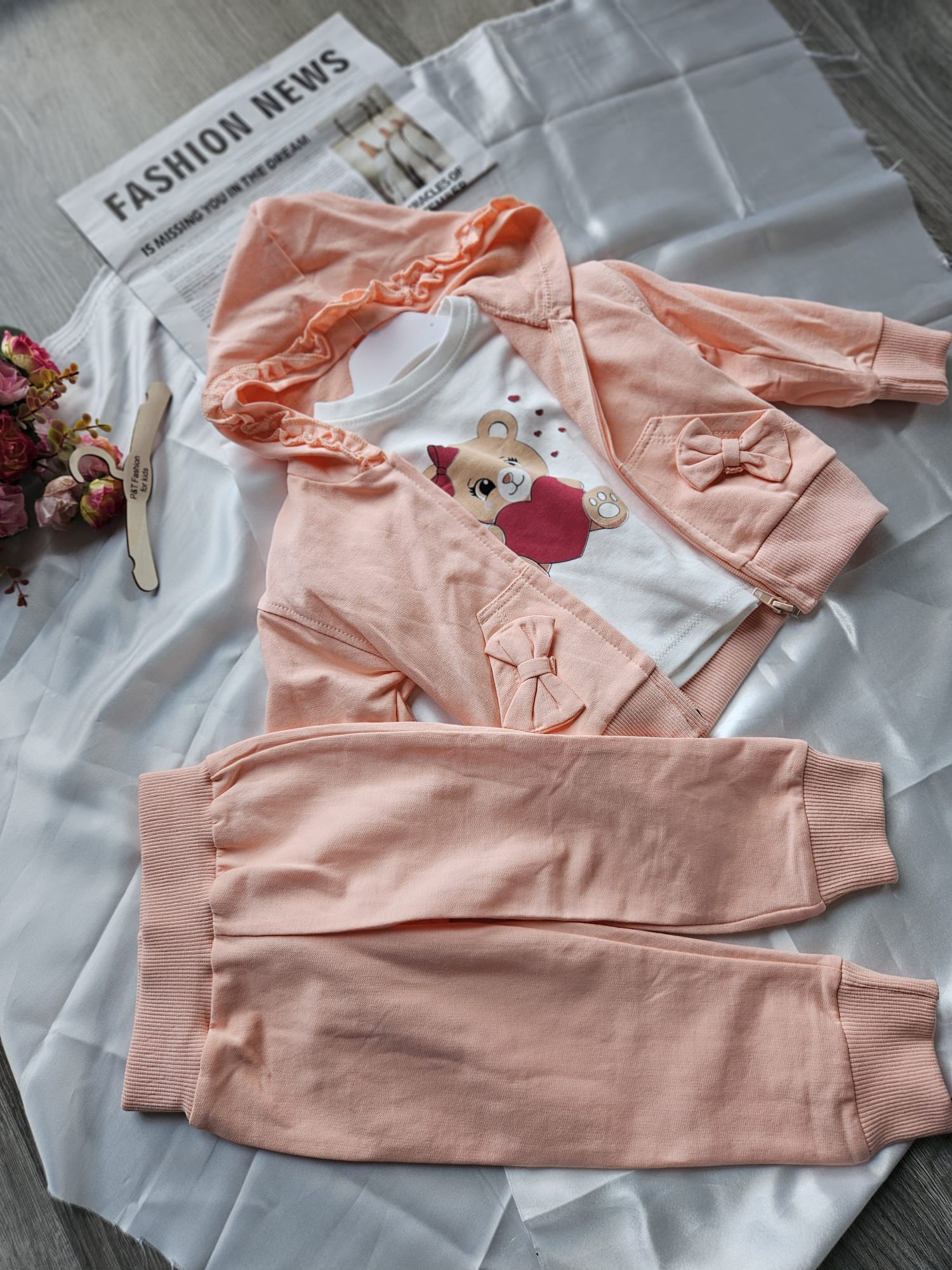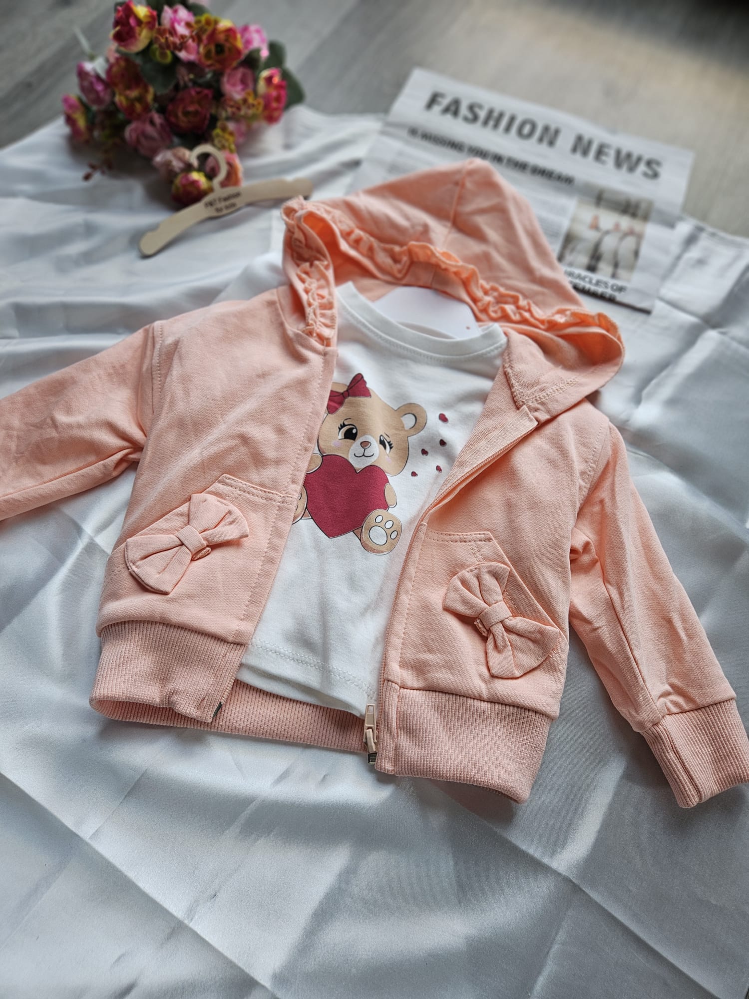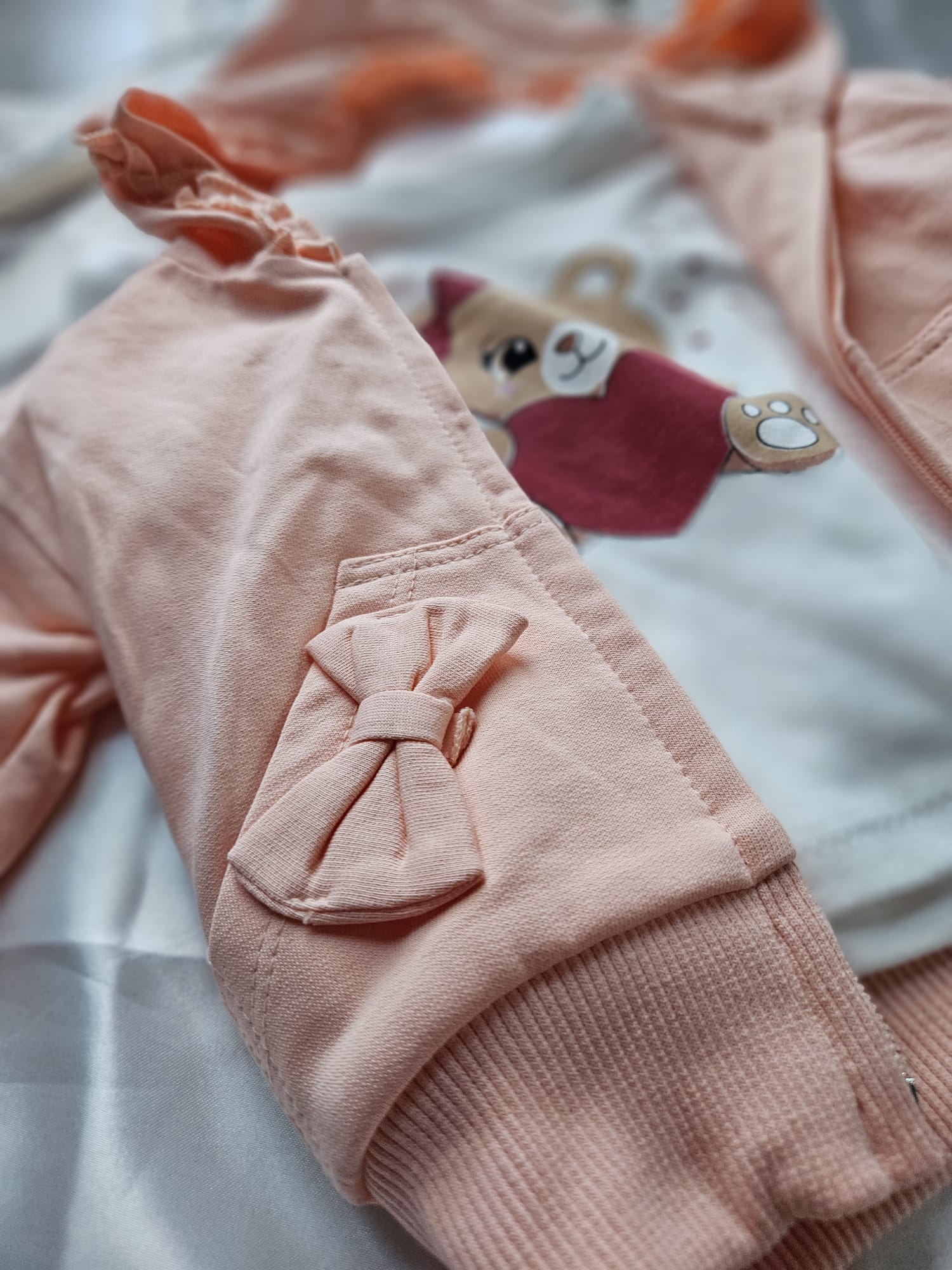 Jasnopomarańczowy komplet dresowy dla dziewczynki to wygodny i uroczy zestaw na co dzień. W skład kompletu wchodzi bluza na suwak z kapturem, spodnie dresowe oraz biała bluzka z uroczym misiem. Miękki materiał i modny kolor zapewniają komfort oraz swobodę ruchów podczas zabawy i codziennych aktywności. 🧡👧🐻