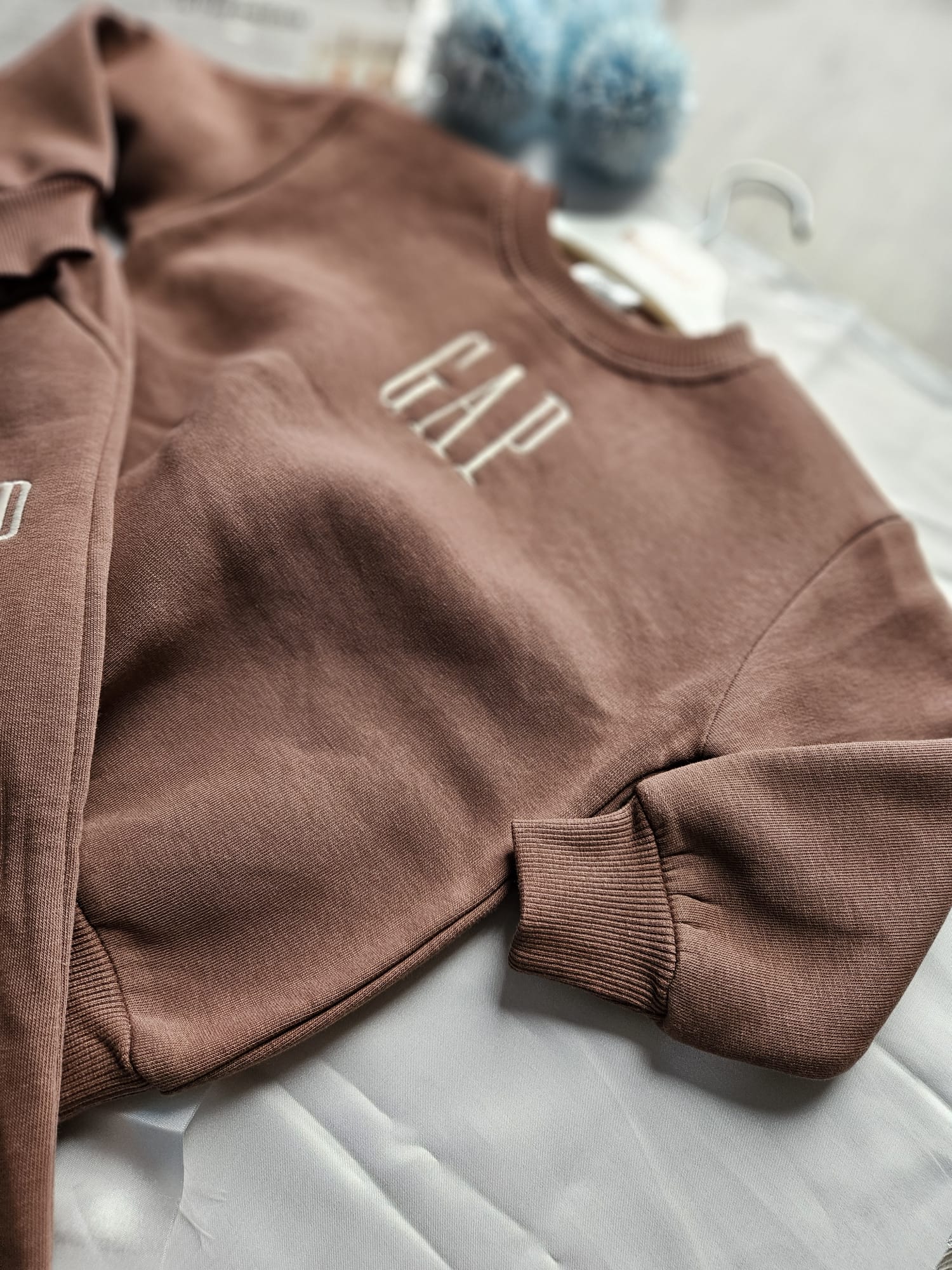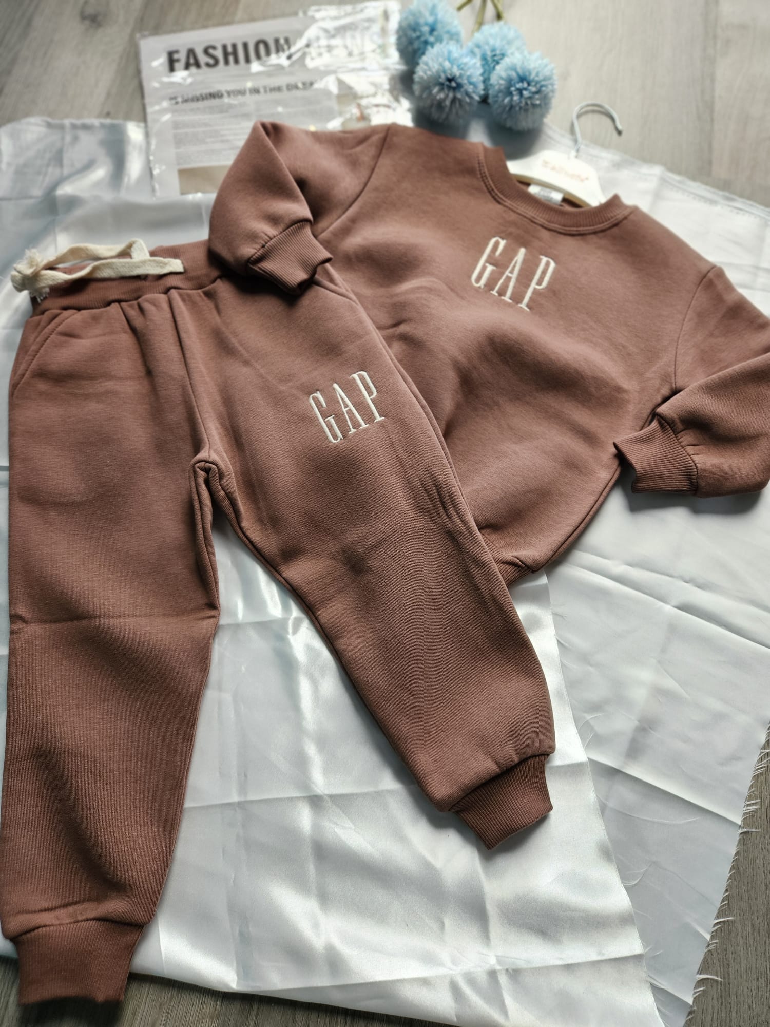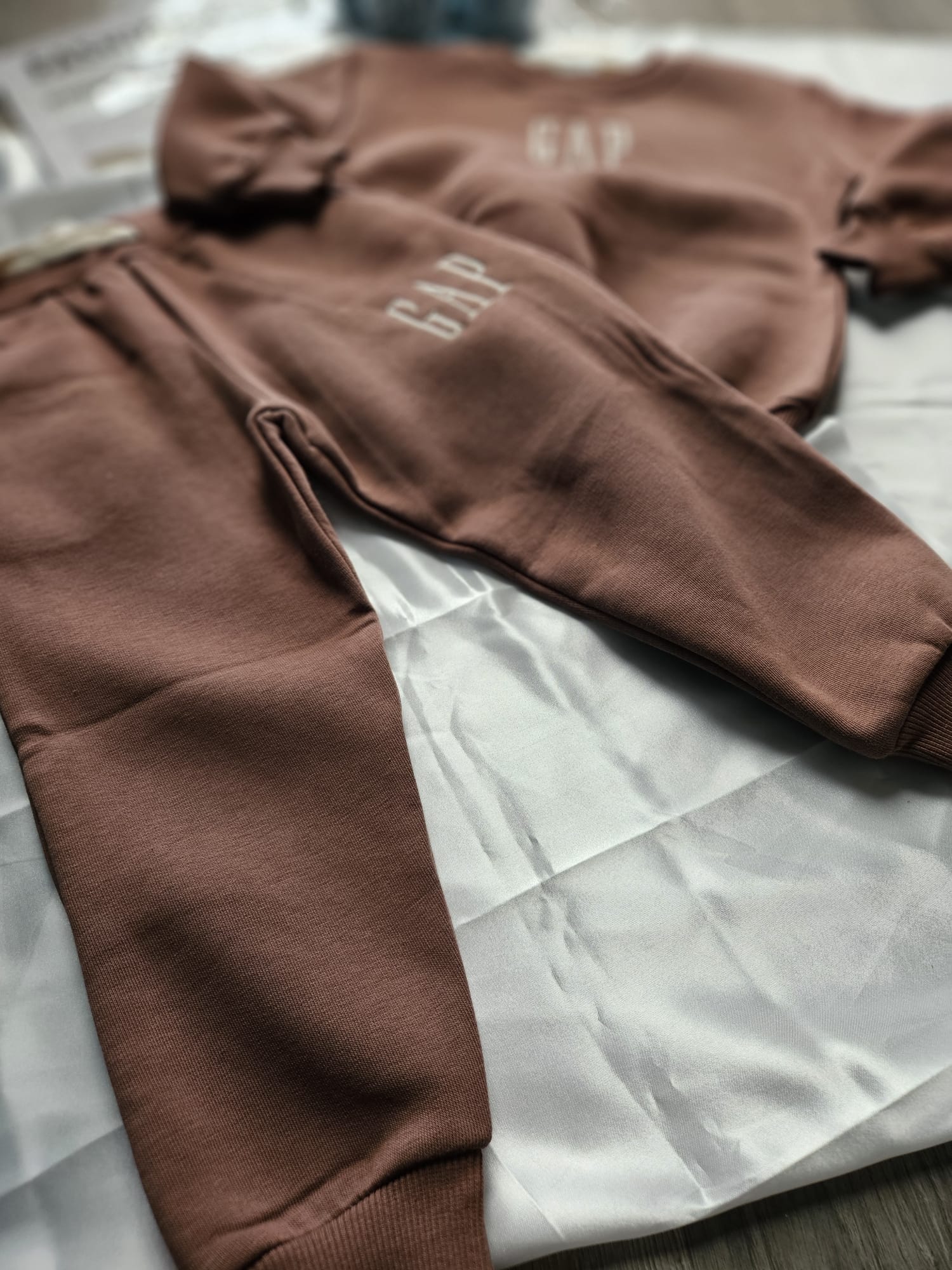 Komplet dresowy ocieplany dla chłopca w modnym, brązowym kolorze z napisem GAP to wygodna i stylowa propozycja na co dzień. Bluza zakładana przez głowę zapewnia łatwość noszenia i komfort, a miękki materiał gwarantuje wygodę podczas zabawy