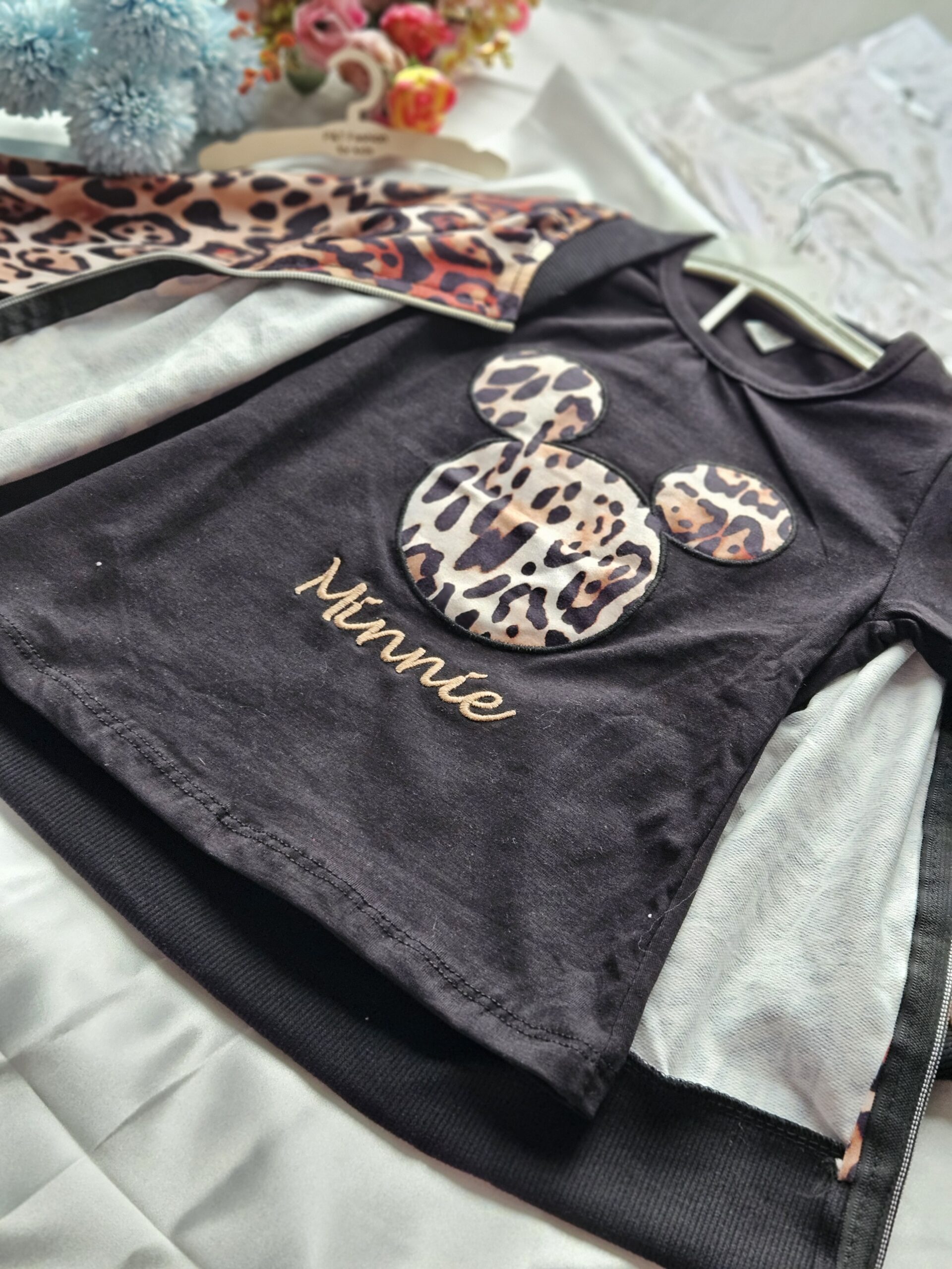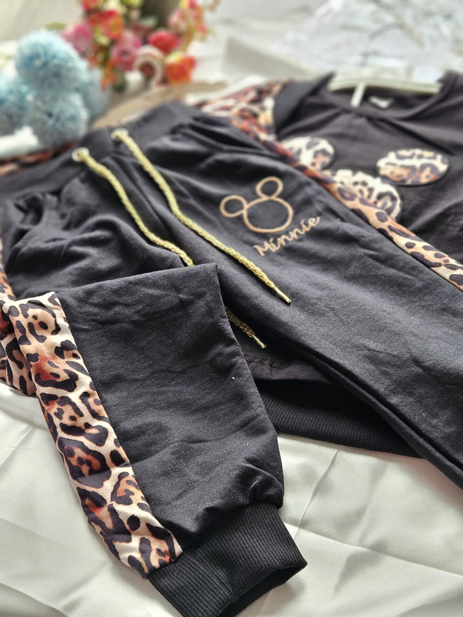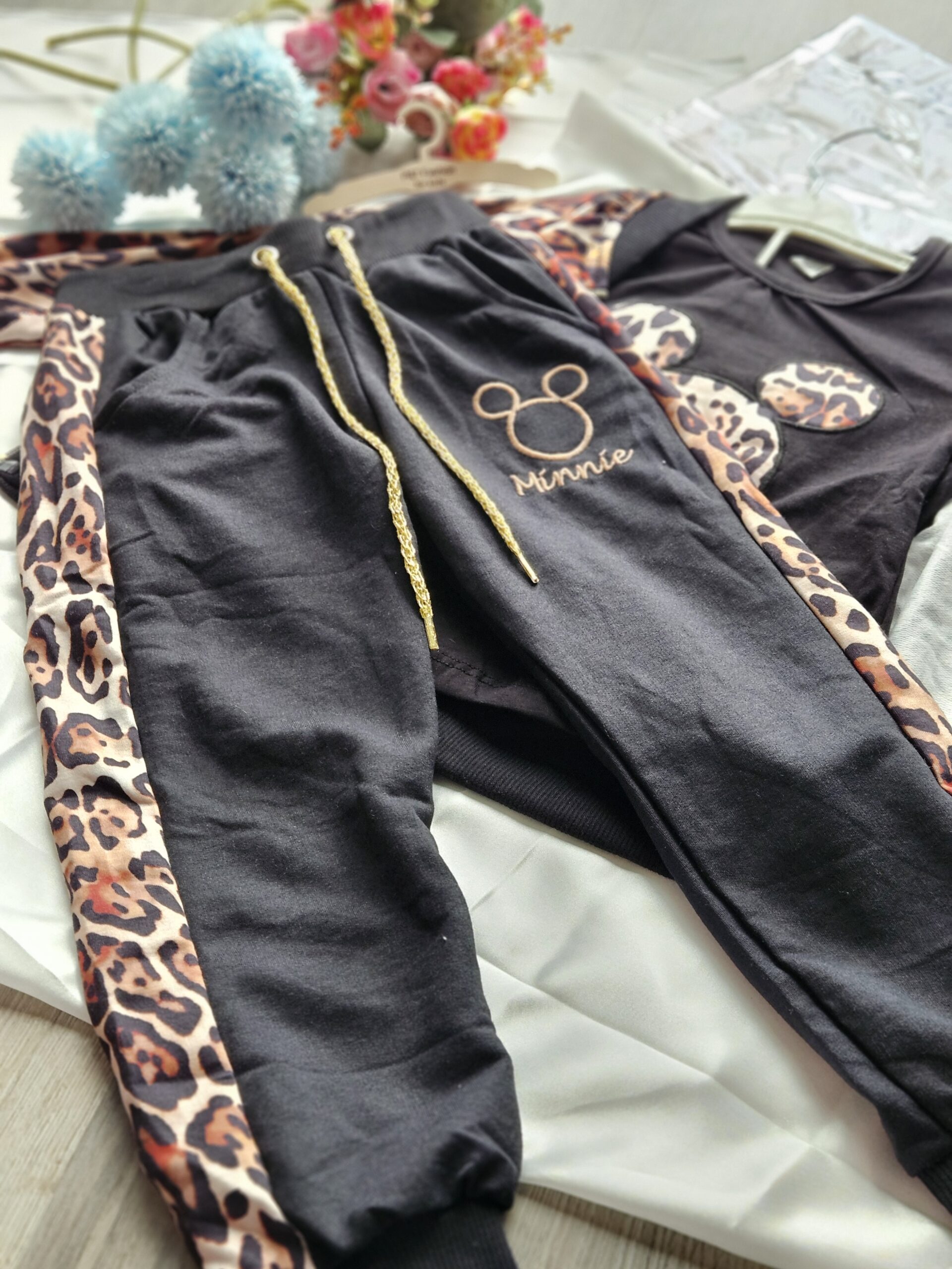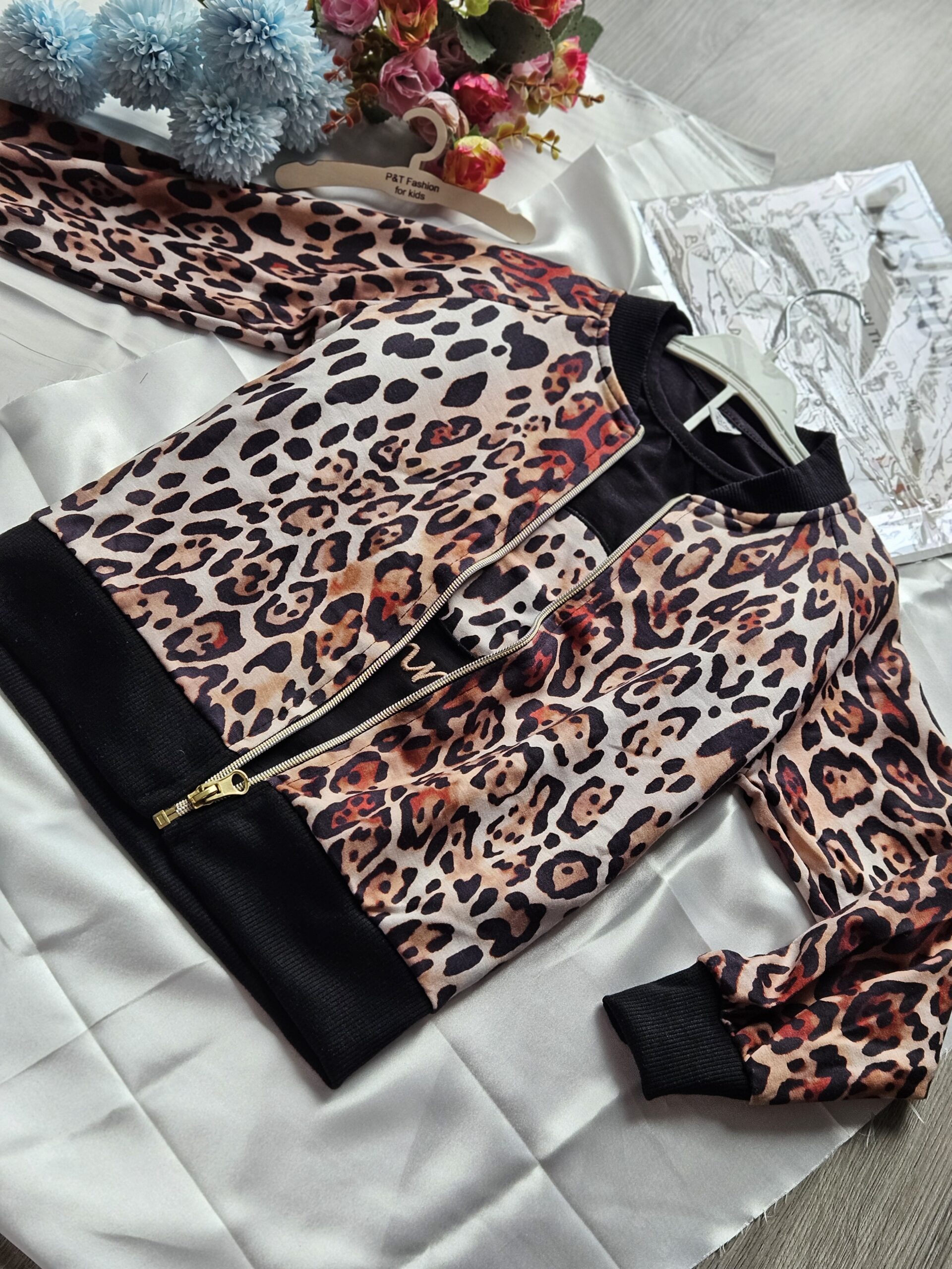 Stylowy komplet dziewczęcy składający się z trzech elementów w modnym połączeniu czerni i panterkowego wzoru.