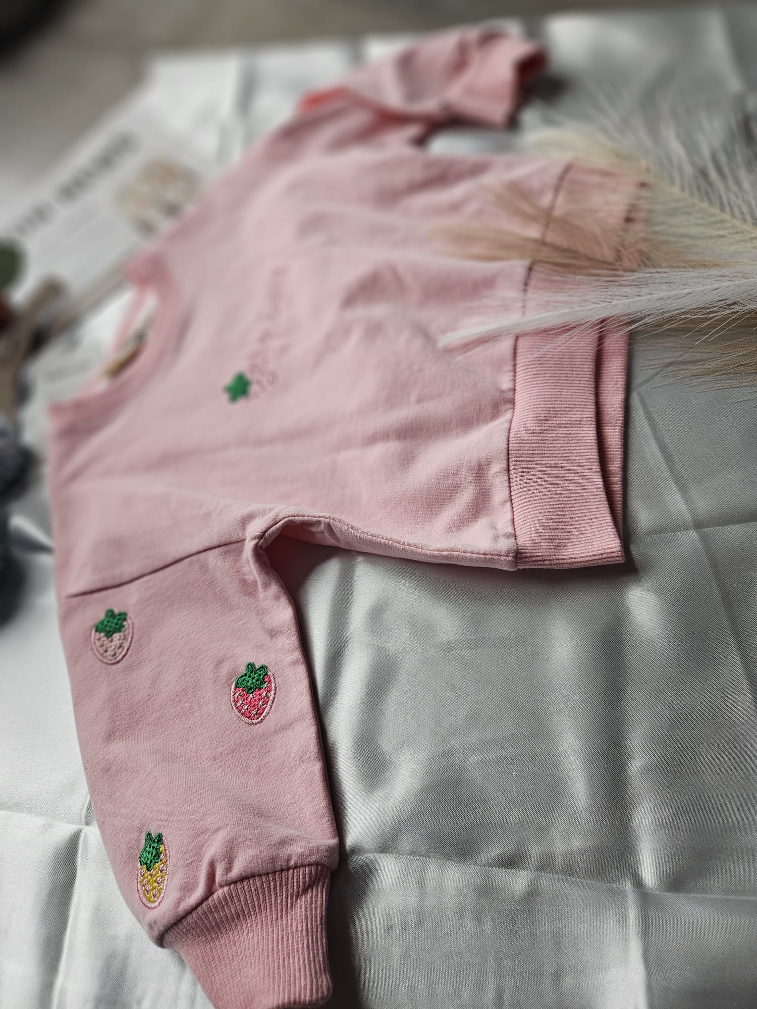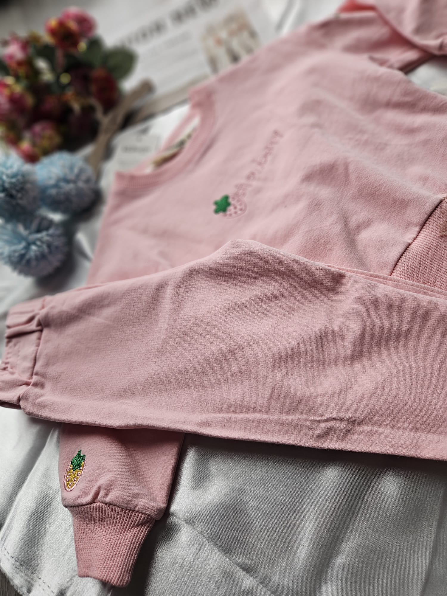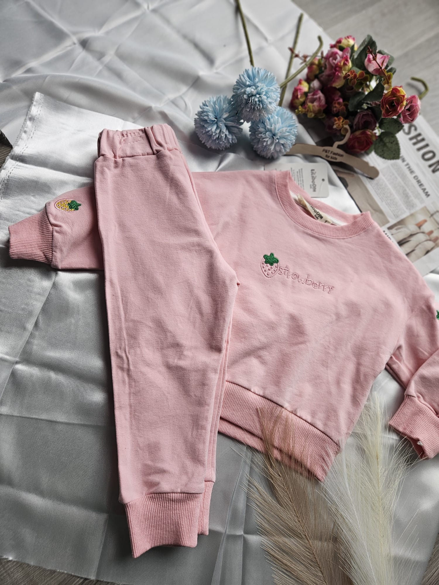 Uroczy dresowy komplet w delikatnym różu z bluzą ozdobioną truskawkowymi aplikacjami – wygoda i styl w jednym! Idealny na zabawy na świeżym powietrzu i codzienne przygody.