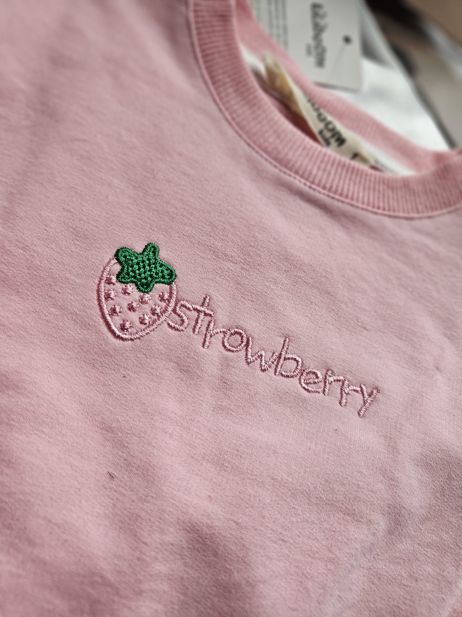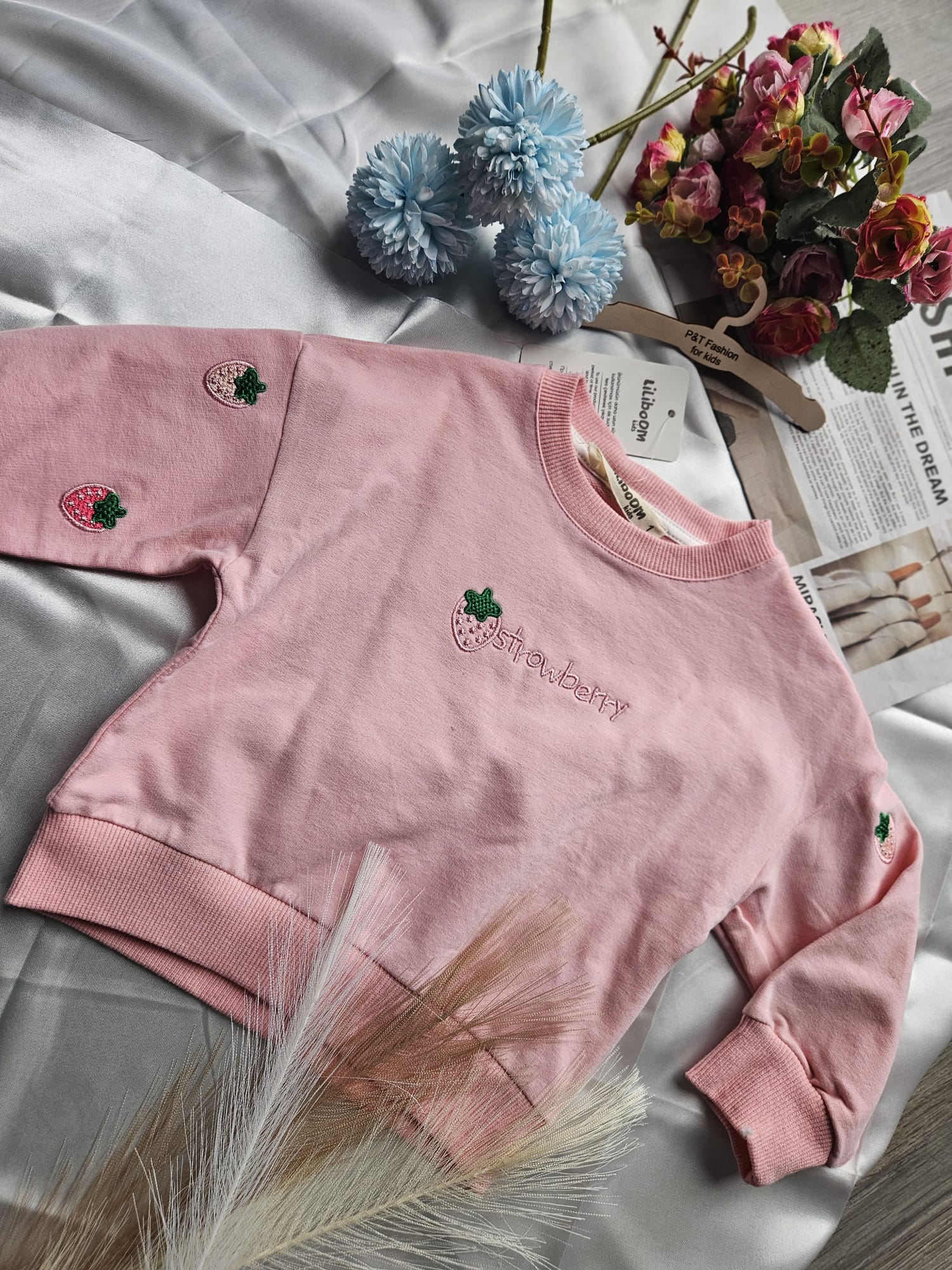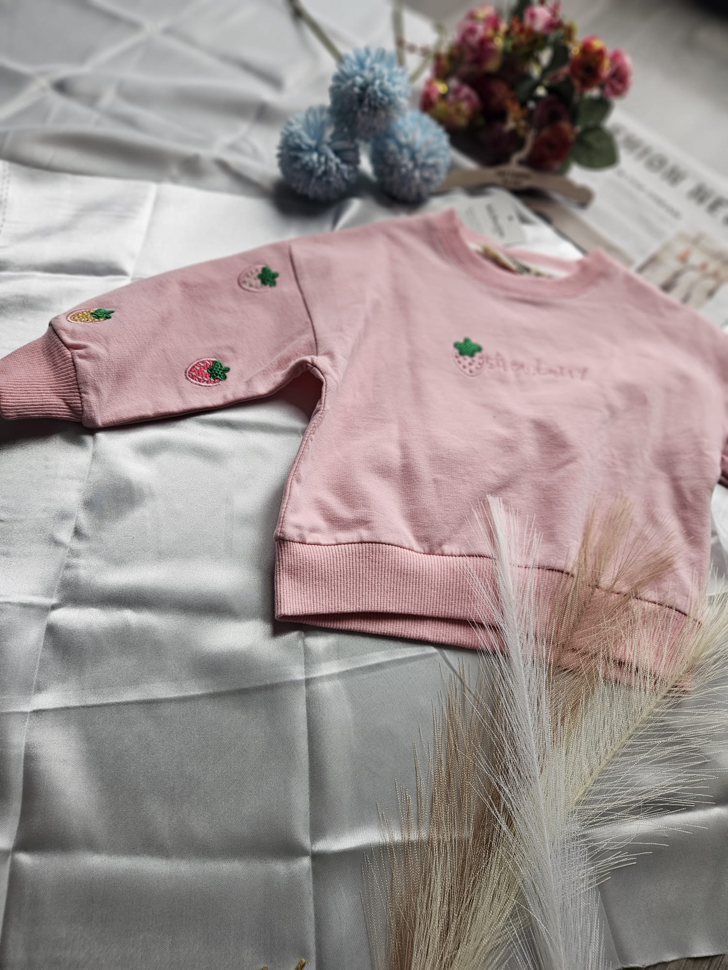 Uroczy dresowy komplet w delikatnym różu z bluzą ozdobioną truskawkowymi aplikacjami – wygoda i styl w jednym! Idealny na zabawy na świeżym powietrzu i codzienne przygody.