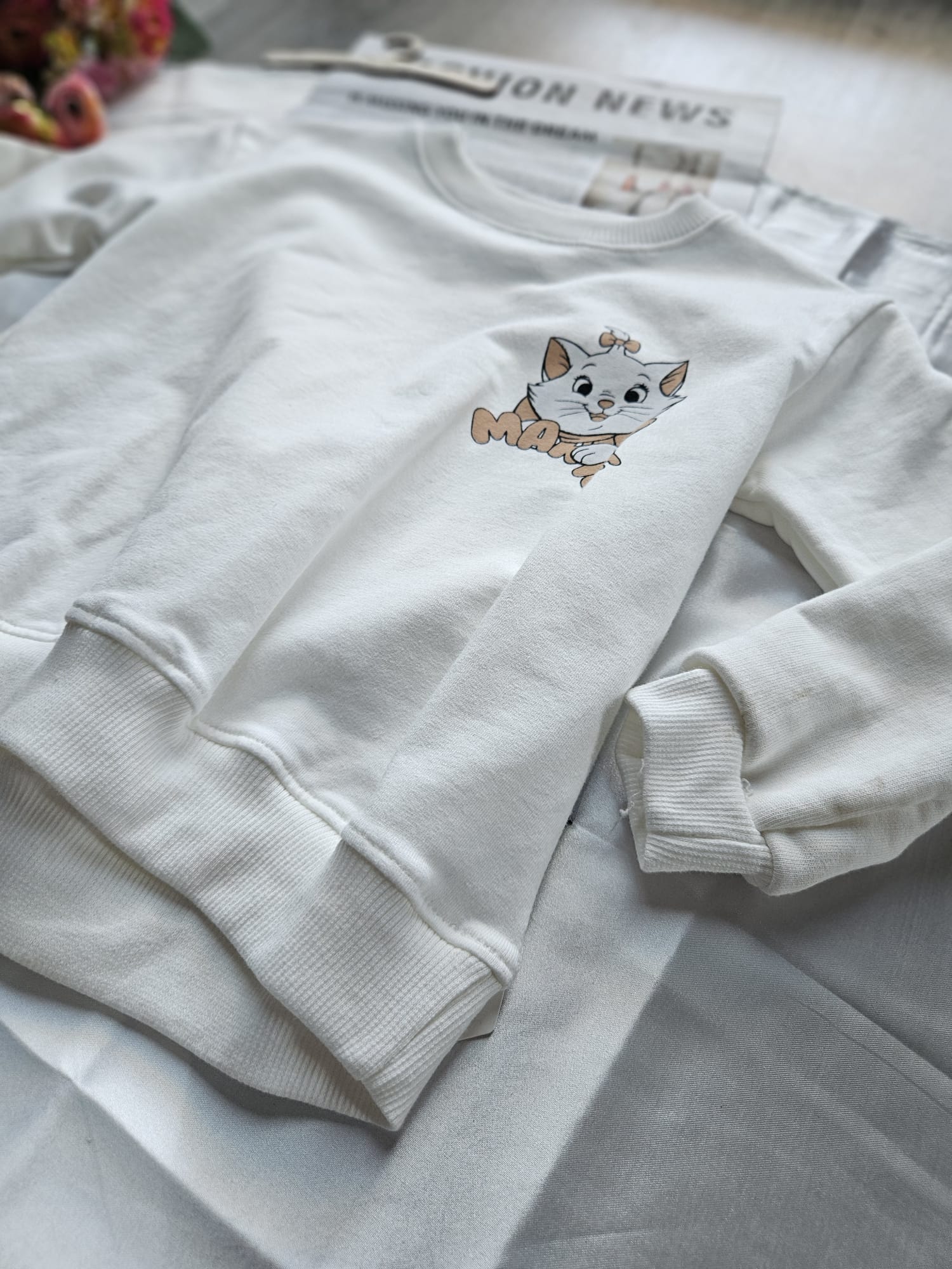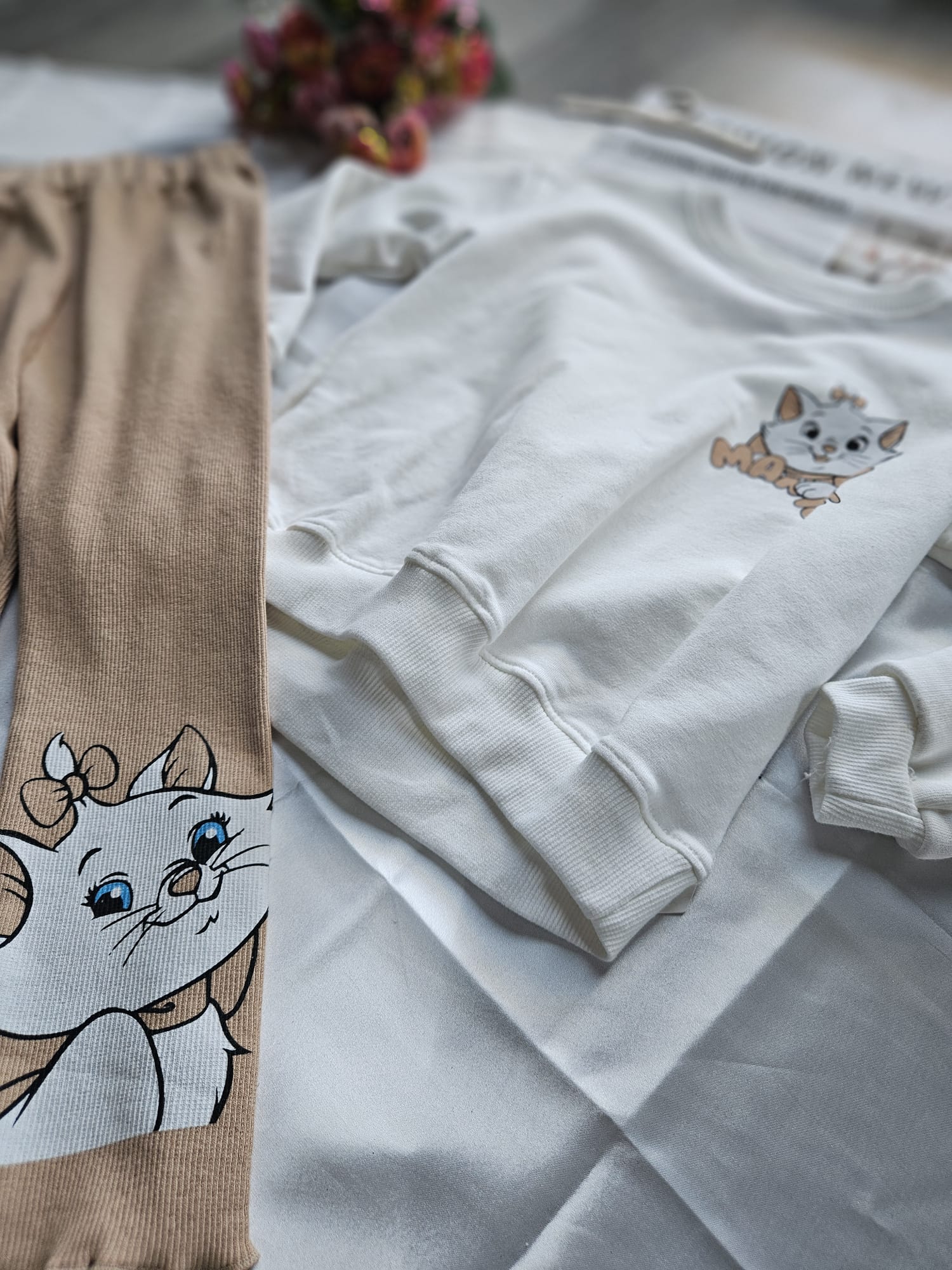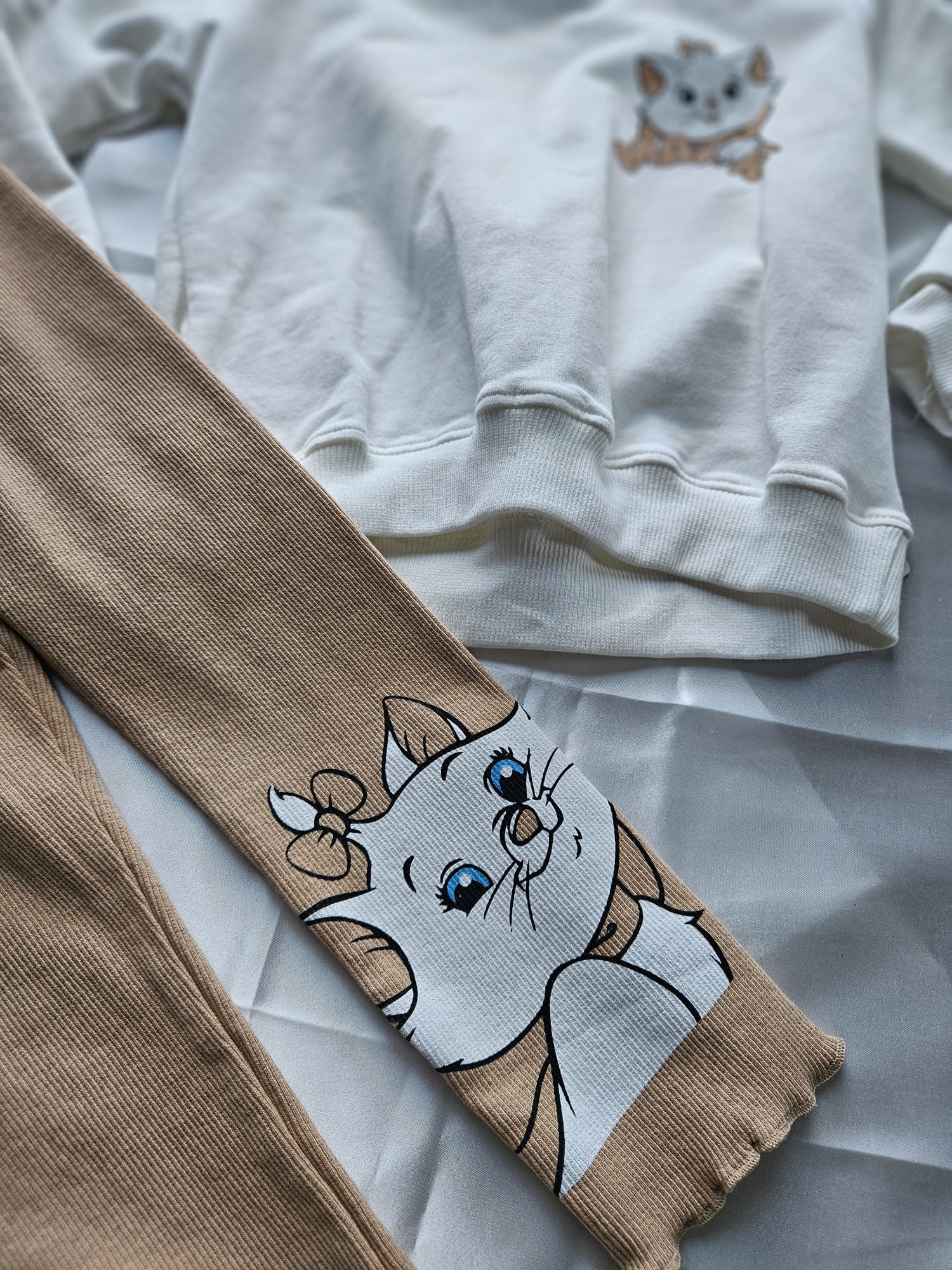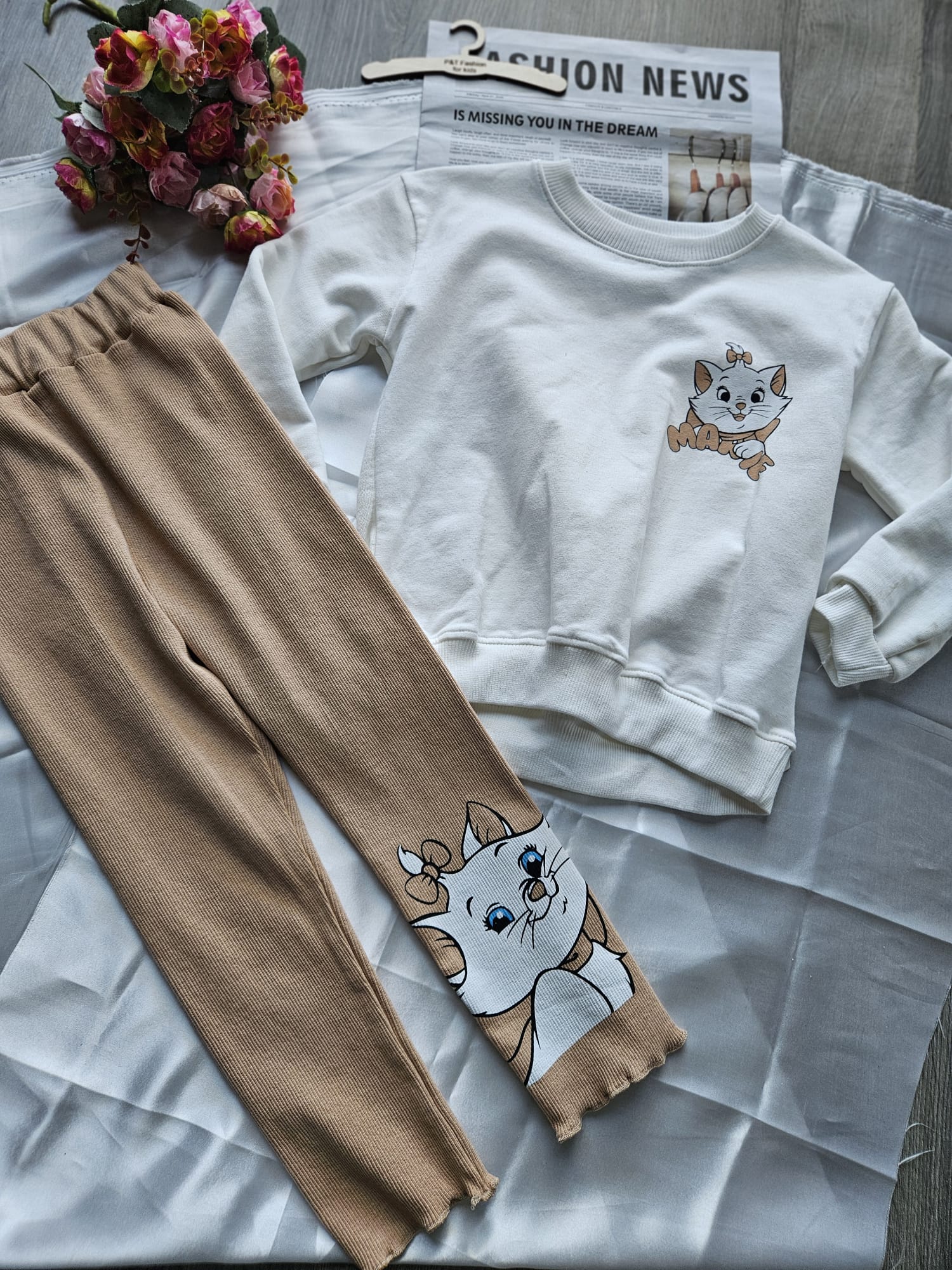 Uroczy komplet dla dziewczynki składający się z białej bluzy oraz beżowych legginsów. Obie części ozdobione są aplikacją kotka, która dodaje zestawowi wyjątkowego uroku. Wygodny i miękki materiał sprawia, że komplet idealnie sprawdzi się na co dzień. 🐱👧✨