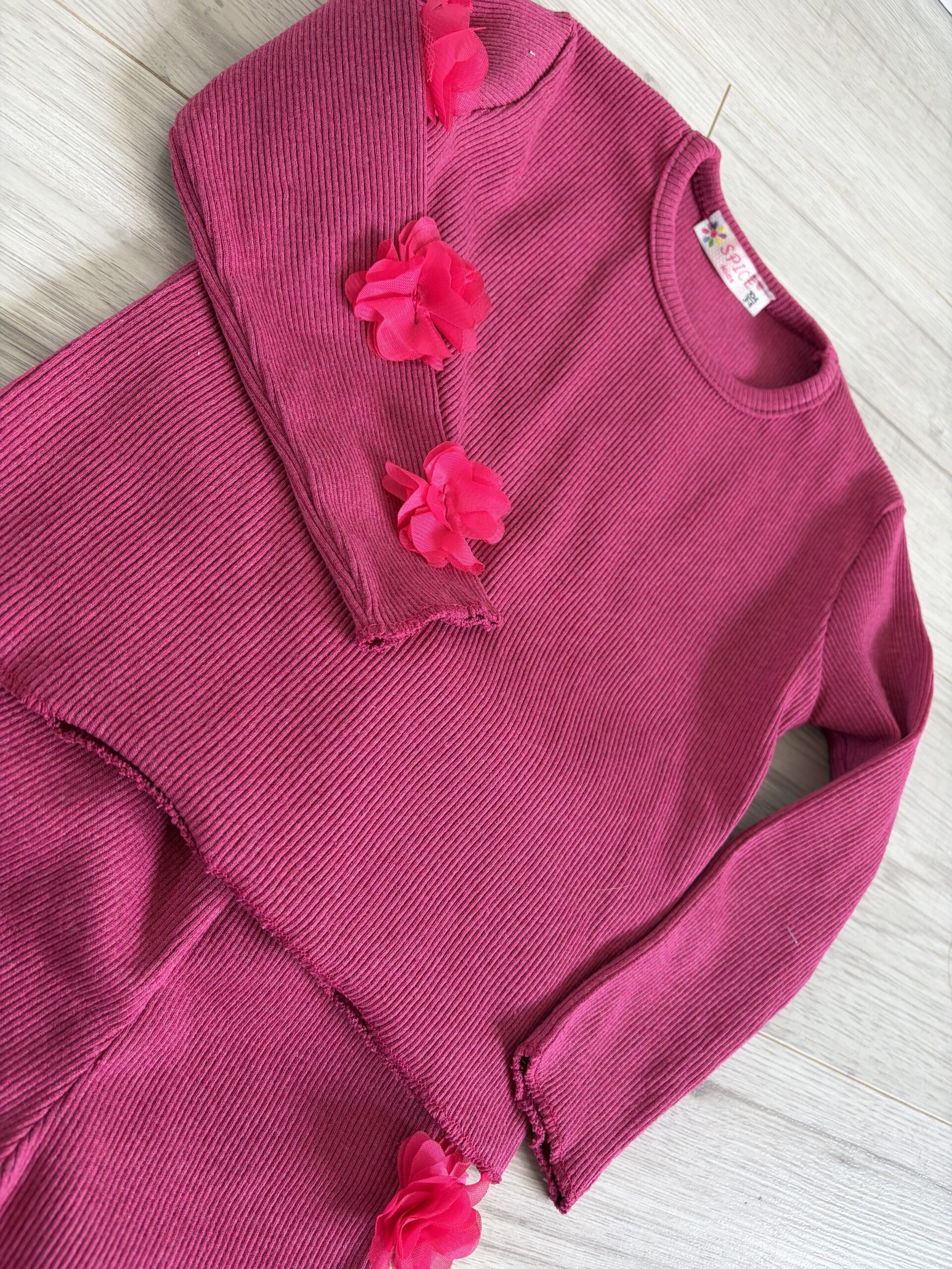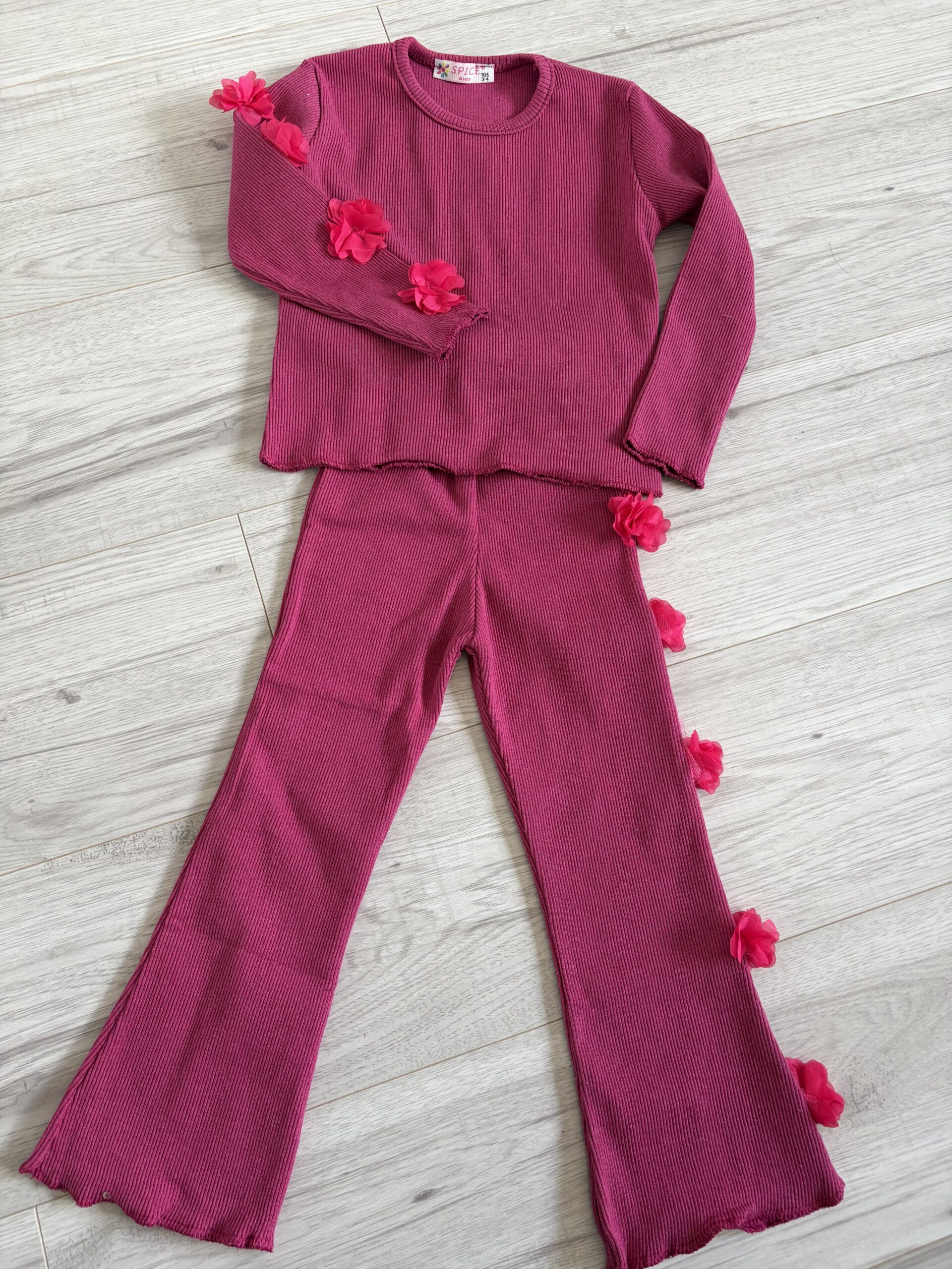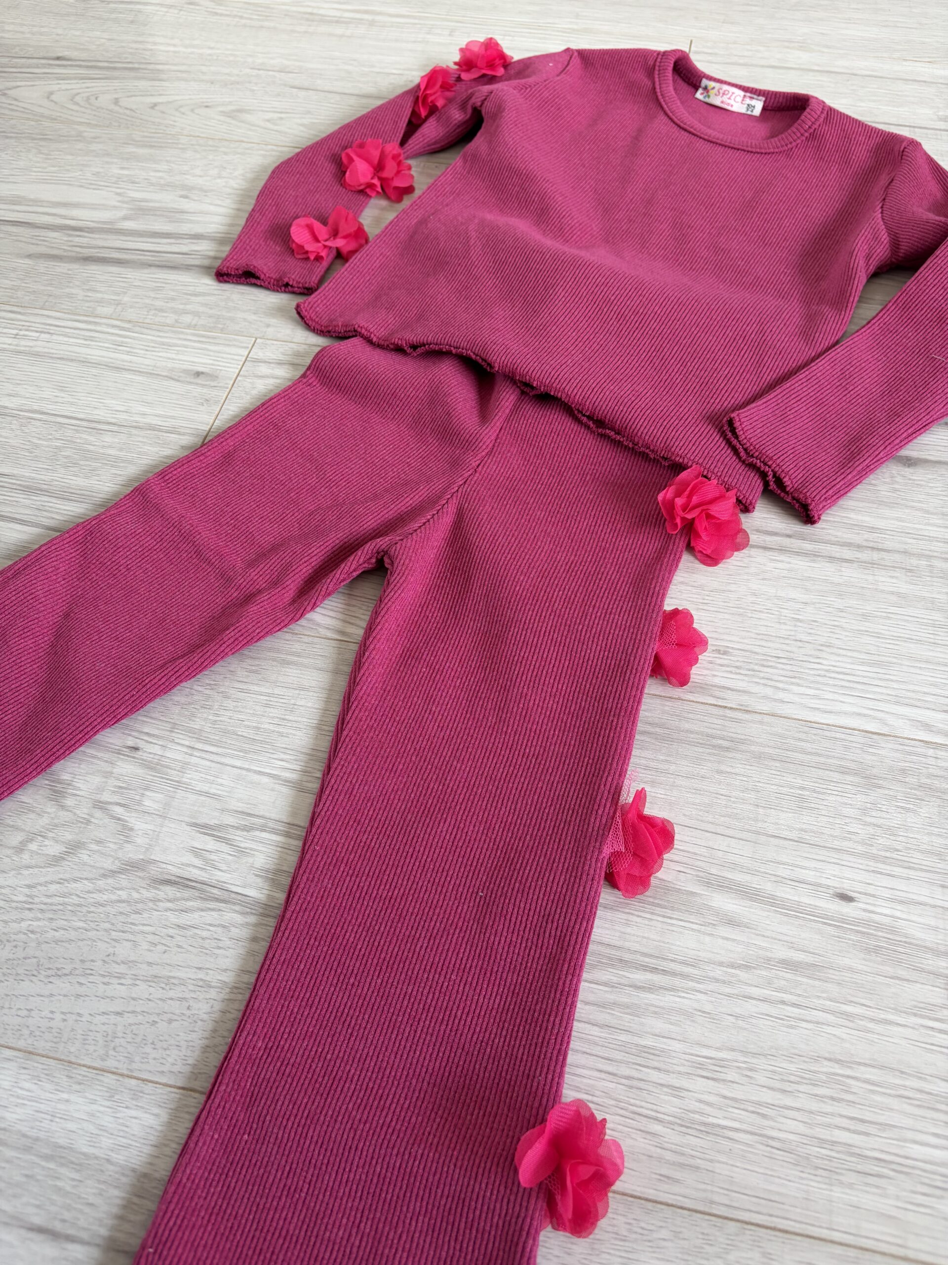 Oryginalny komplet w kolorze fuksji . Kwiaty  w 3D na rękawku i nogawce dodają elegancje całemu kompletowi . Bluzka prążek oraz spodnie dzwony .