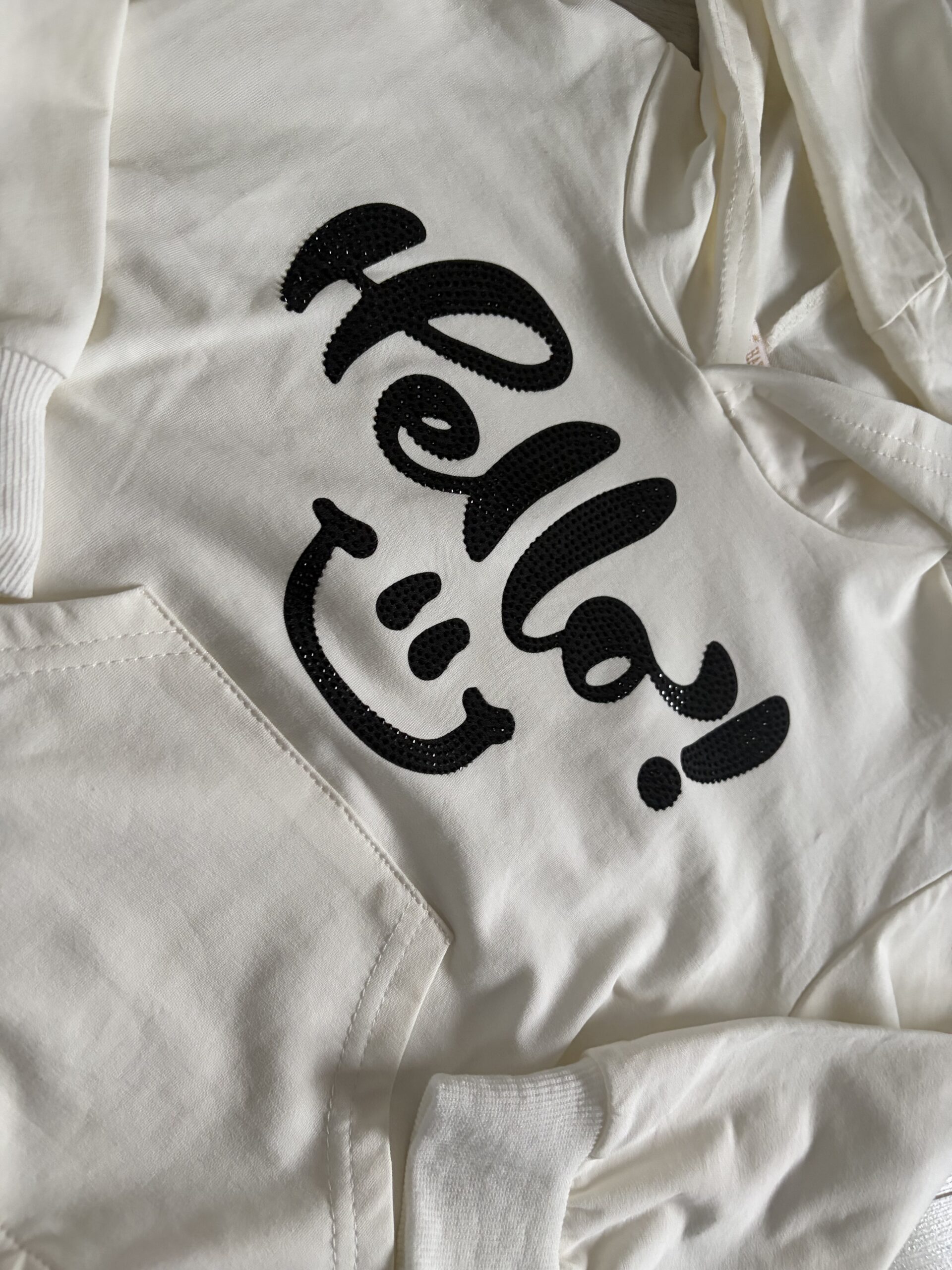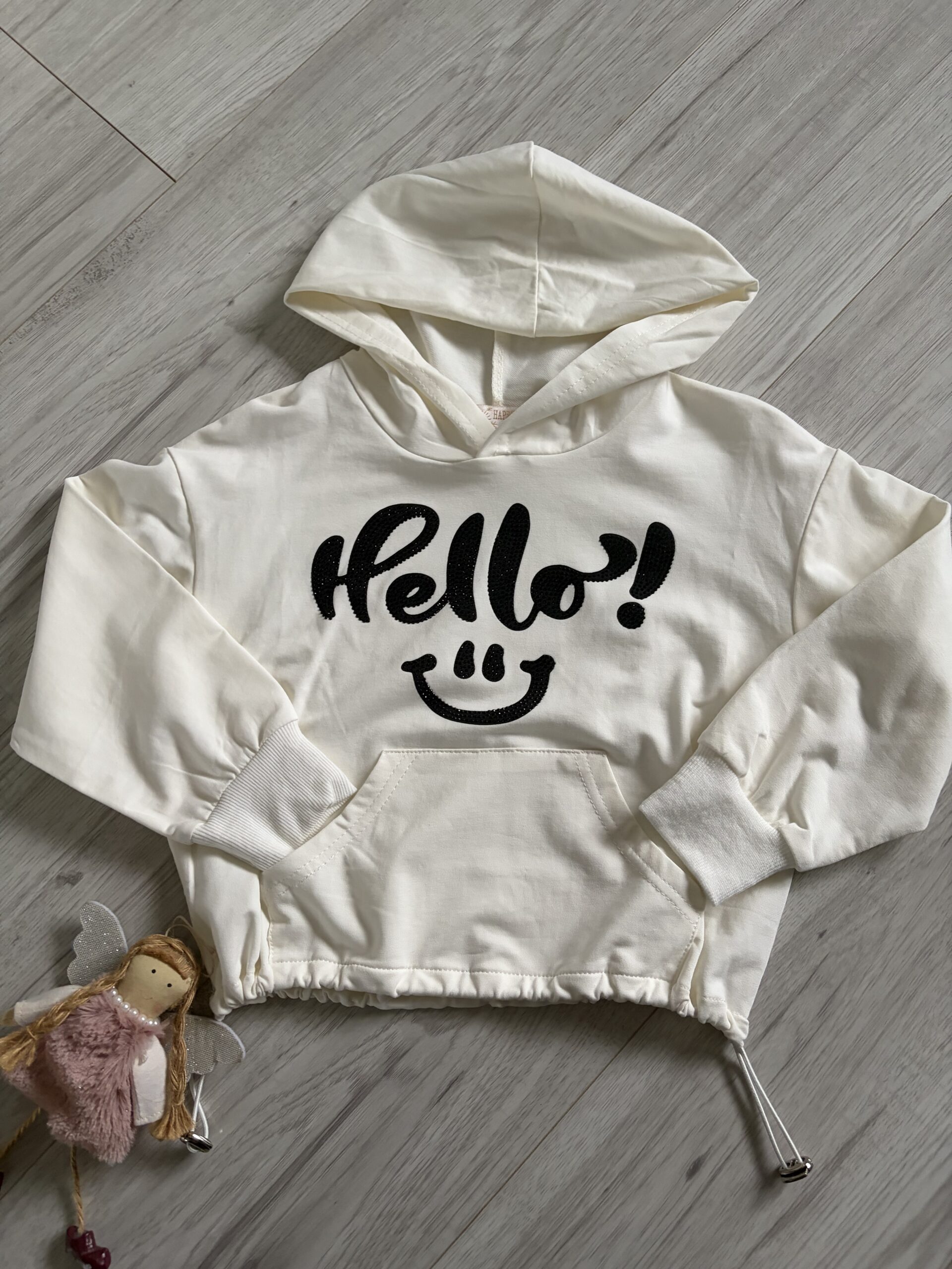Modna, krótsza bluza w kremowym kolorze ze świecącym napisem.