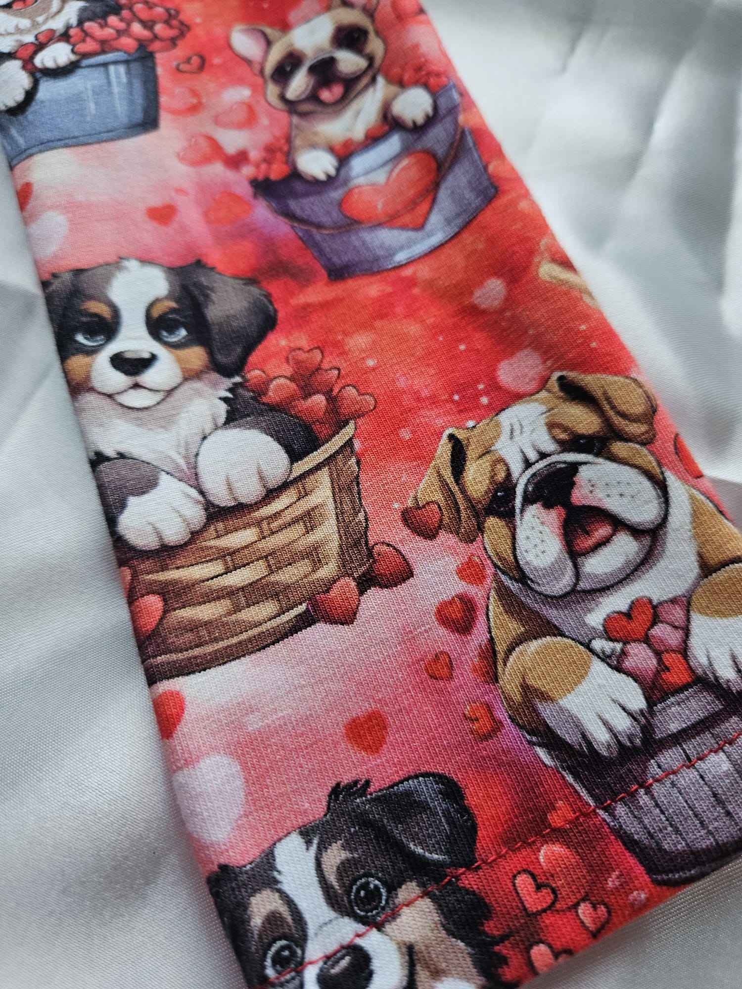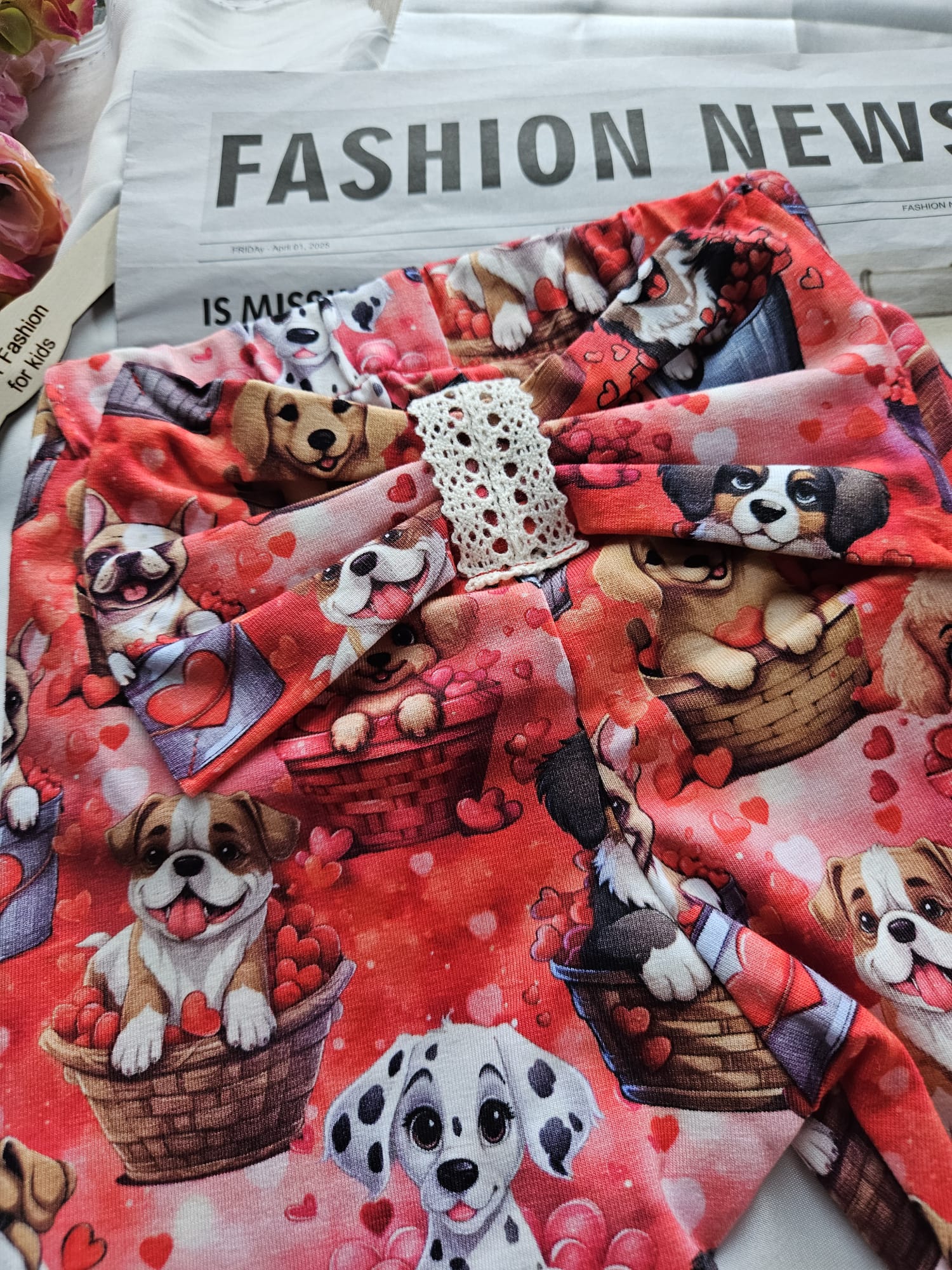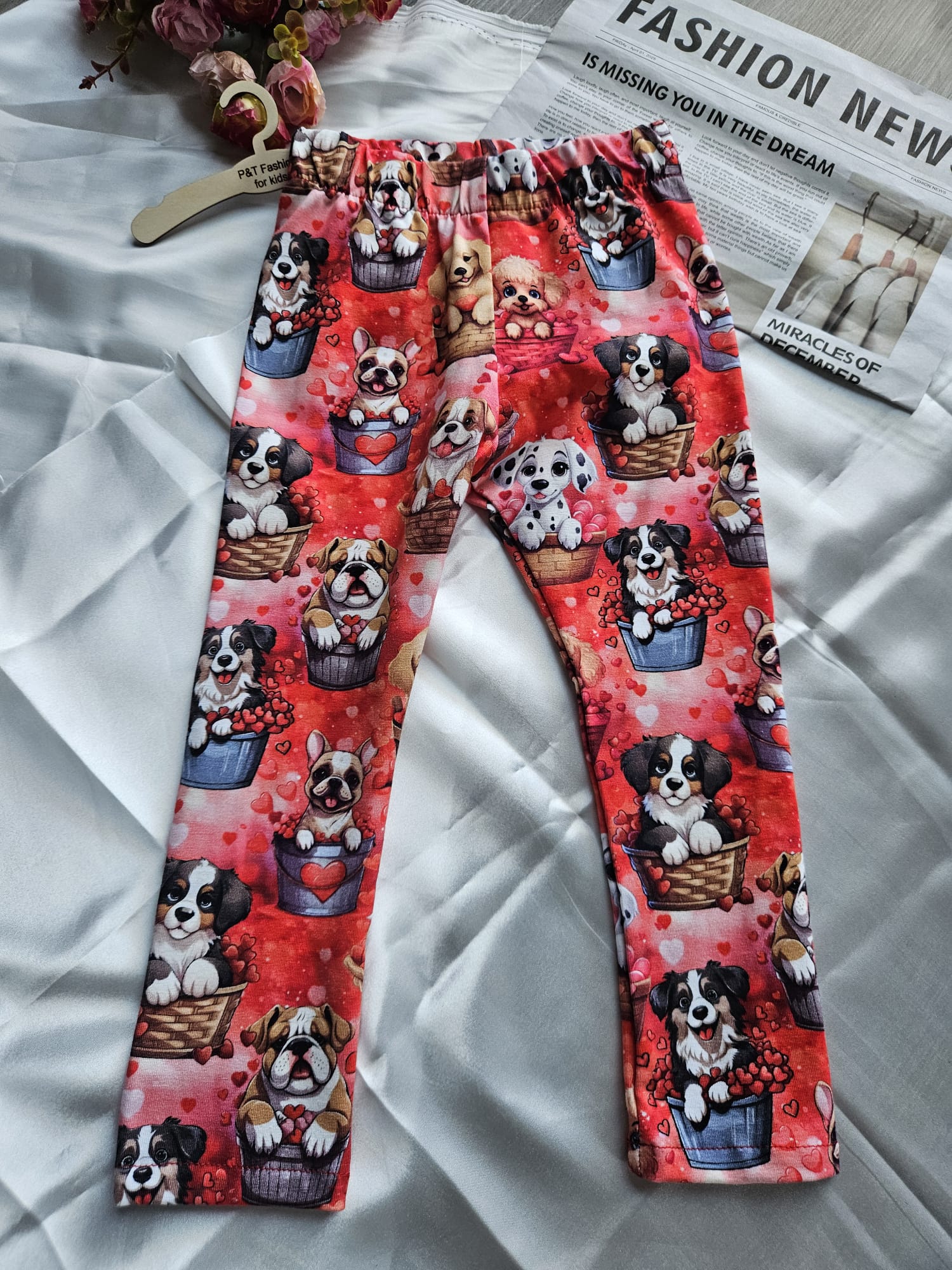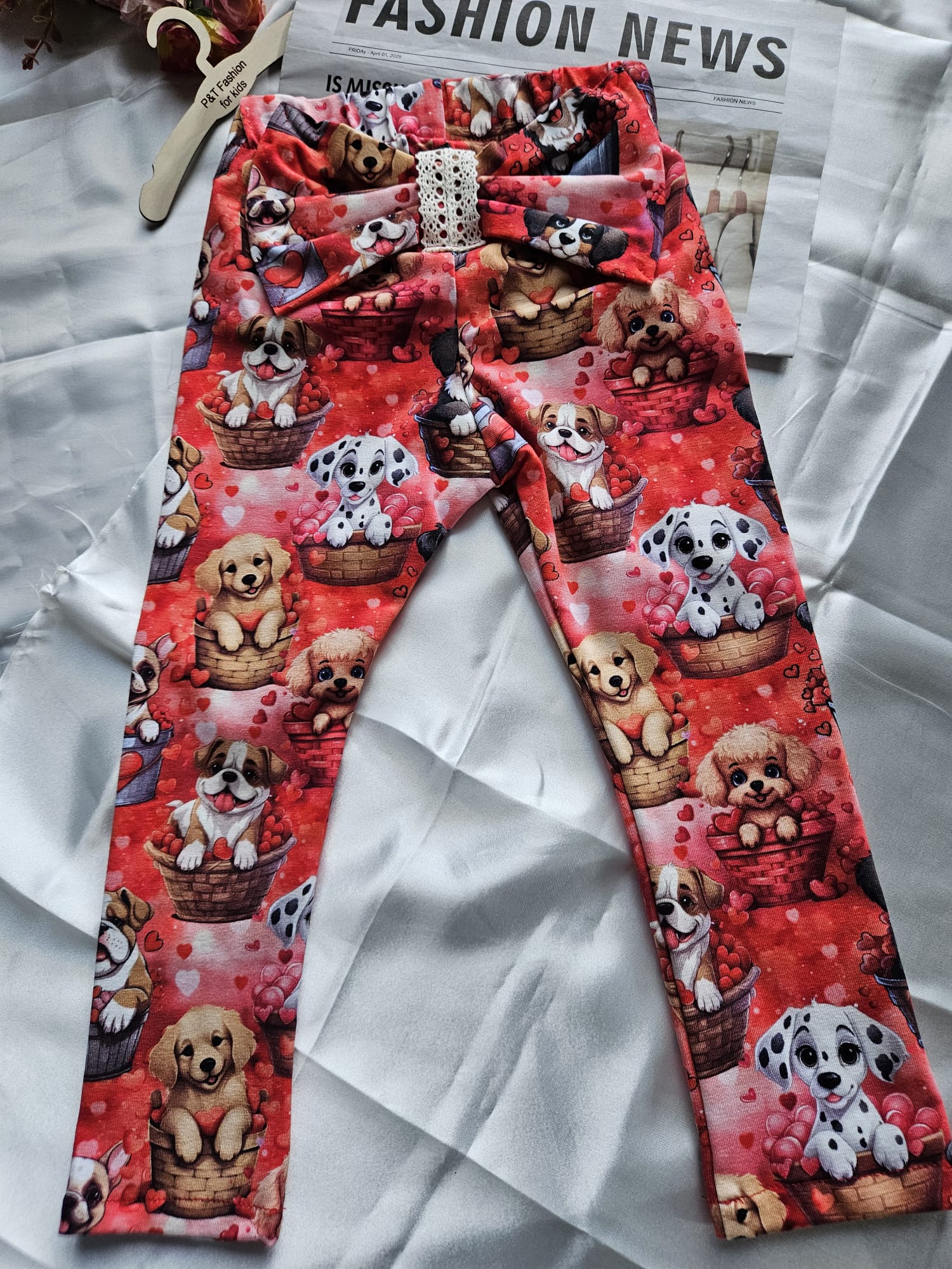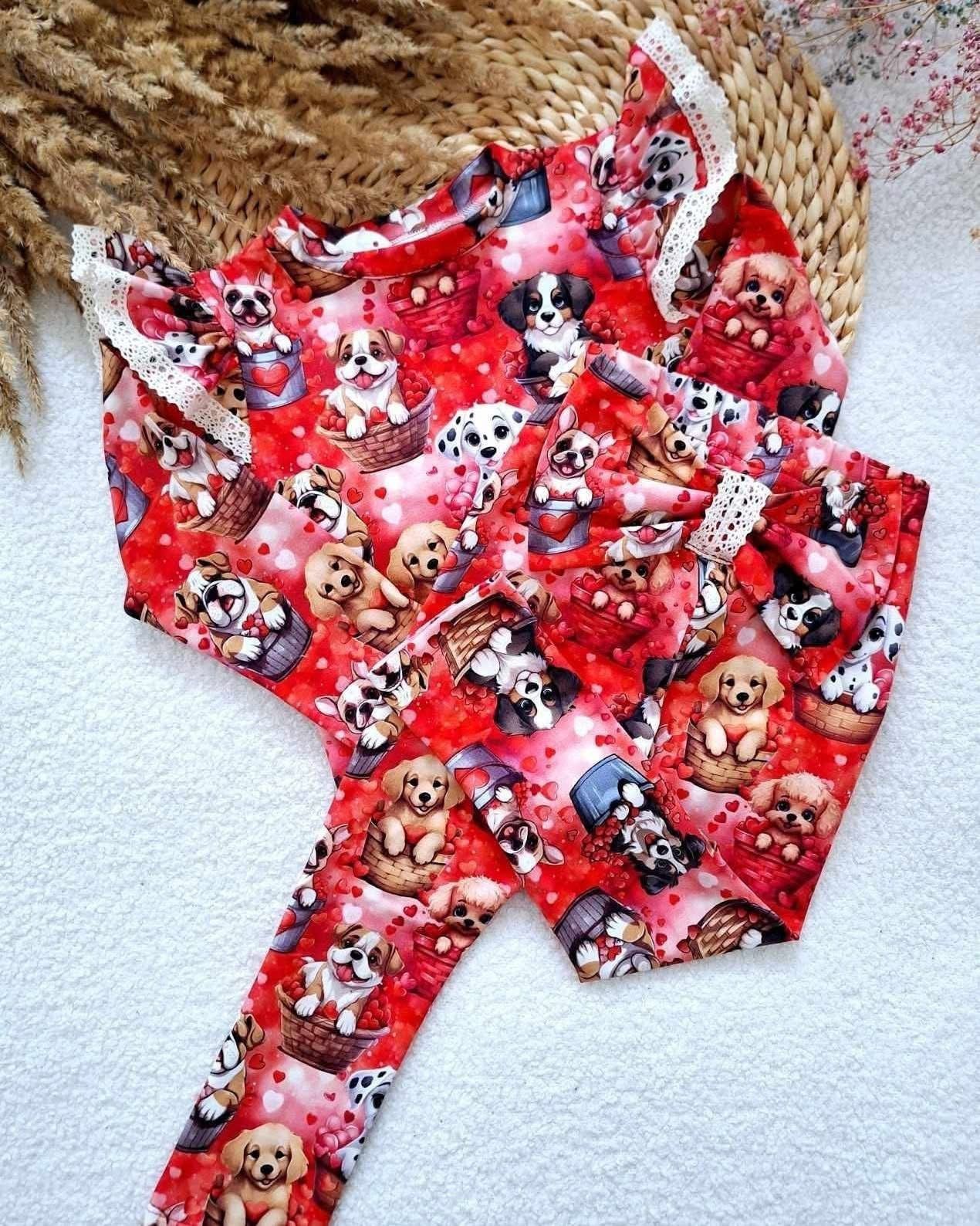 Bawełniane legginsy dla dziewczynki w czerwonym kolorze, ozdobione uroczym wzorem w pieski i serduszka. Z tyłu znajduje się dekoracyjna kokardka na pupie, która dodaje im wyjątkowego, dziewczęcego uroku. Miękka, oddychająca bawełna zapewnia komfort noszenia przez cały dzień – idealne do zabawy, spacerów i codziennych stylizacji.