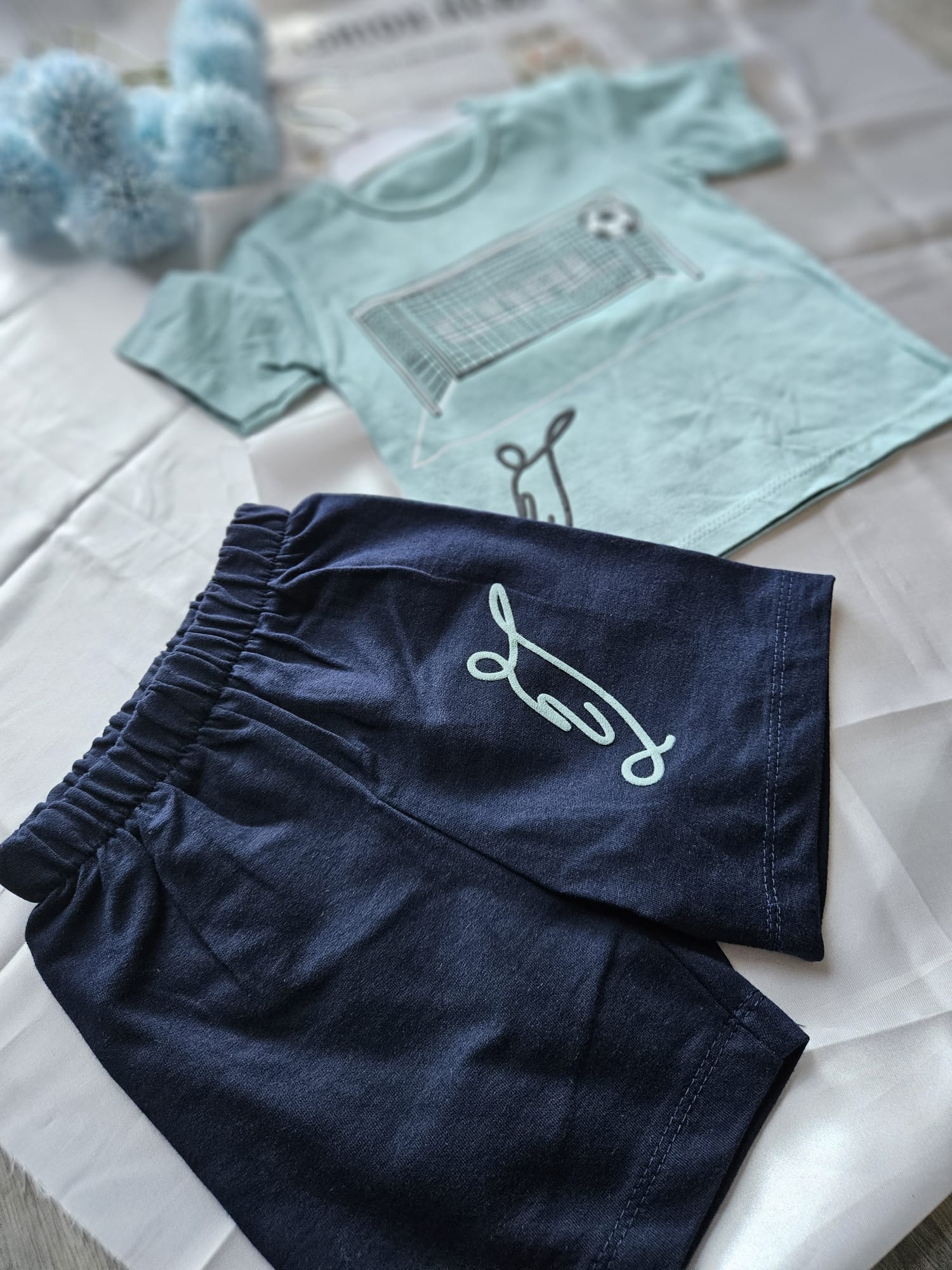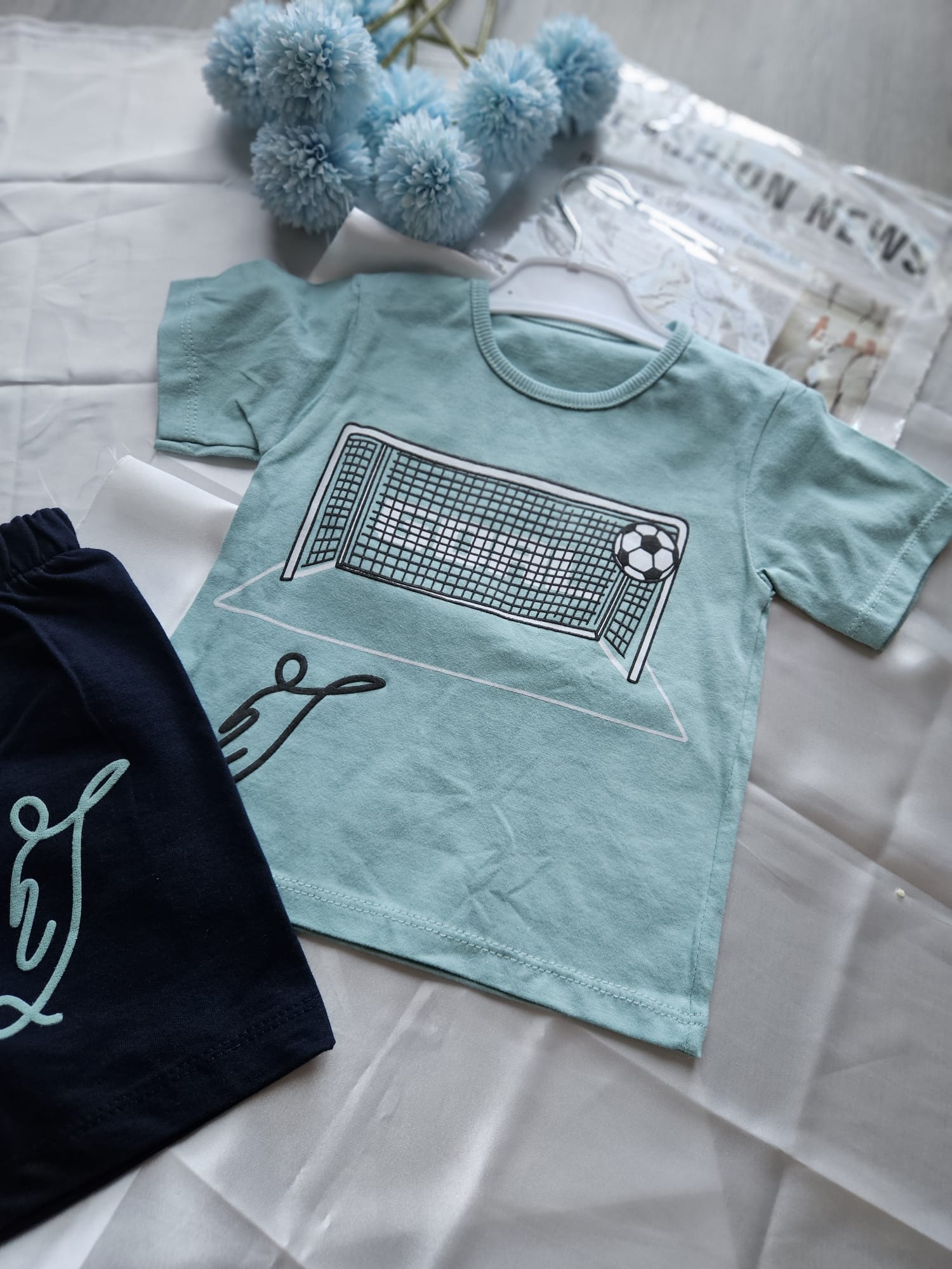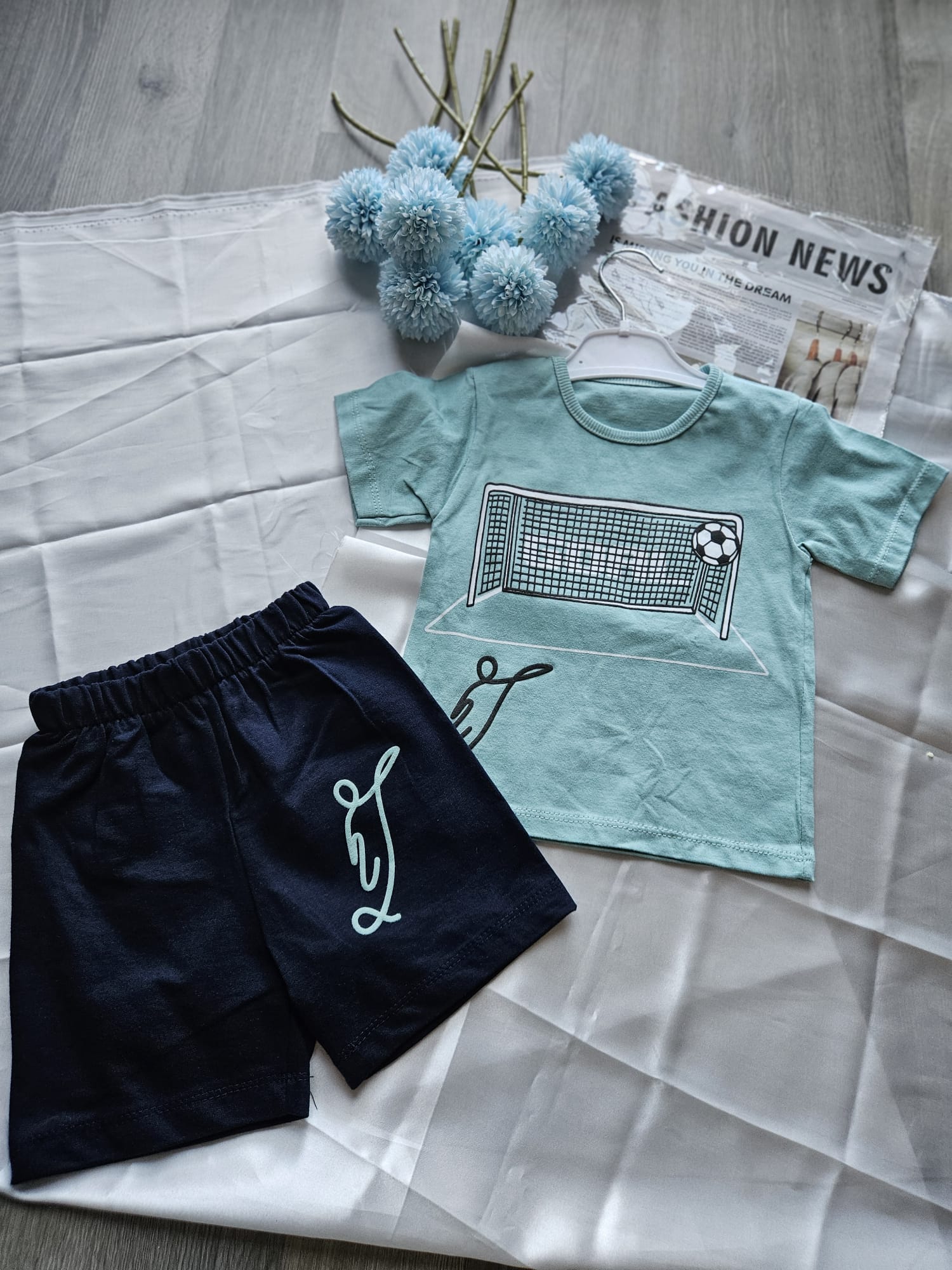 Sportowy komplet dla małego fana piłki ! Zielona koszulka z aplikacją bramki i piłki na przodzie dodaje energii i zachęca do zabawy, a wygodne spodenki gwarantują swobodę ruchów podczas aktywności i codziennych przygód.