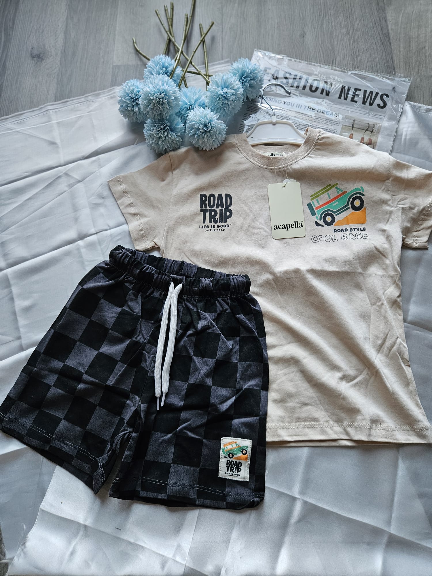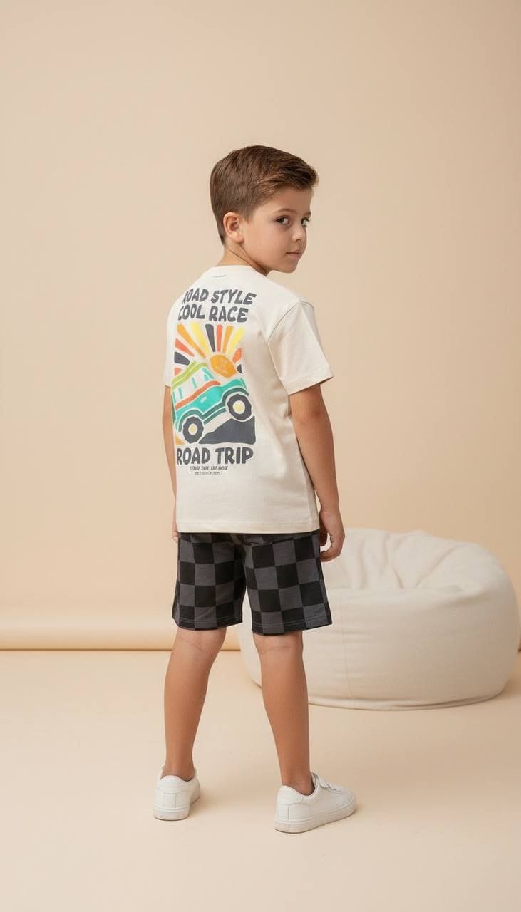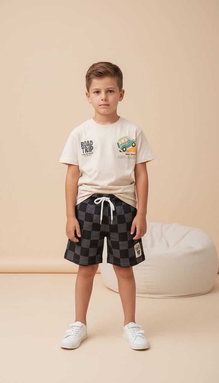 Letni komplet dla chłopca pełen stylu i wygody! Koszulka idealnie komponuje się ze spodenkami w szachownicę, tworząc modny zestaw na ciepłe dni pełne zabawy i przygód.