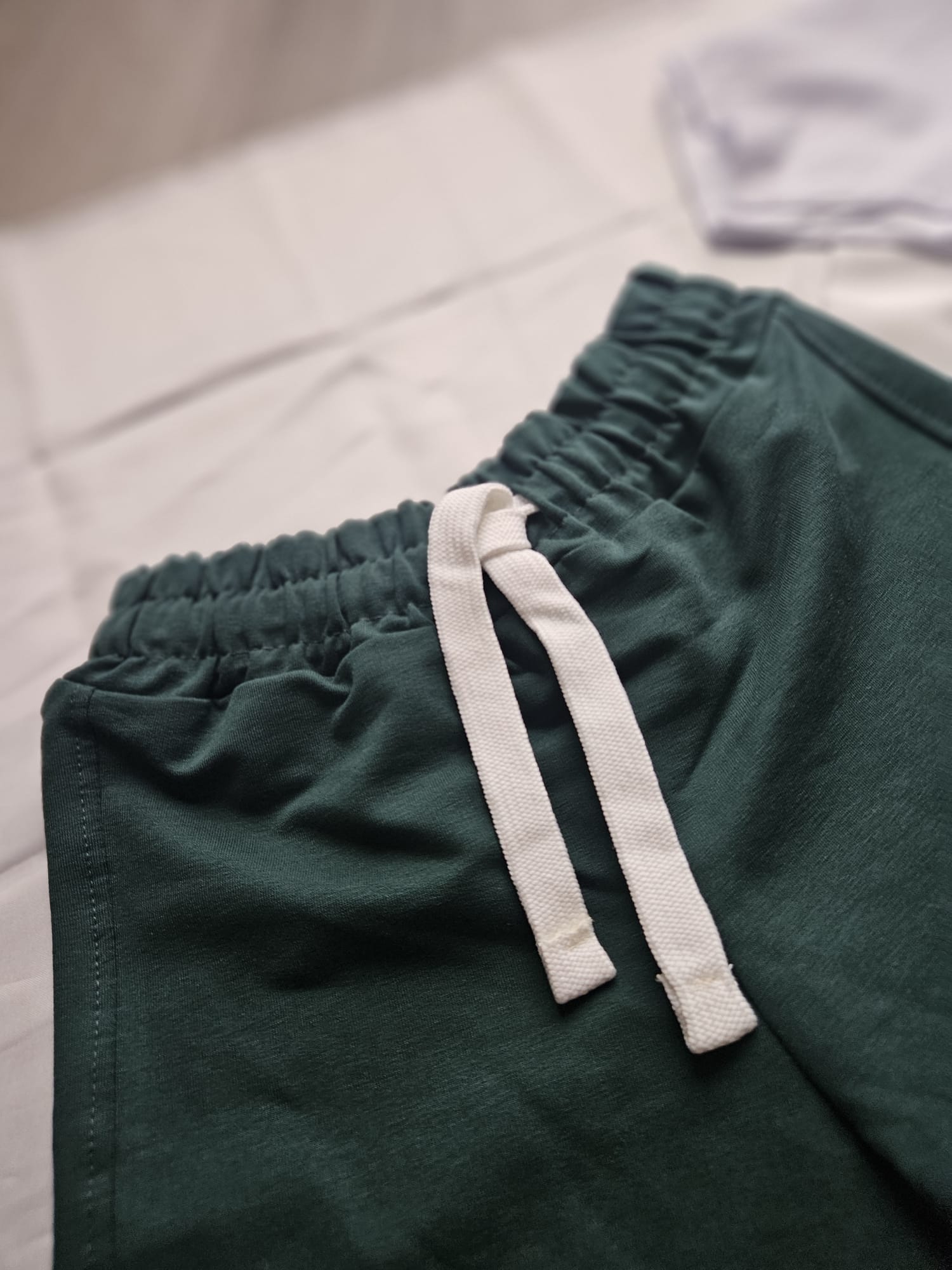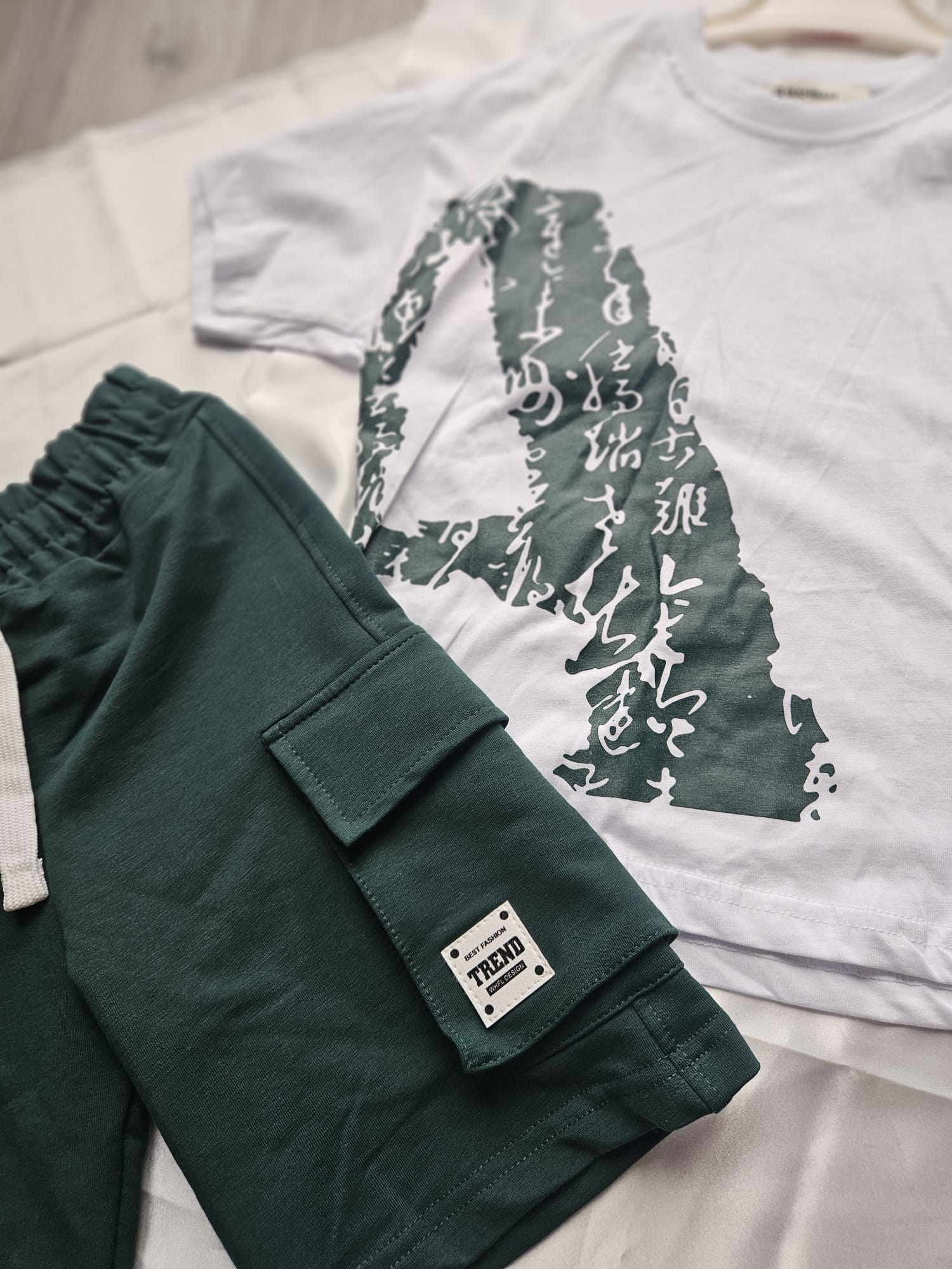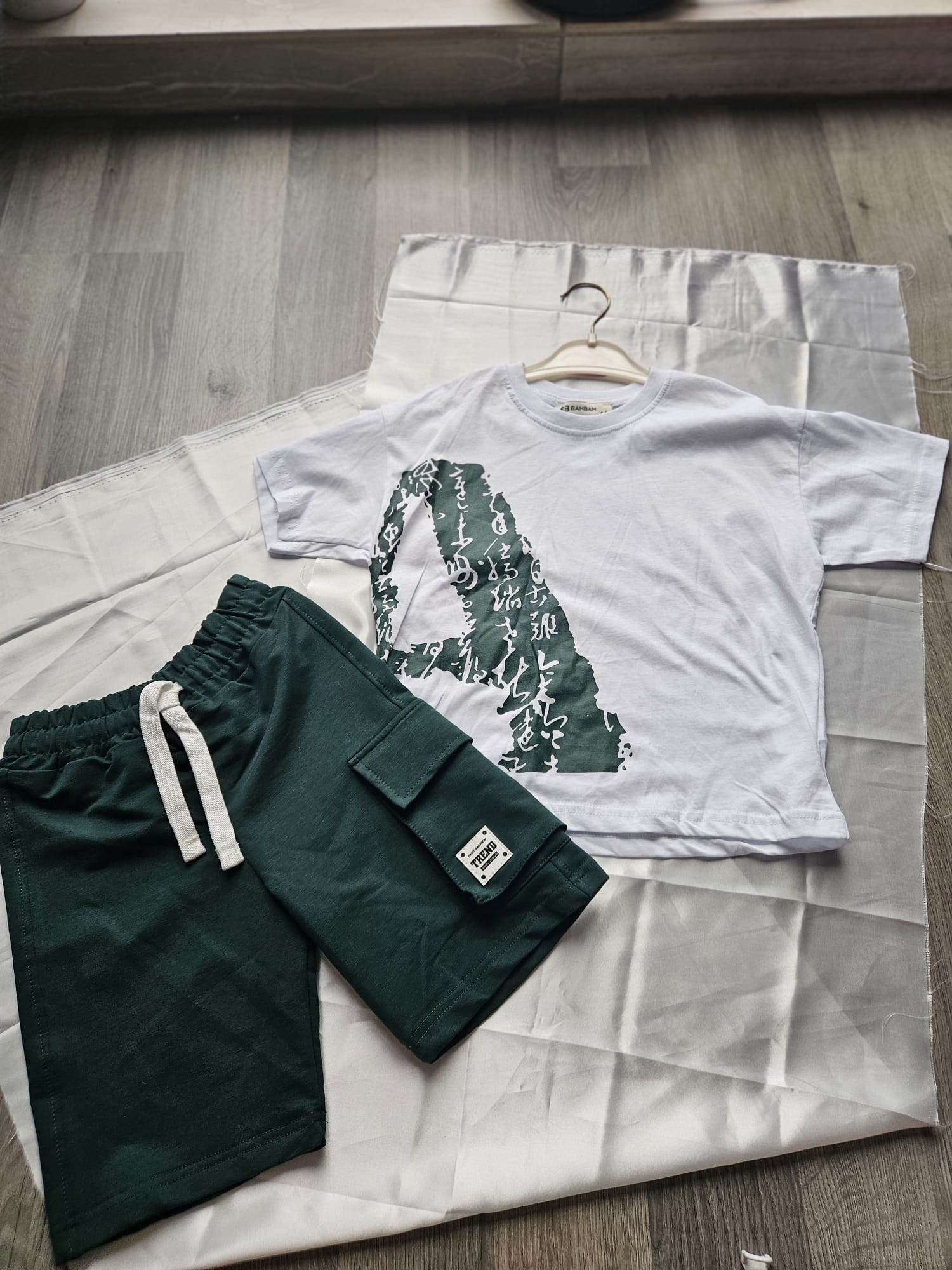 Zestaw składa się z białej koszulki z zieloną literką „A” oraz zielonych spodenek, które razem tworzą stylową i spójną całość. Lekki, komfortowy i idealny na letnie zabawy – must-have w garderobie każdego małego odkrywcy! ☀️