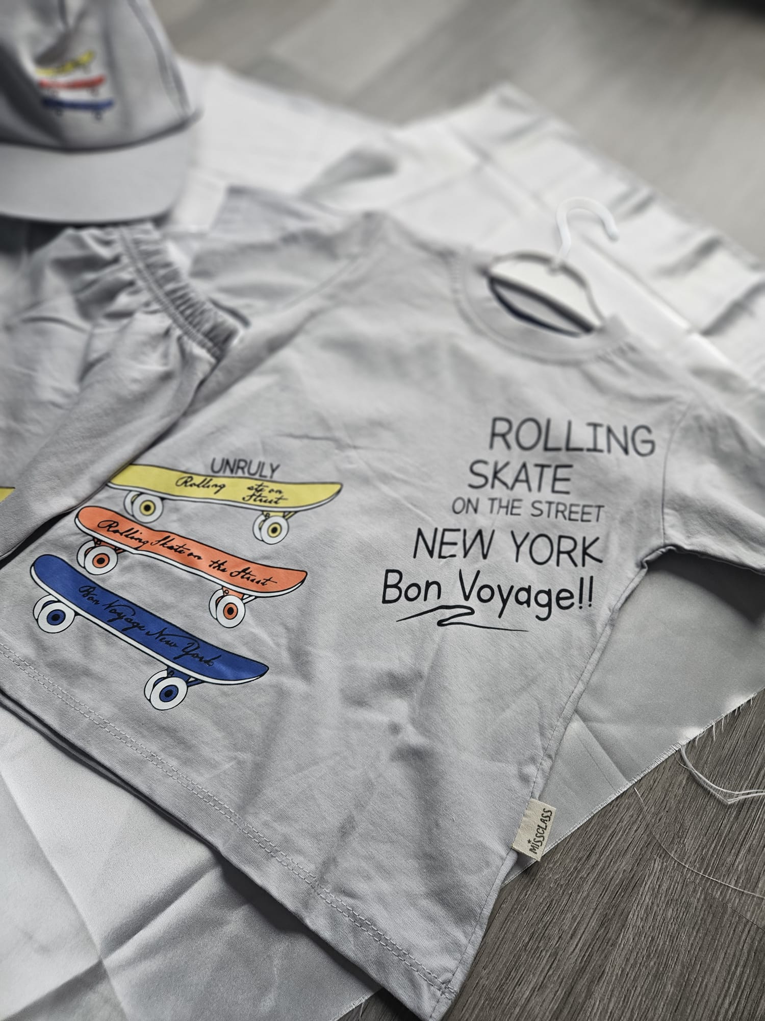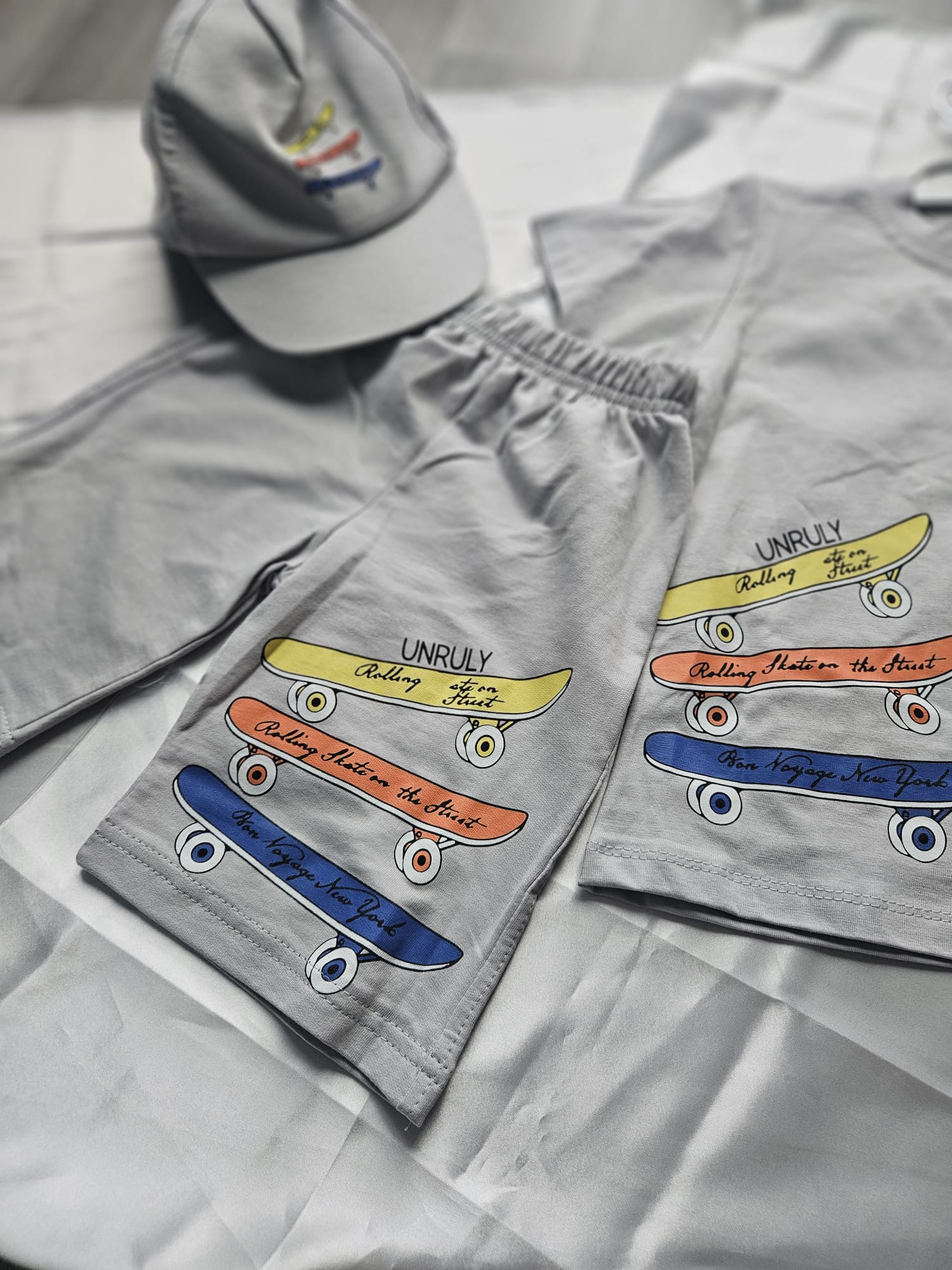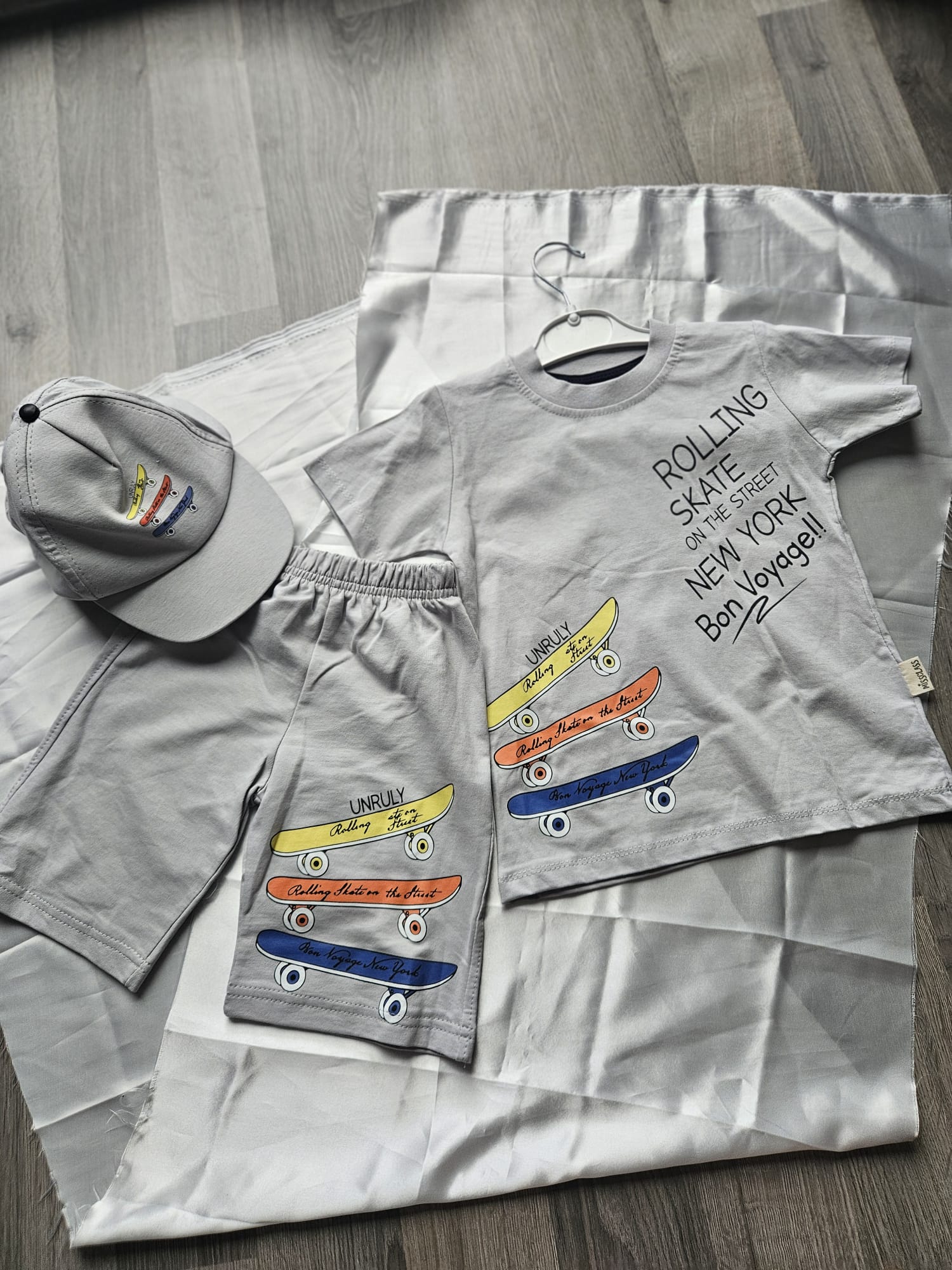 Zestaw w kolorze szarym składa się z koszulki, czapki i spodenek z modną aplikacją deskorolki. Wygodny, lekki i idealny na codzienne przygody – dla małego fana aktywnego stylu! ☀️