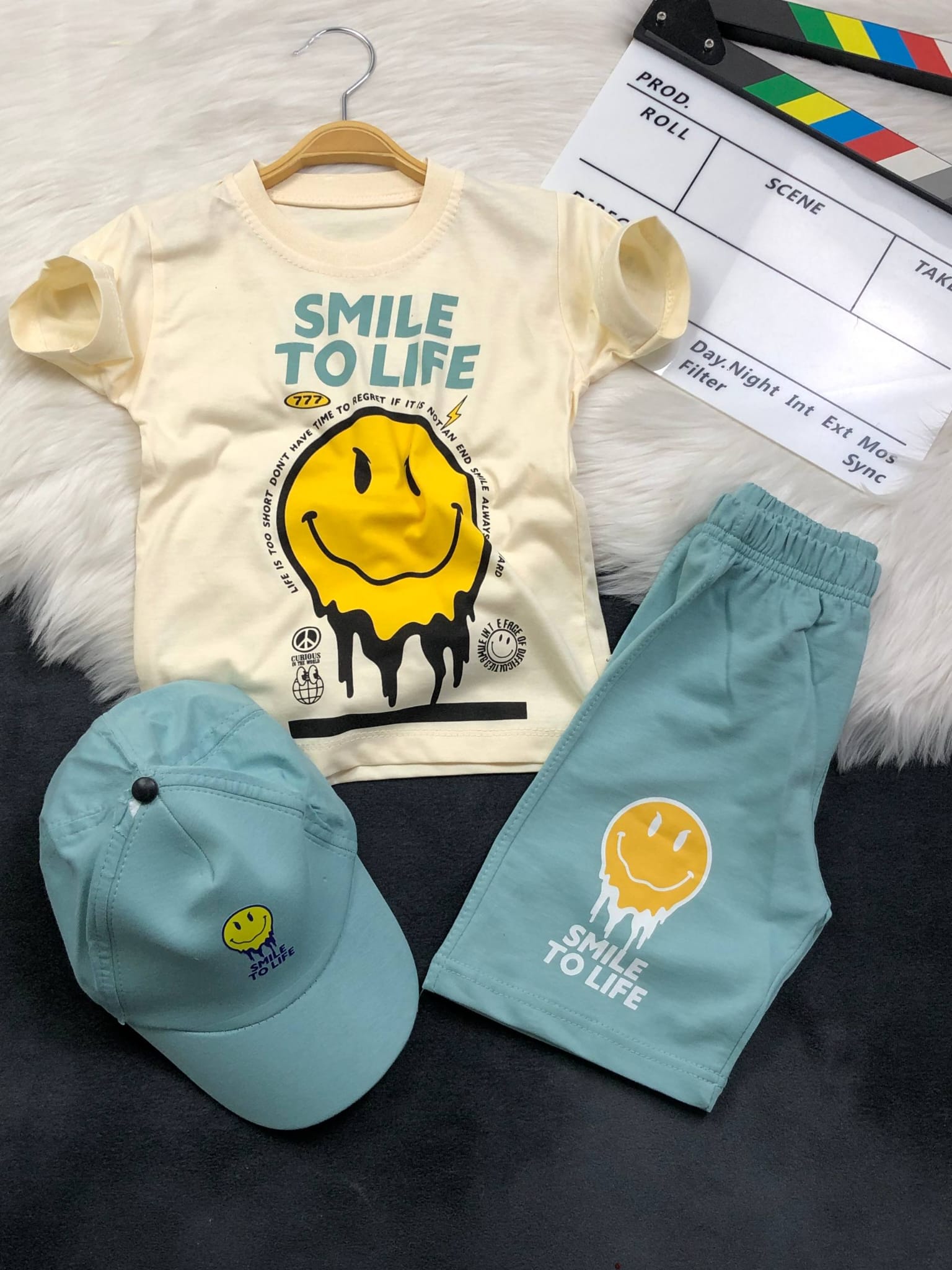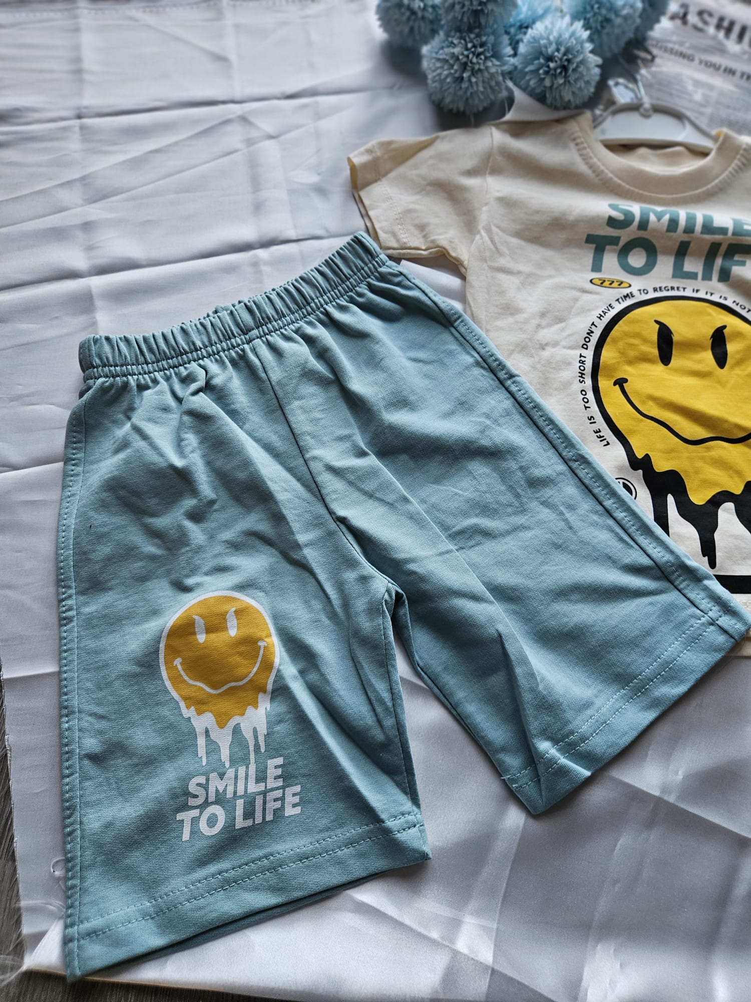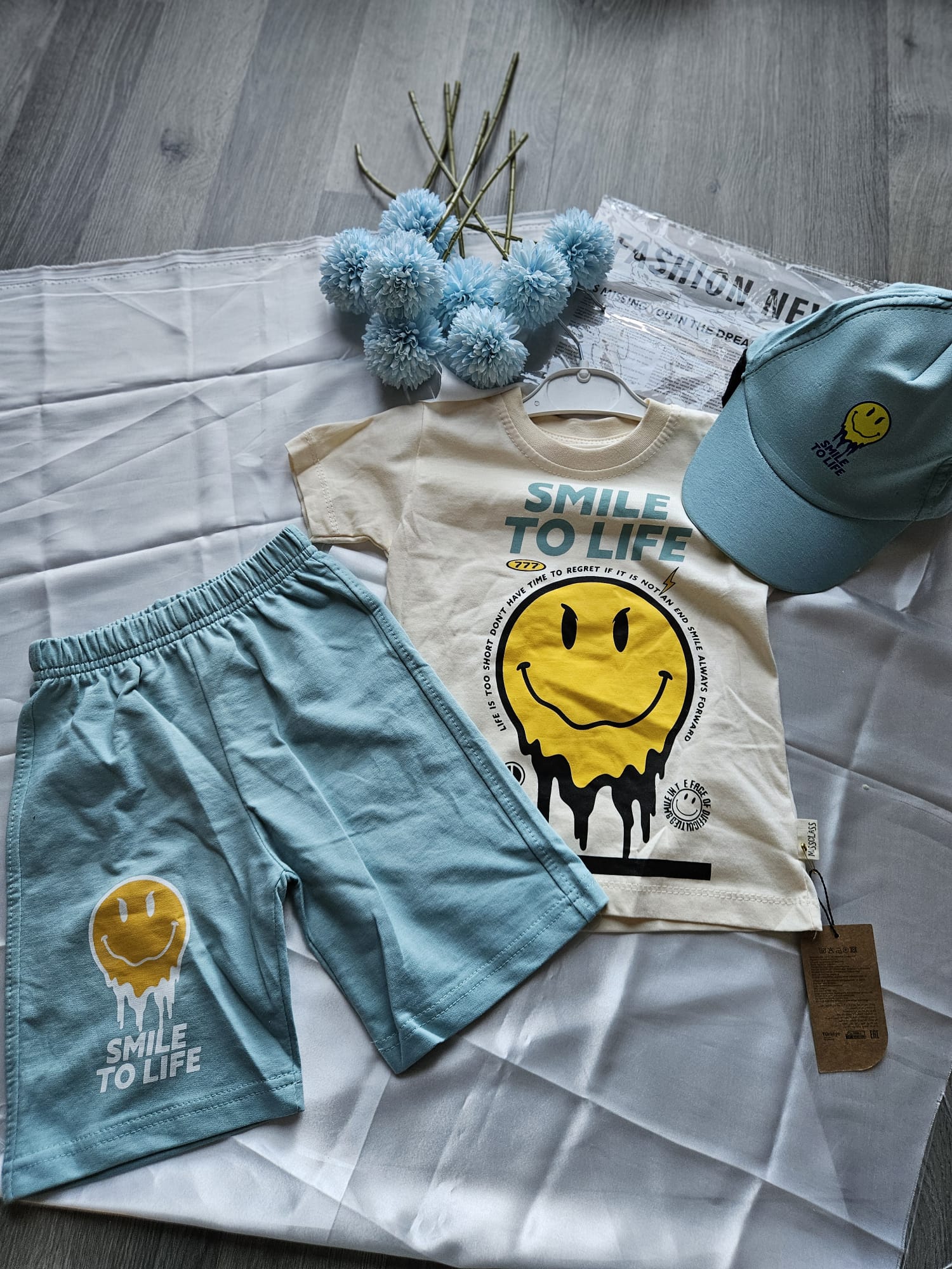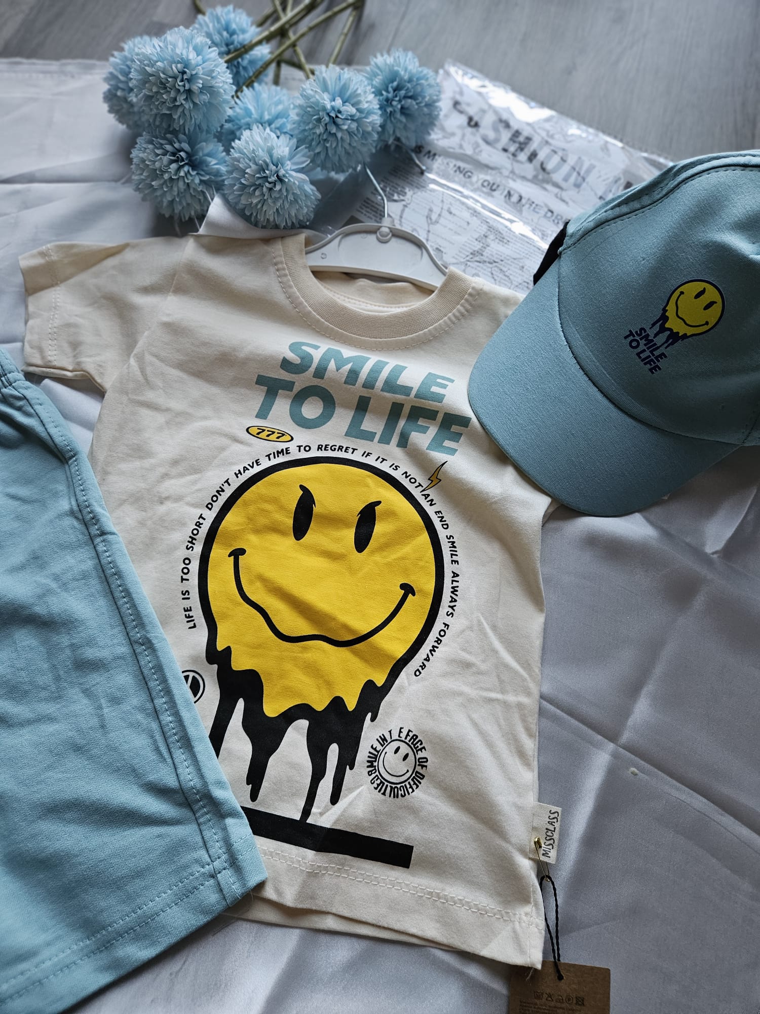 Zestaw składa się z koszulki, czapki i spodenkami z gumką w pasie tworzy idealny zestaw na lato. 🎈