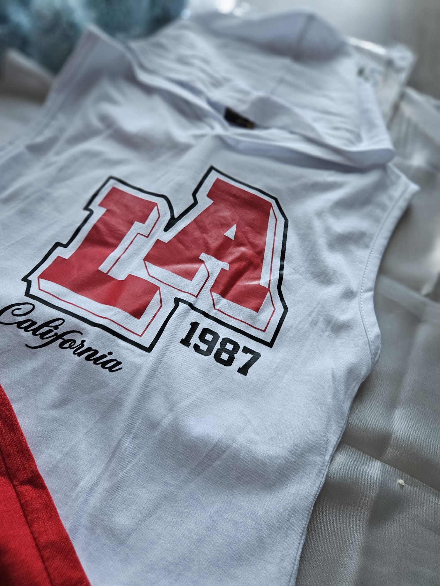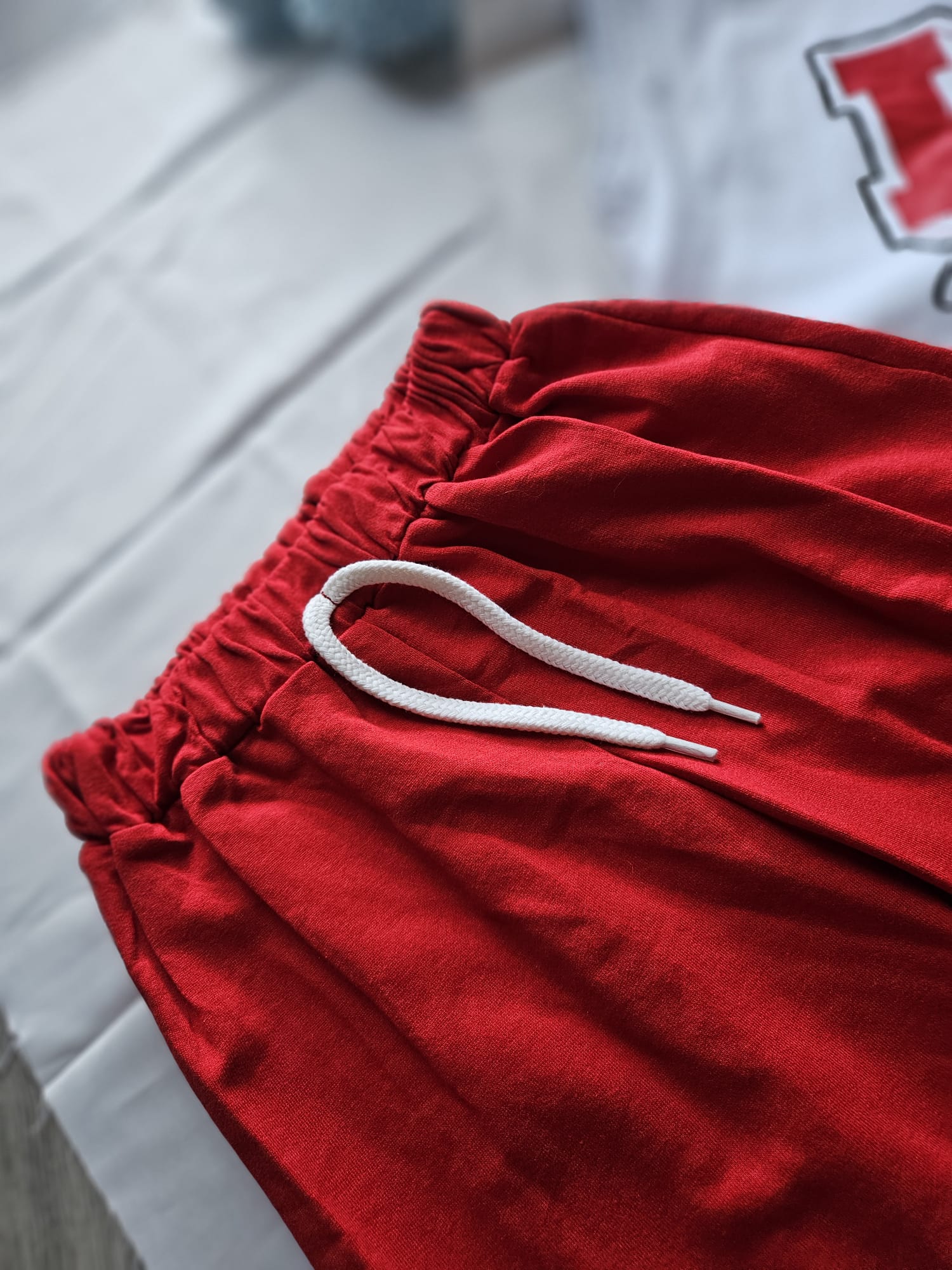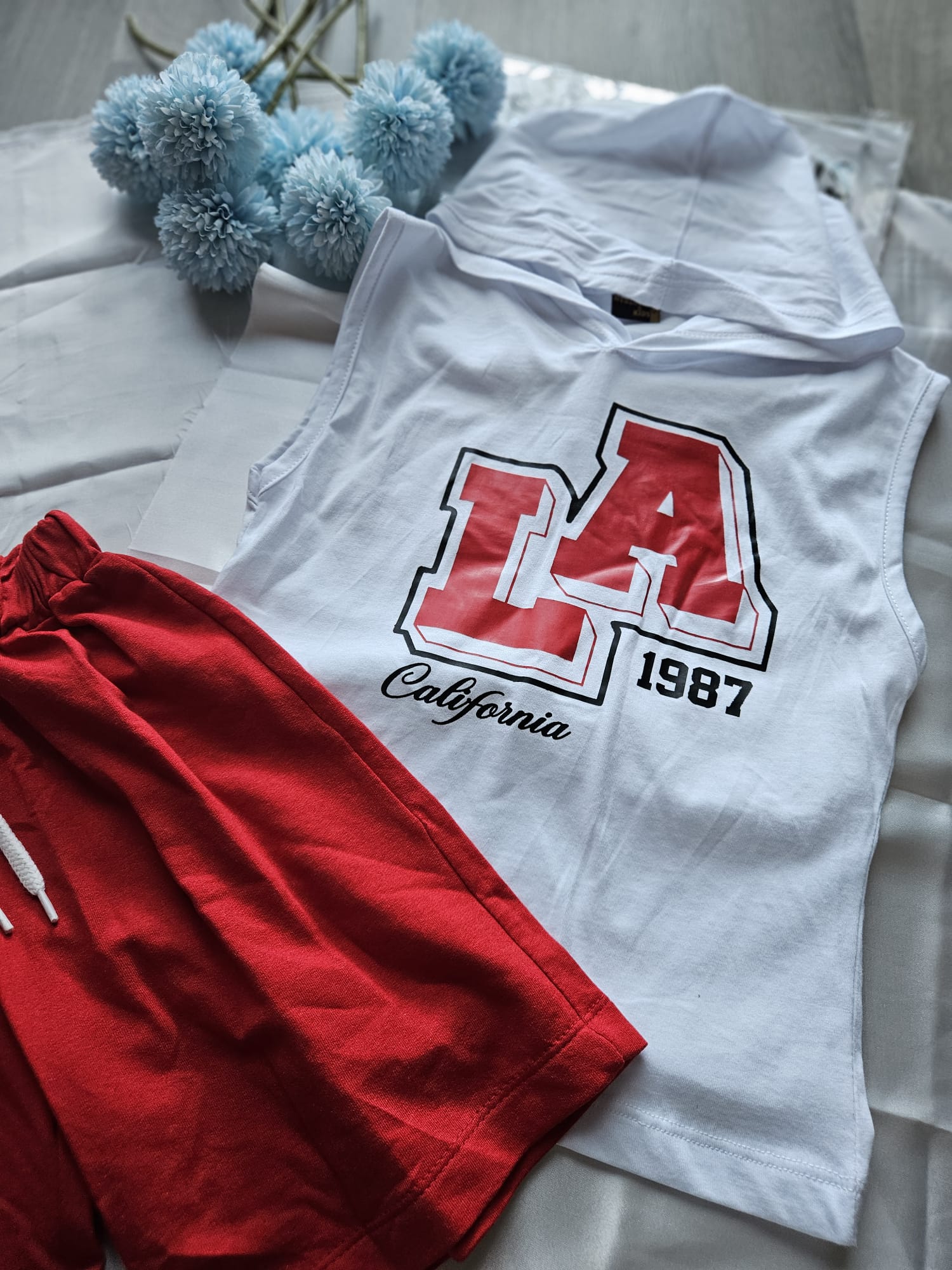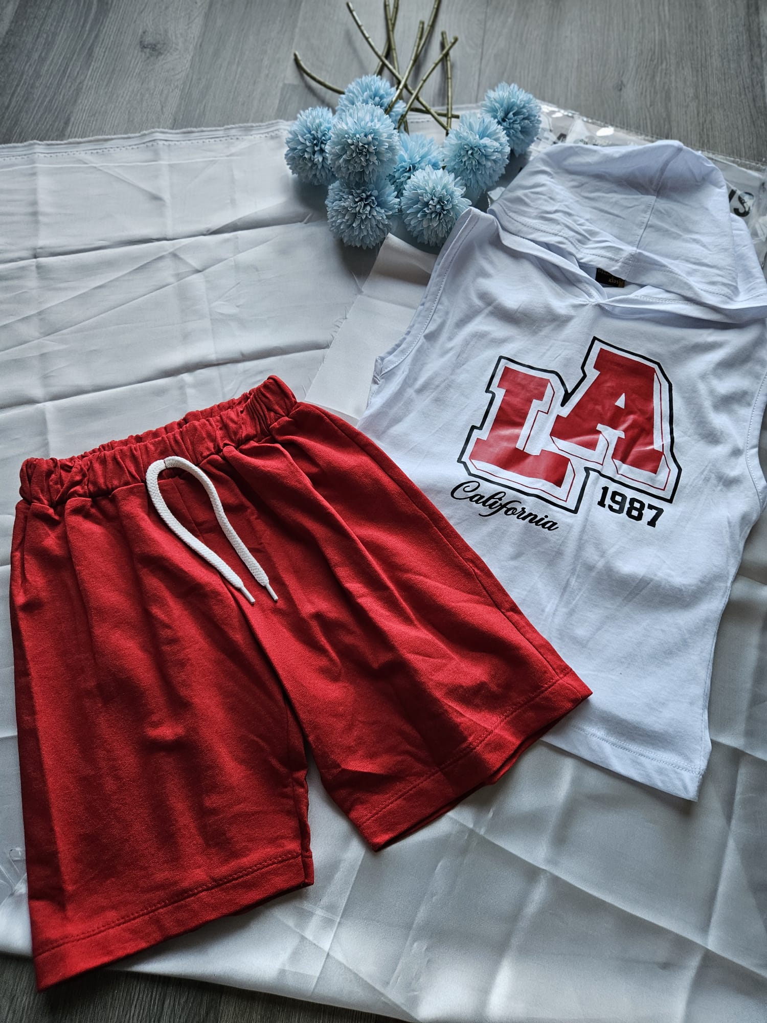 Koszulka z kapturem w zestawie z czerwonymi spodenkami z gumką w pasie to idealny wybór na ciepłe dni. Lekki, komfortowy i stworzony do aktywnej zabawy – świetnie sprawdzi się na co dzień! ☀️