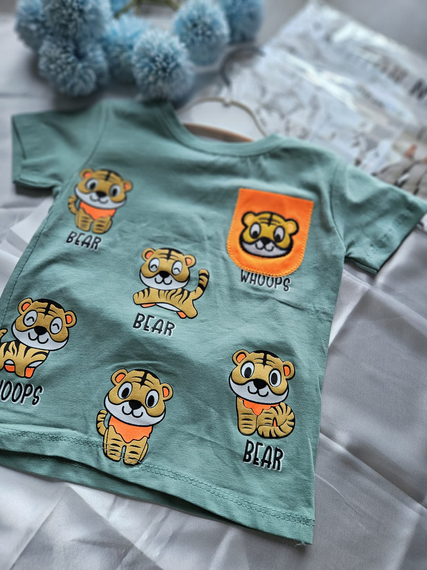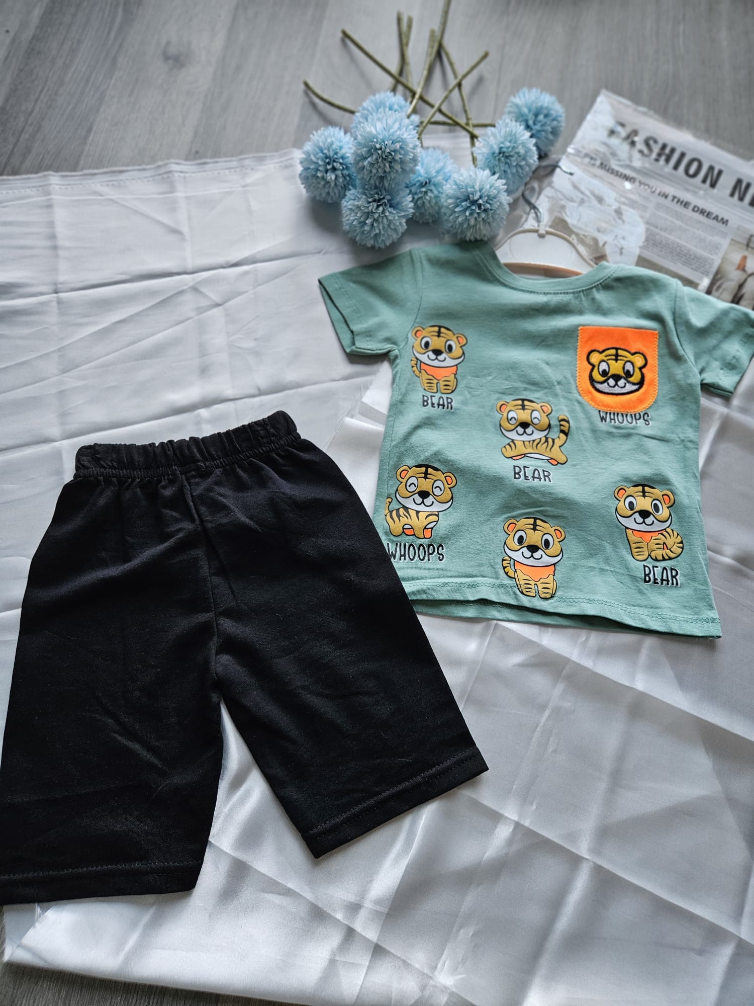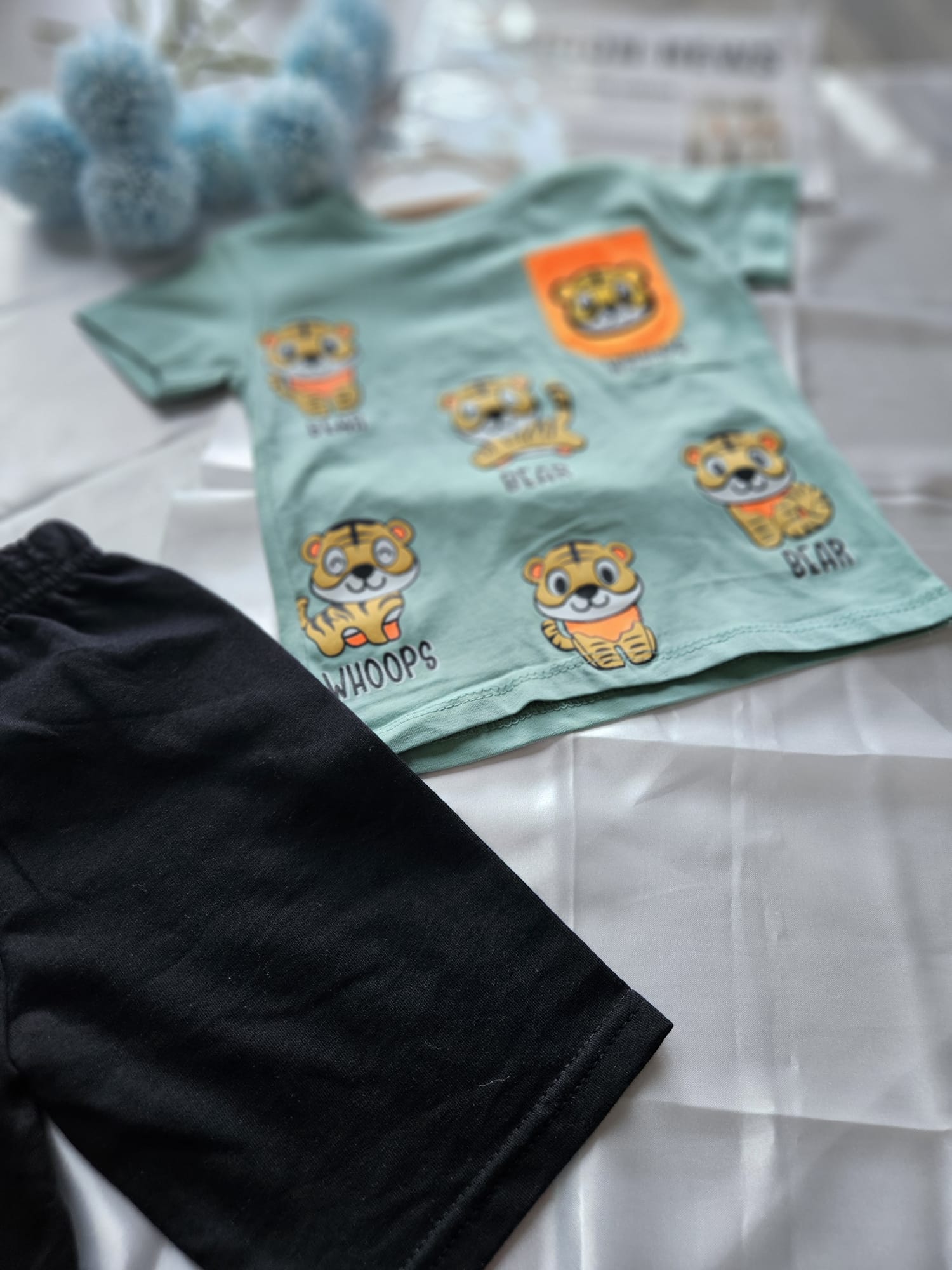 Mały tygrys, wielka frajda! Zielona koszulka w tygryski i czarne spodenki – styl i swoboda ruchu.
