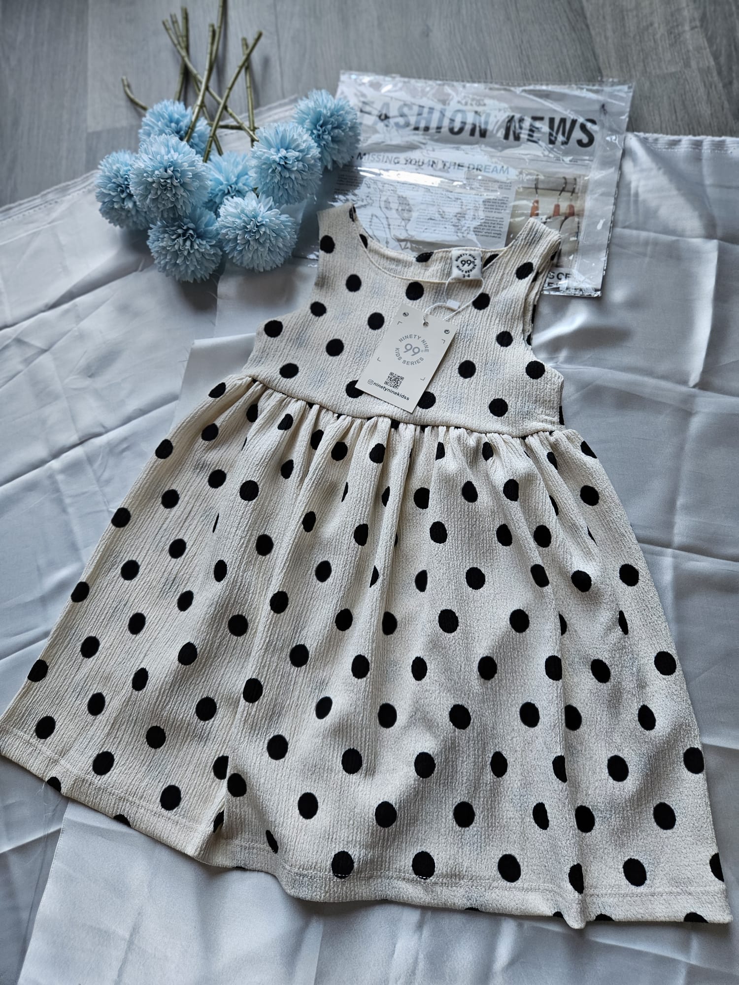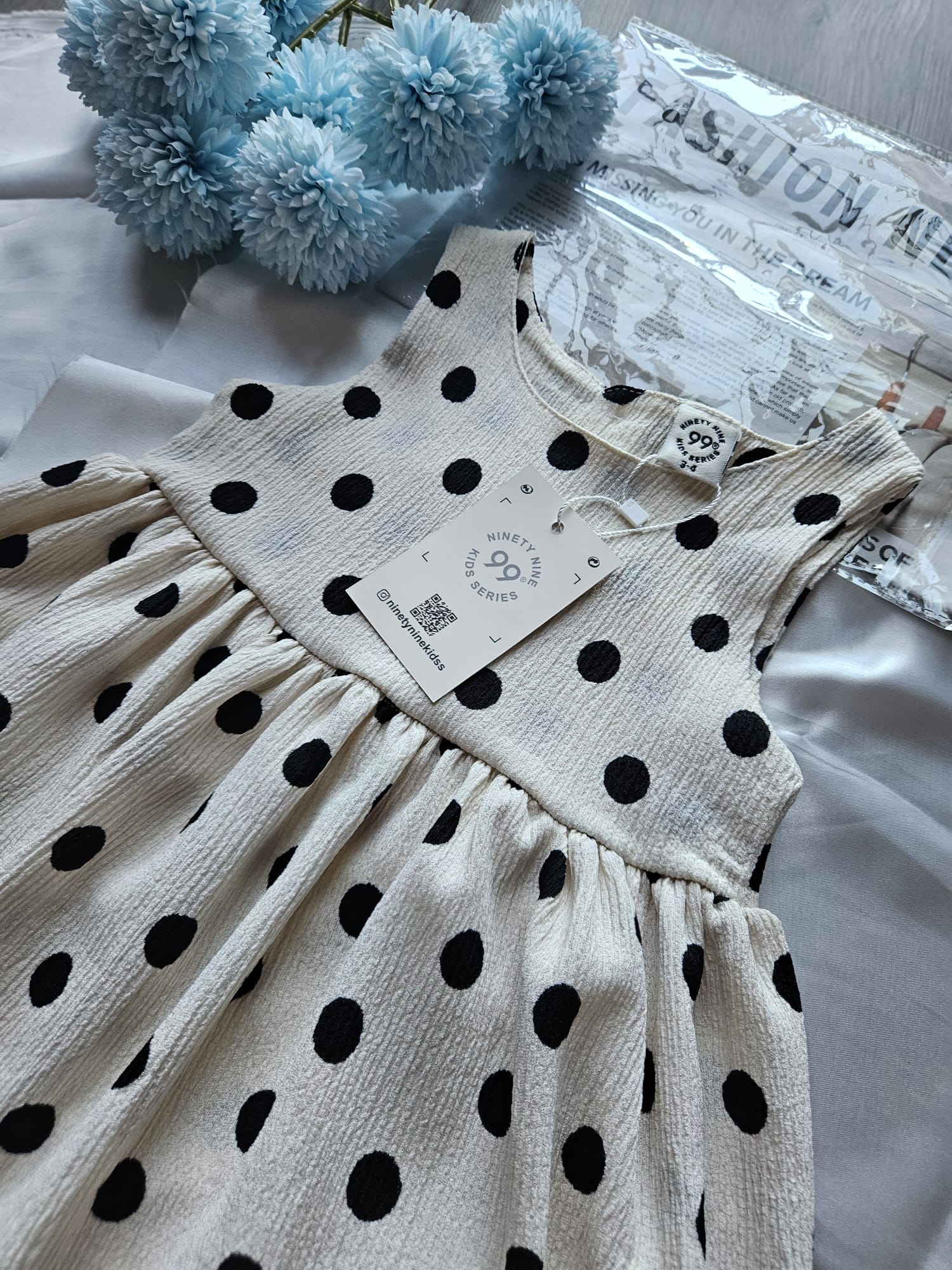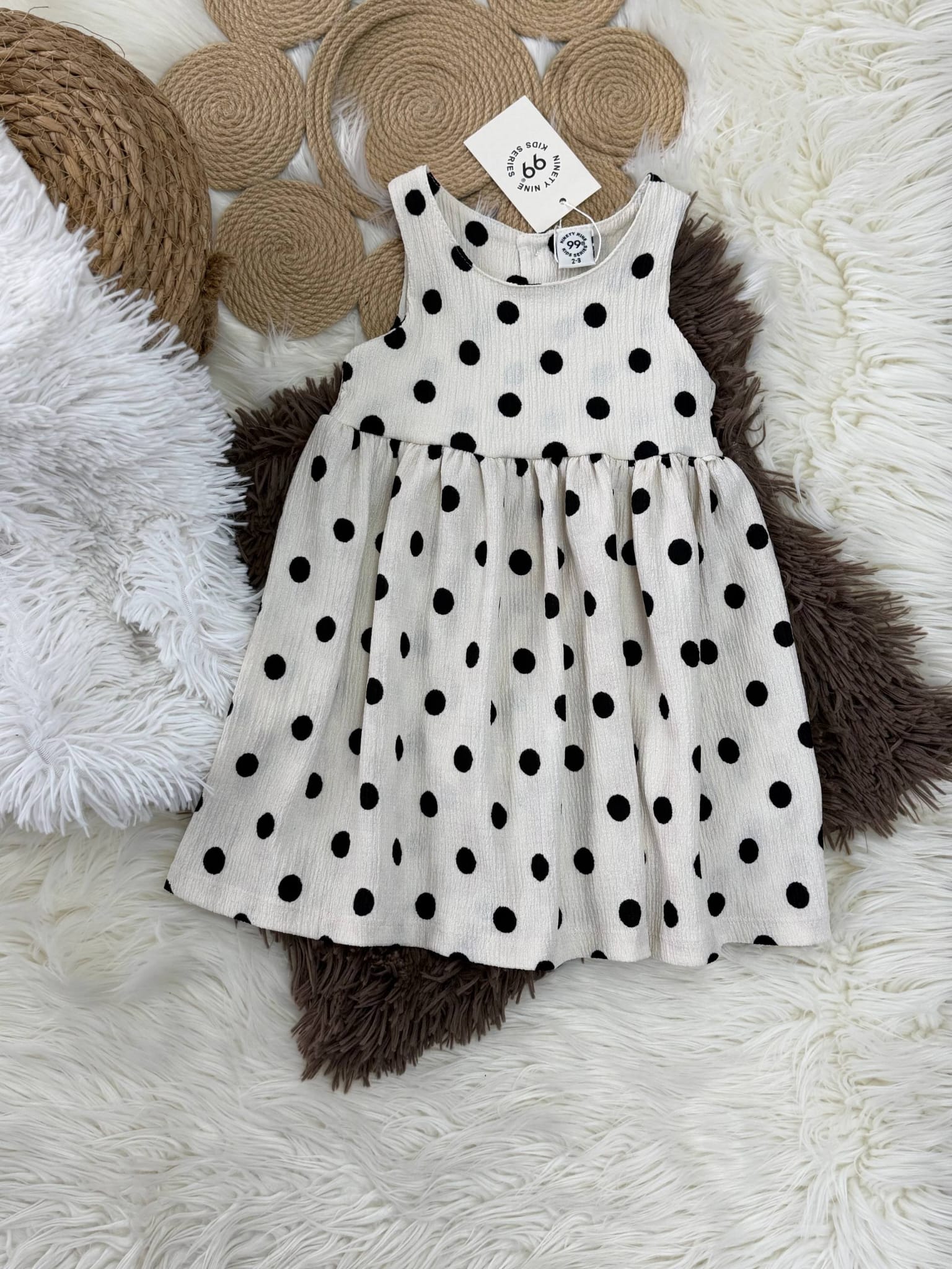 Urocza letnia sukienka dla dziewczynki! Biały materiał w groszki dodaje lekkości i słodkiego charakteru, a praktyczne zapięcie na plecach zapewnia wygodne zakładanie i zdejmowanie. Idealna na słoneczne dni pełne zabawy i przygód.