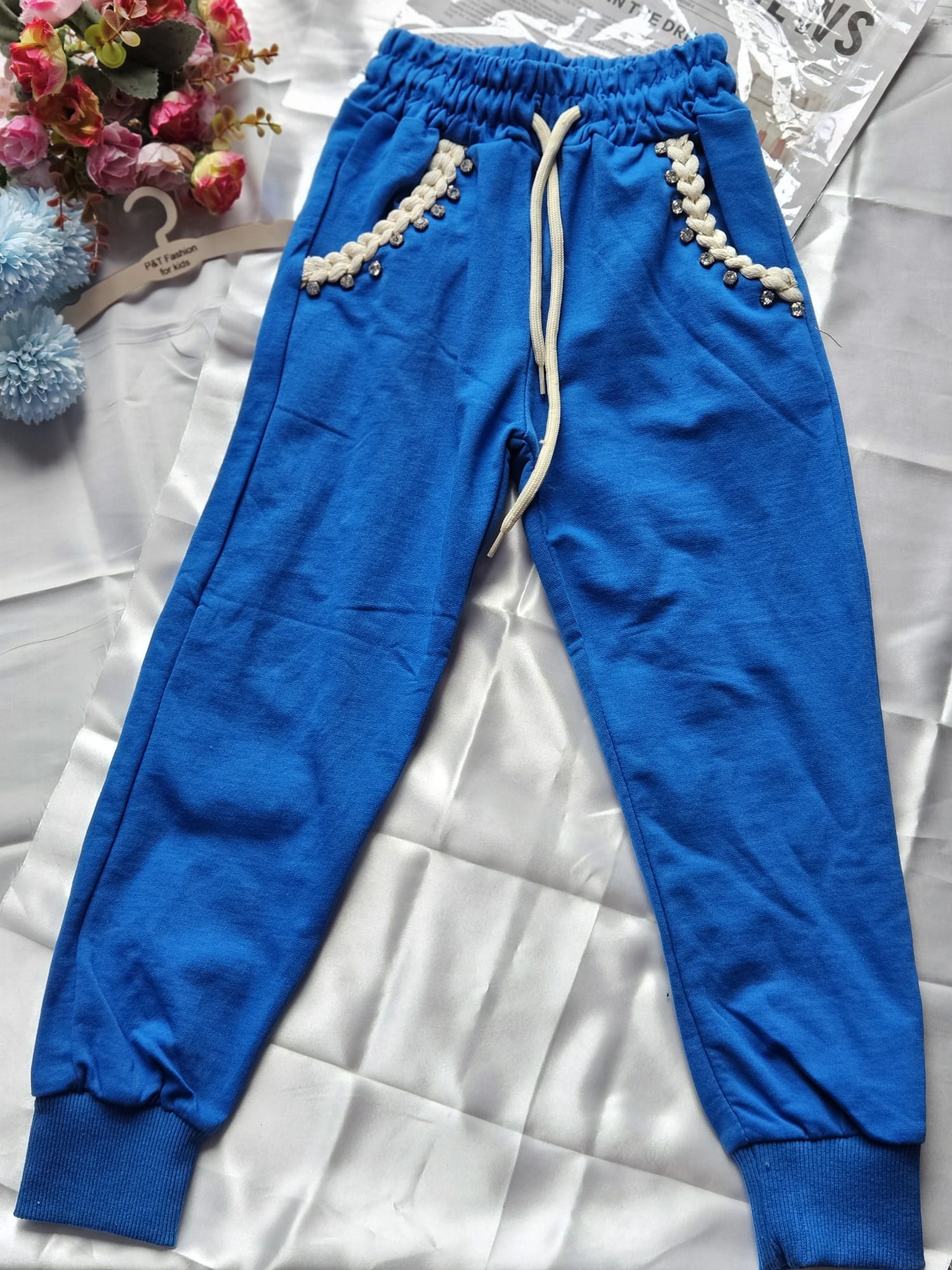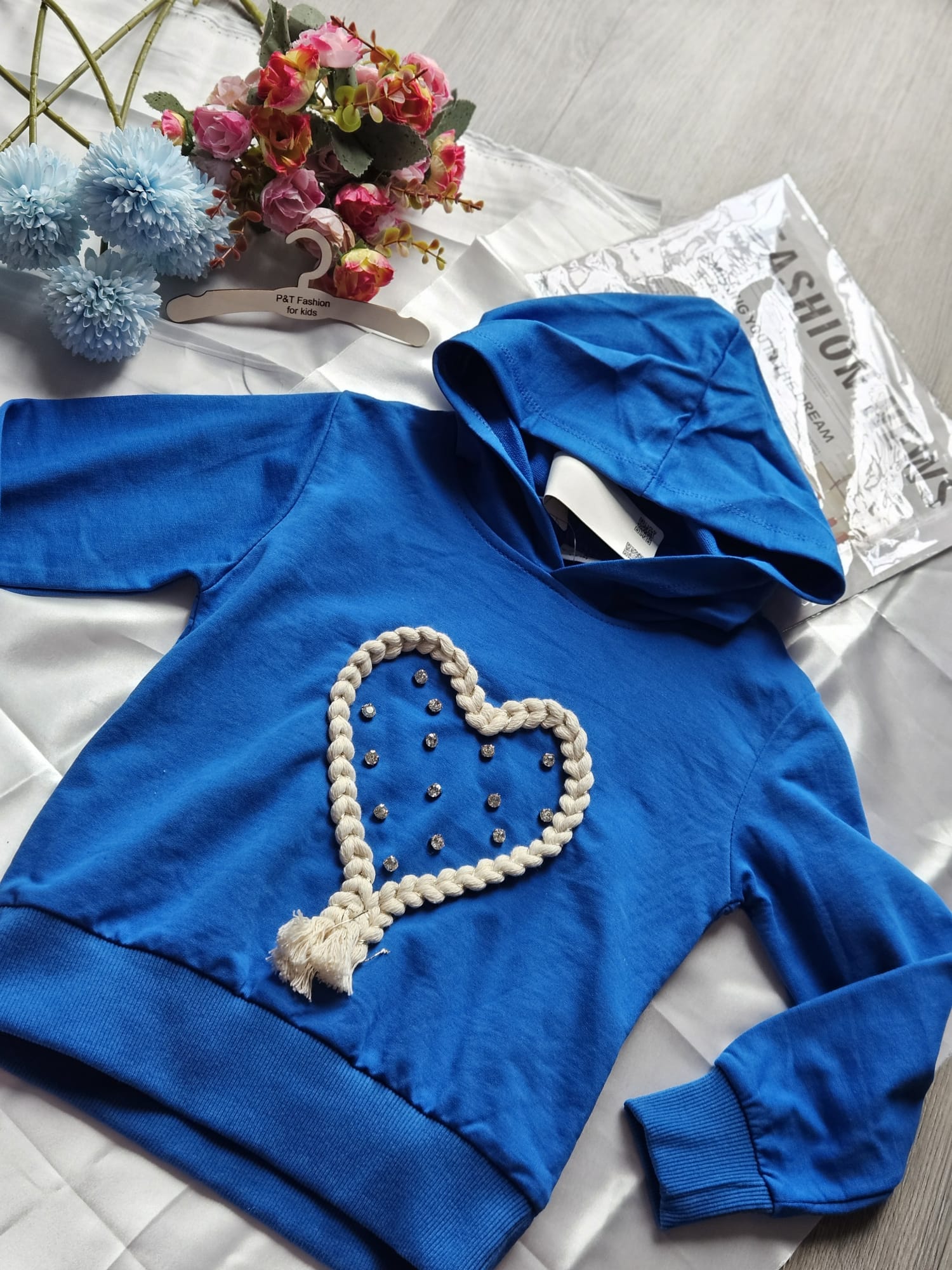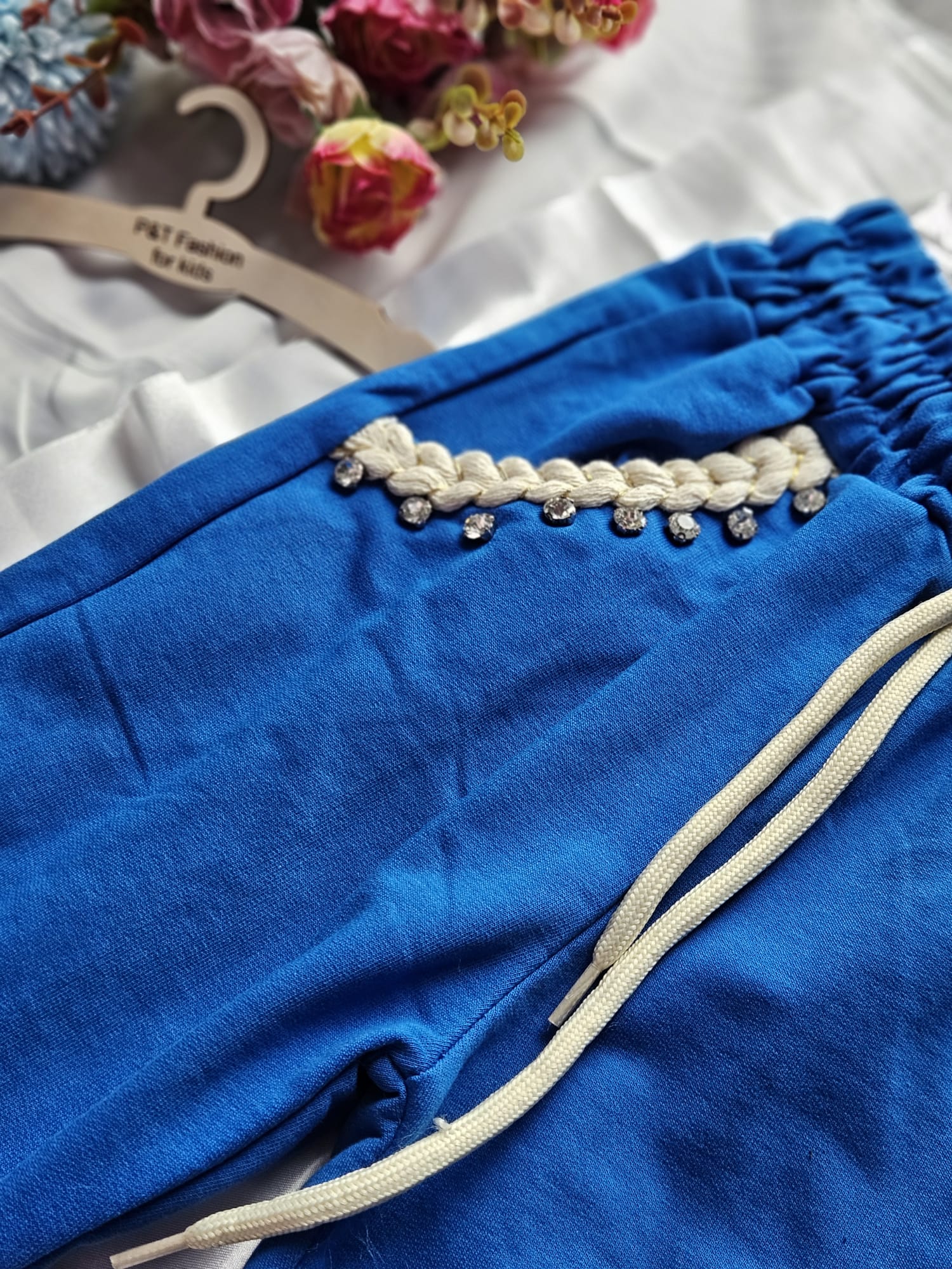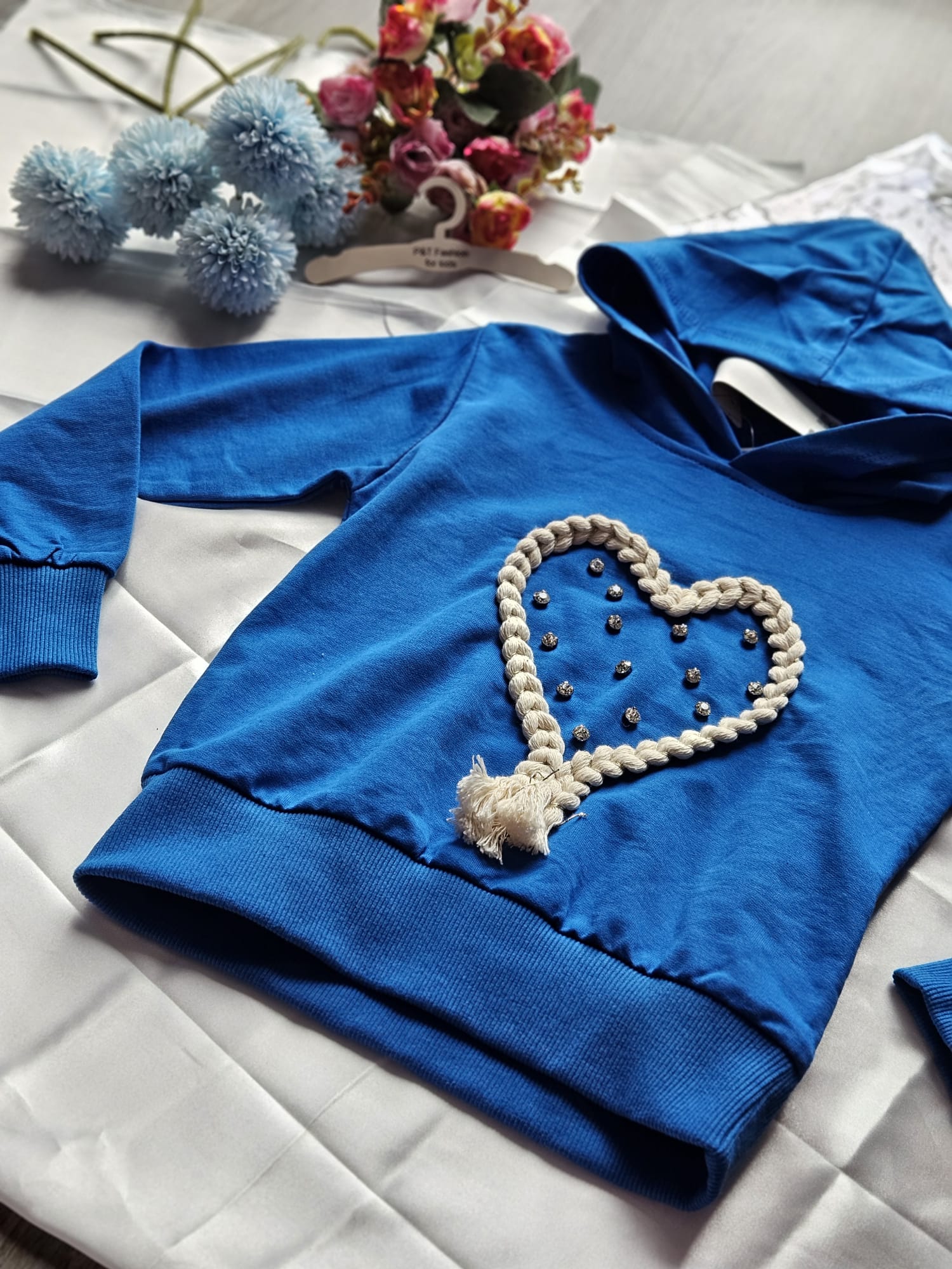 Modny komplet dresowy dla dziewczynki w intensywnym niebieskim kolorze. Bluza z kapturem ozdobiona efektowną aplikacją serca z dekoracyjnym wykończeniem. Spodnie z elastyczną gumką w pasie oraz ściągaczami przy nogawkach zapewniają wygodę noszenia.