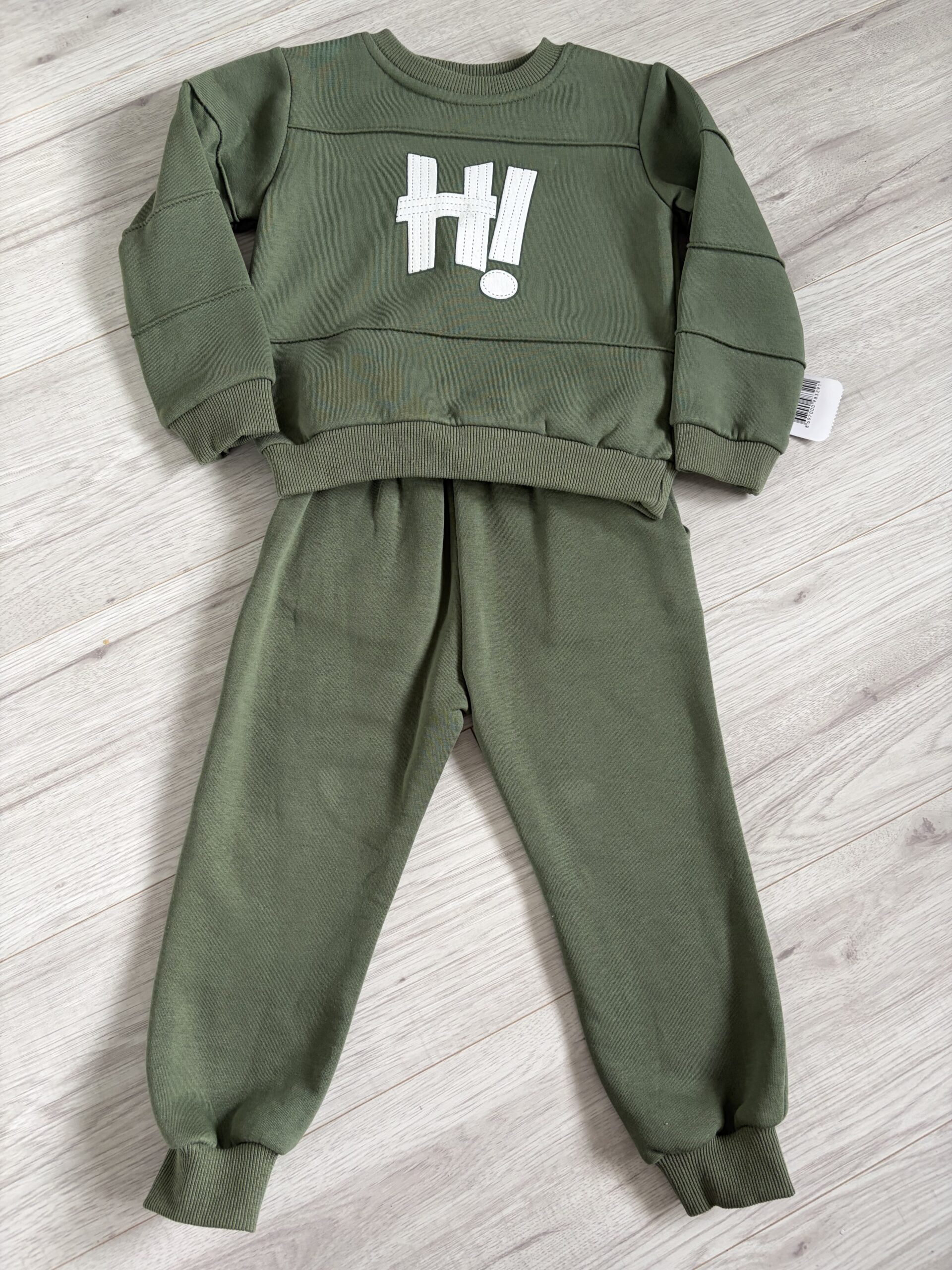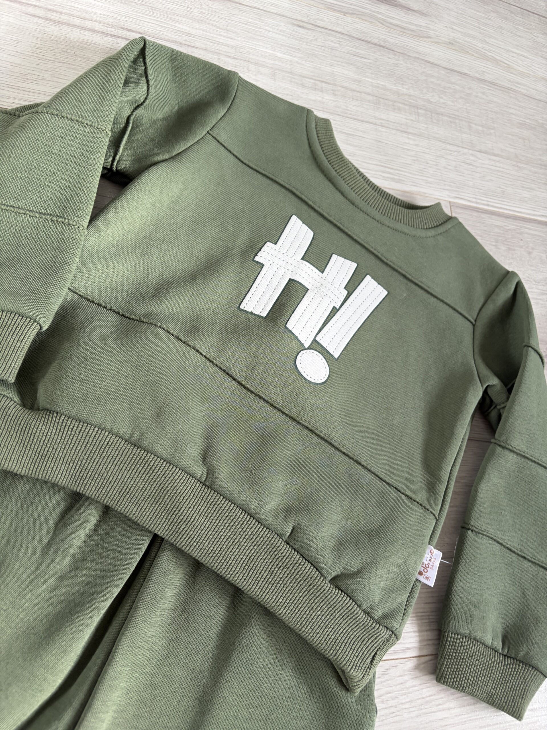 Stylowy i ciepły komplet dresowy dla chłopca w modnym kolorze khaki. Bluza z napisem oraz ozdobnymi przeszyciami nadaje całości nowoczesnego charakteru.