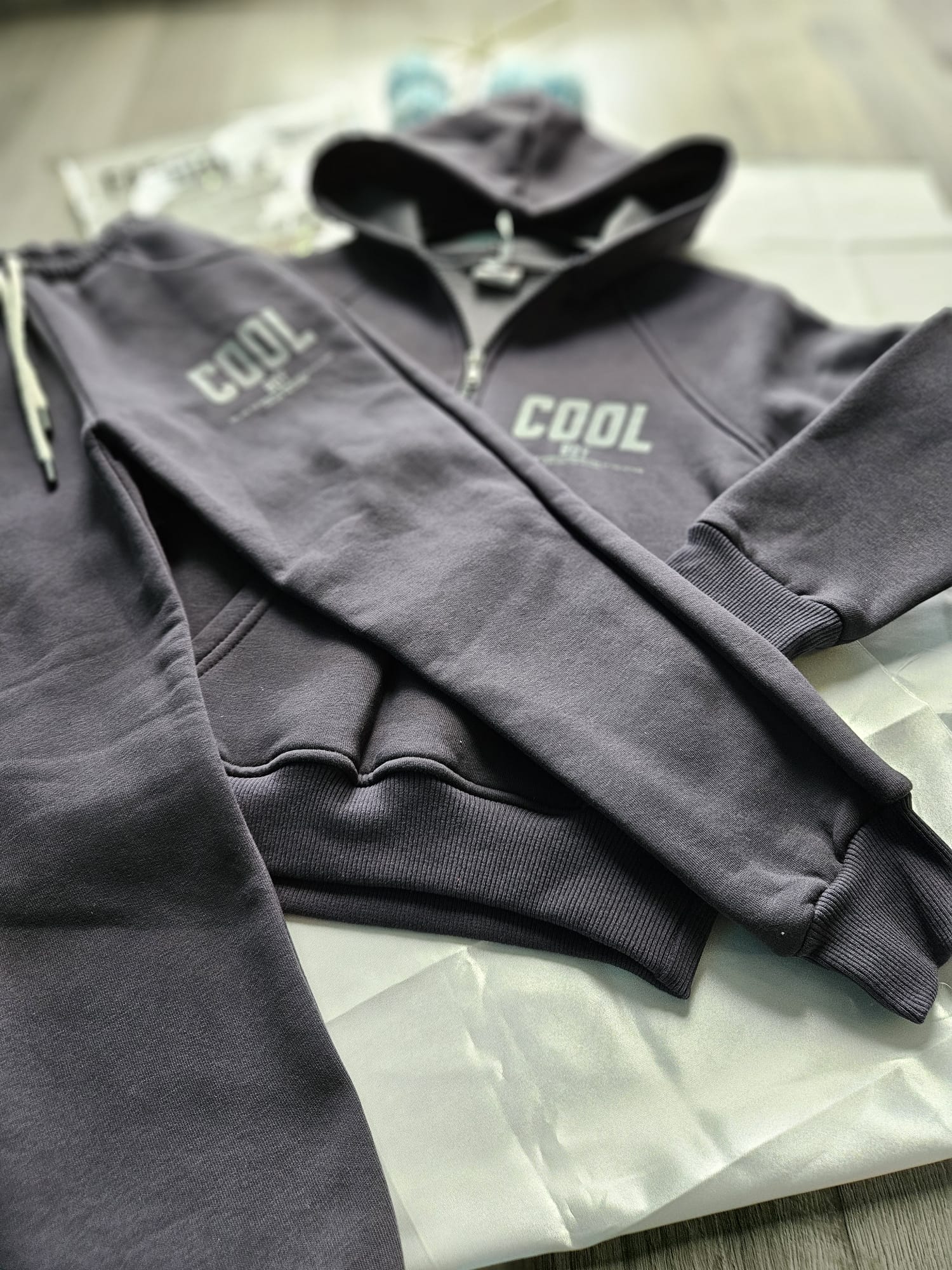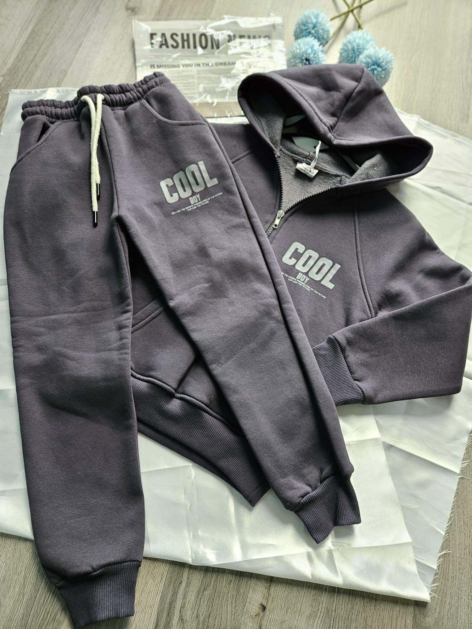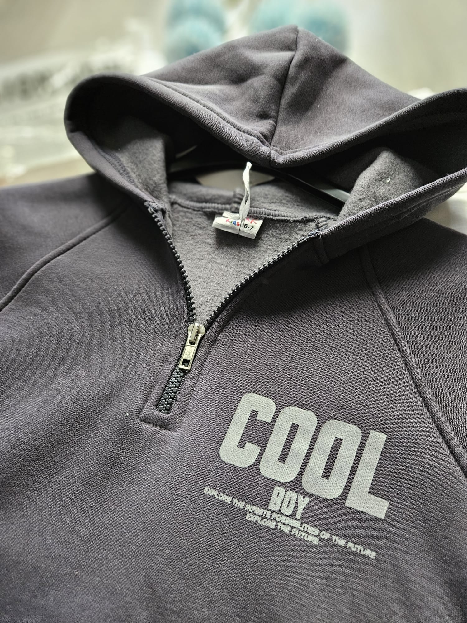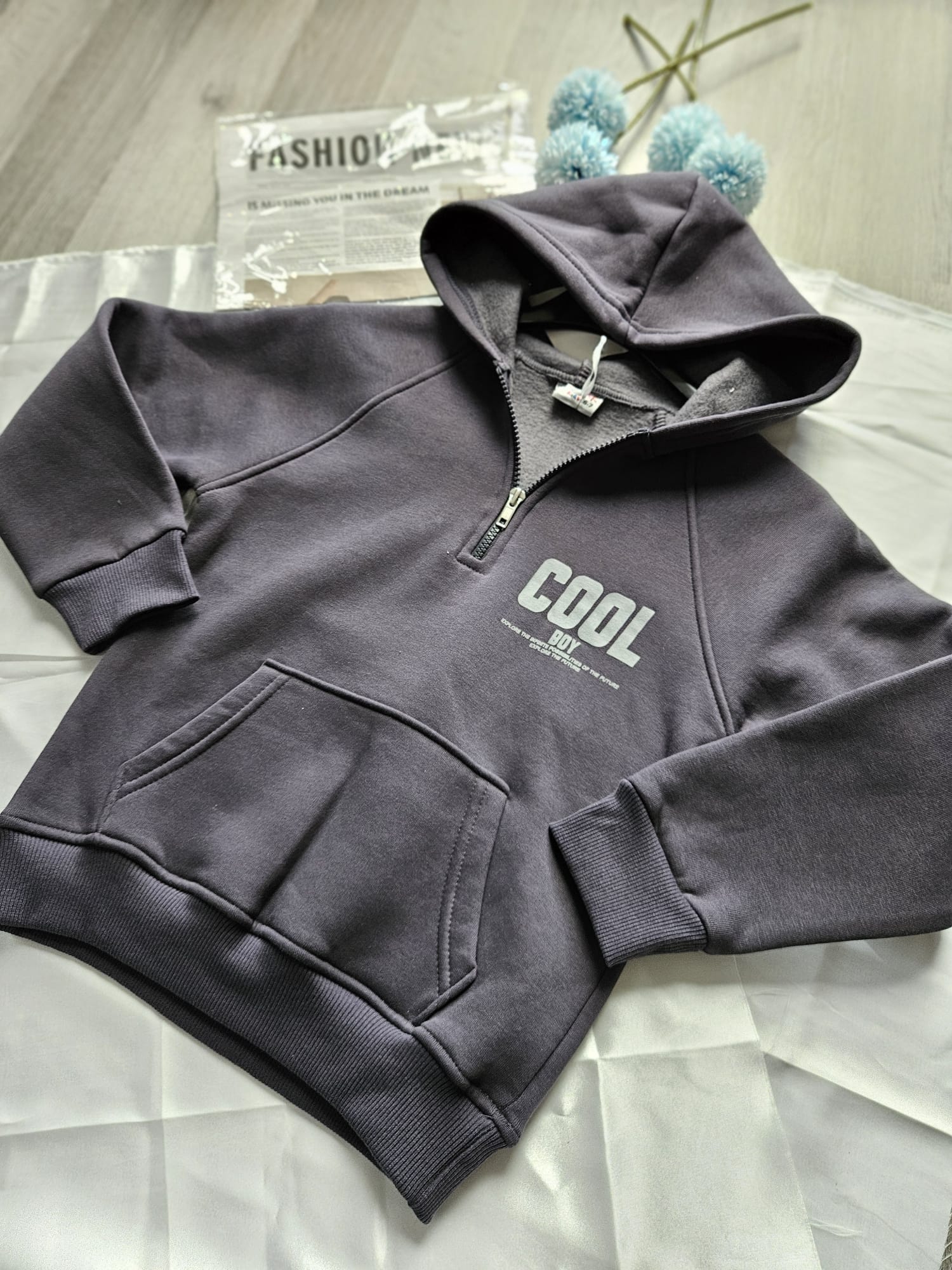 Granatowy komplet dresowy dla chłopca to wygodna i funkcjonalna propozycja na chłodniejsze dni. Ocieplana bluza z kapturem oraz praktycznym zamkiem z przodu (rozsuwanym do połowy) zapewnia komfort i łatwość zakładania.