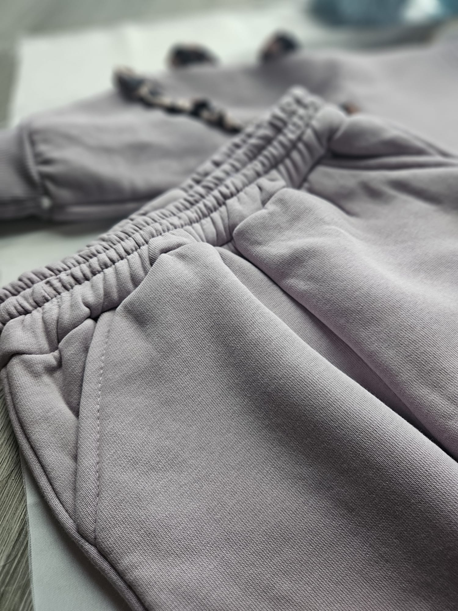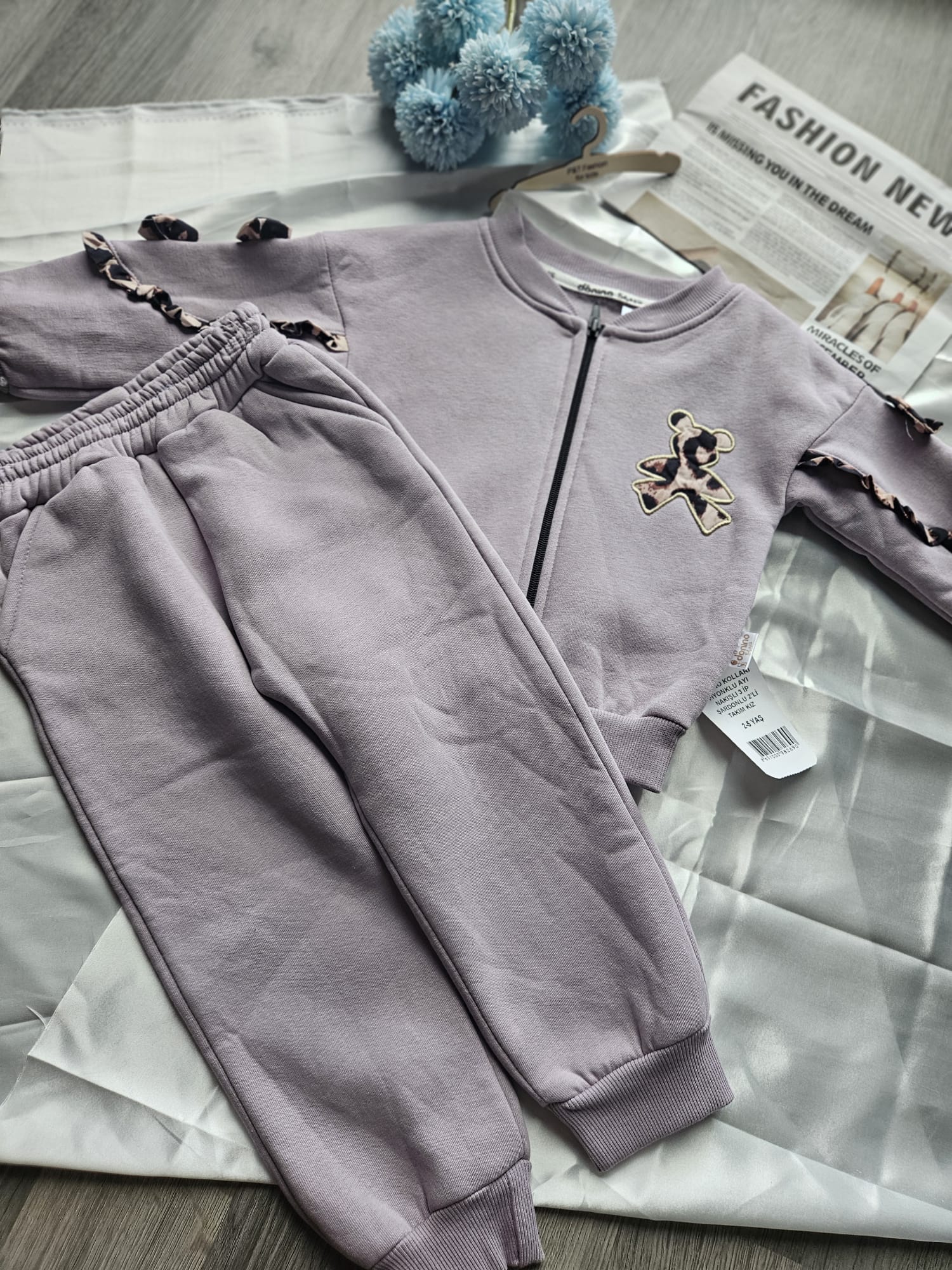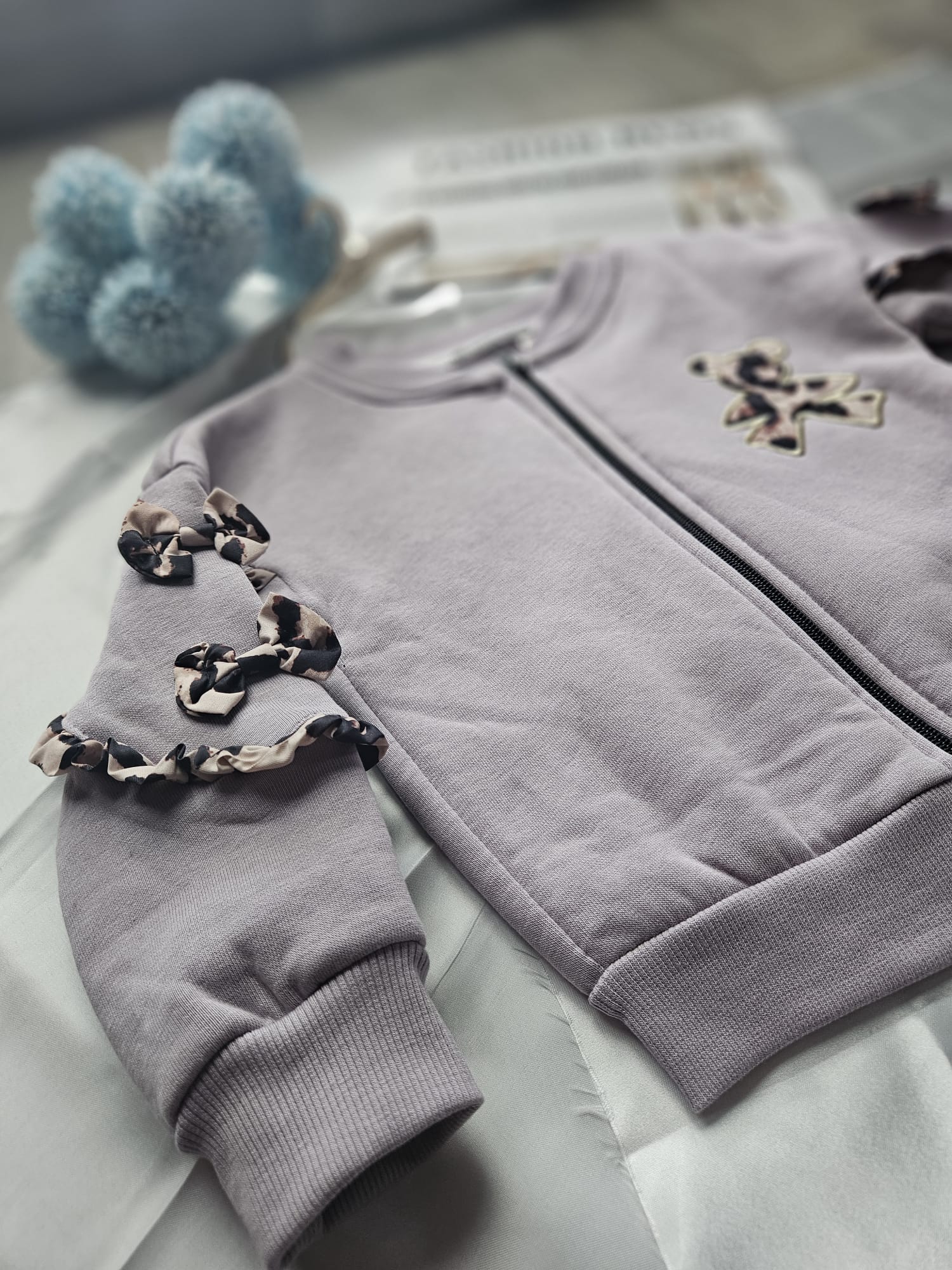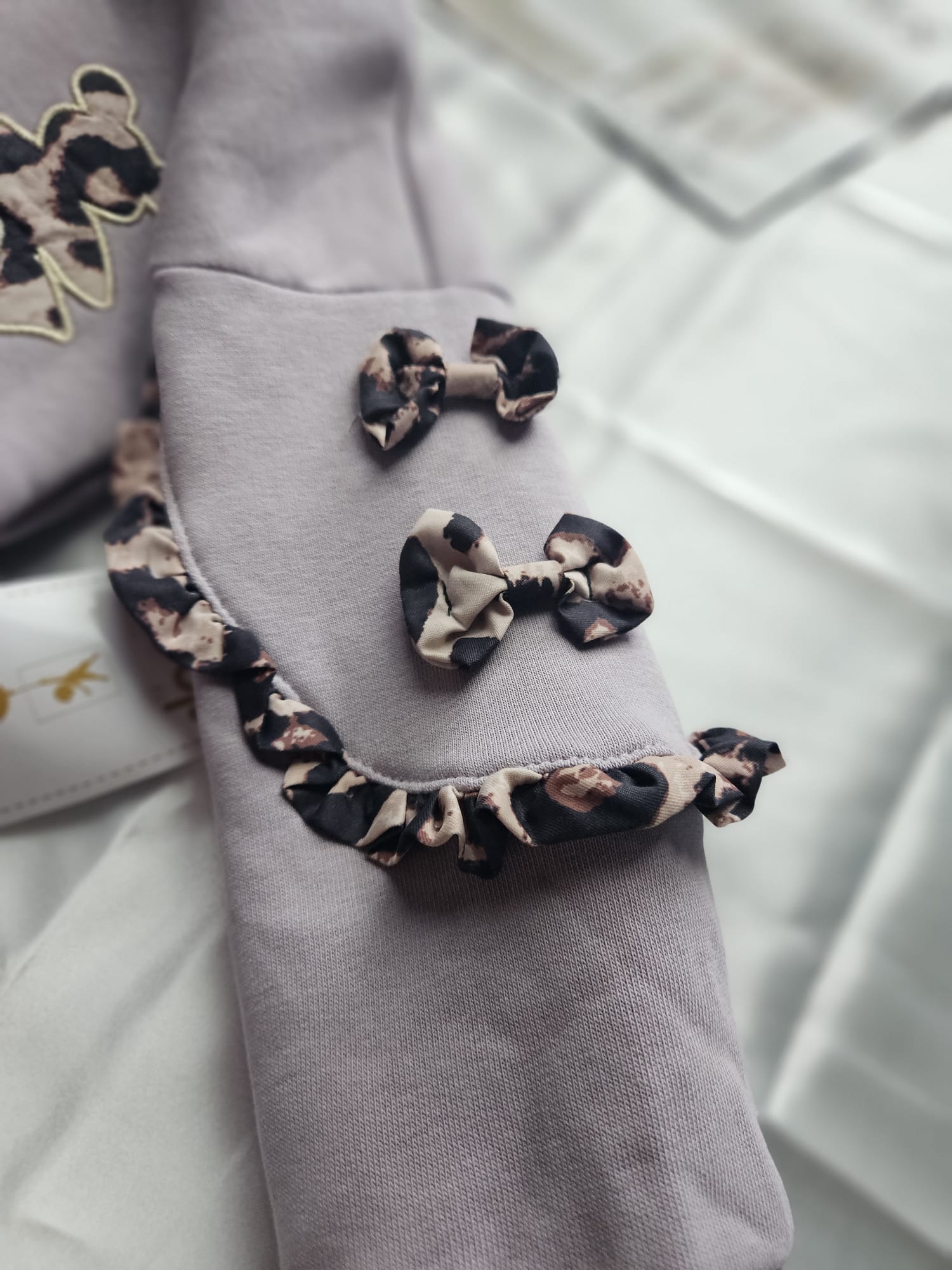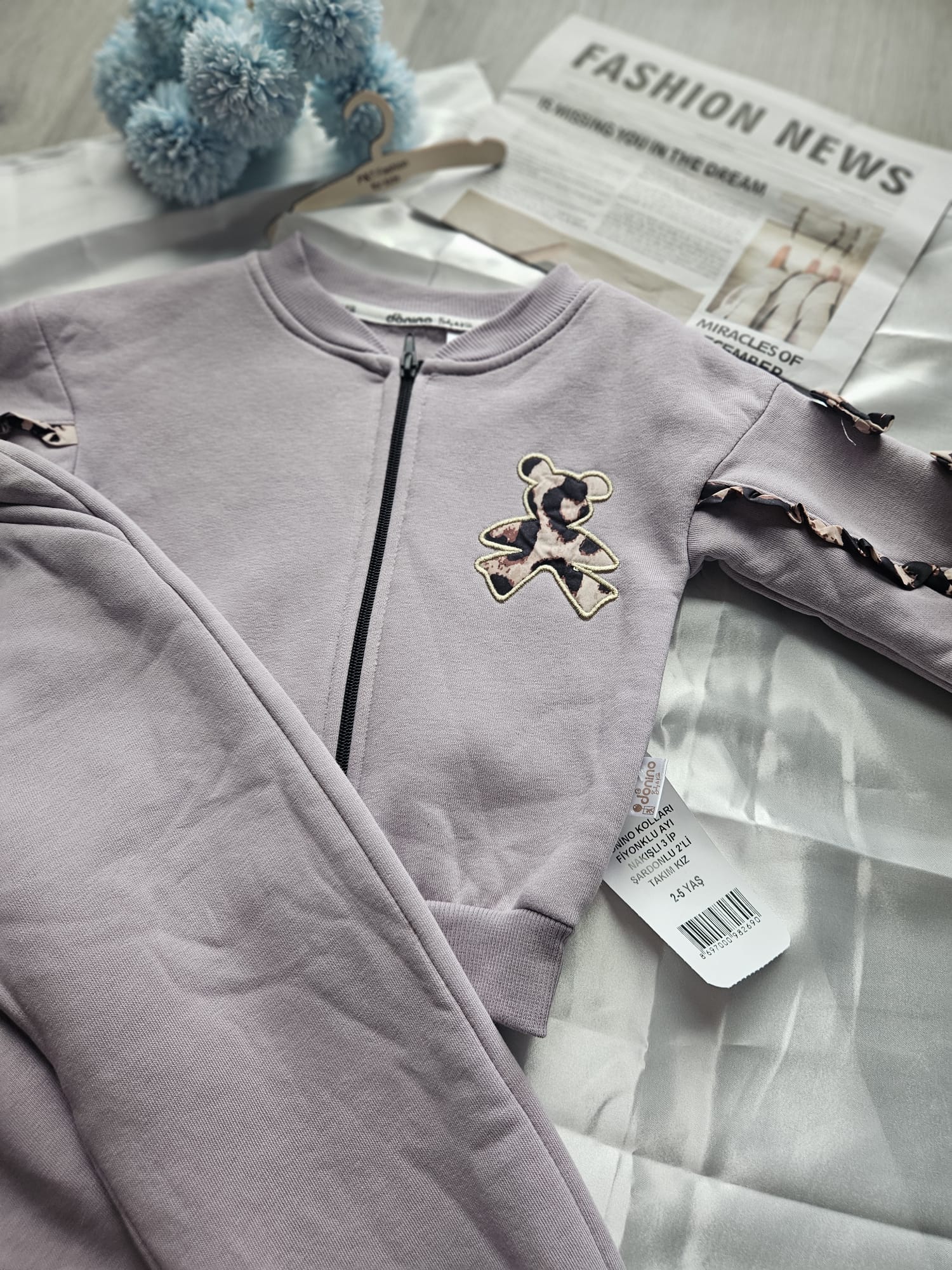 Ocieplany komplet dresowy dla dziewczynki z uroczymi, panterkowymi ozdobami na rękawach to idealny wybór na chłodniejsze, wiosenne dni. Miękki, ciepły i pełen dziewczęcego uroku – sprawdzi się na spacer, do przedszkola i na rodzinne wyjścia.