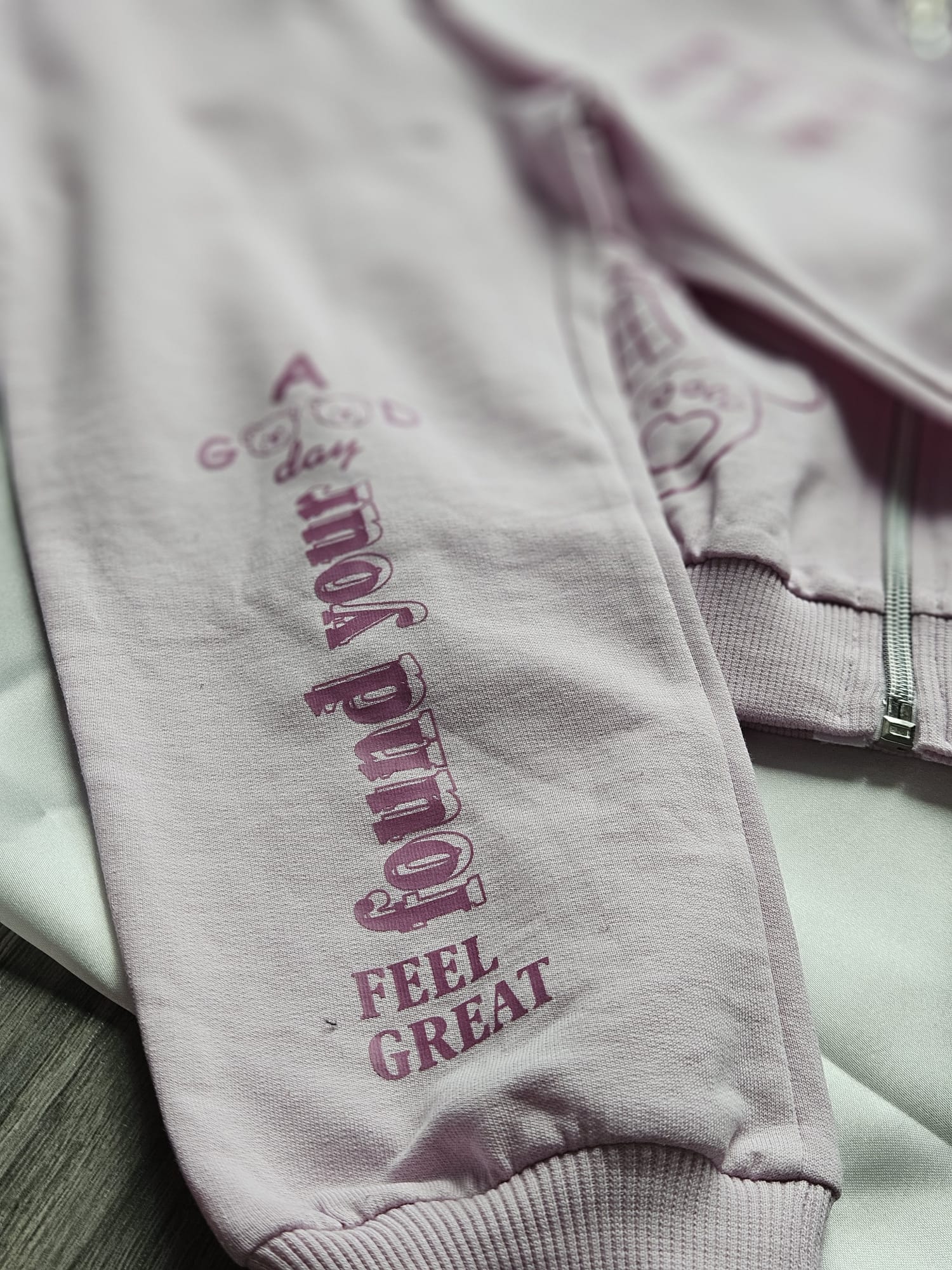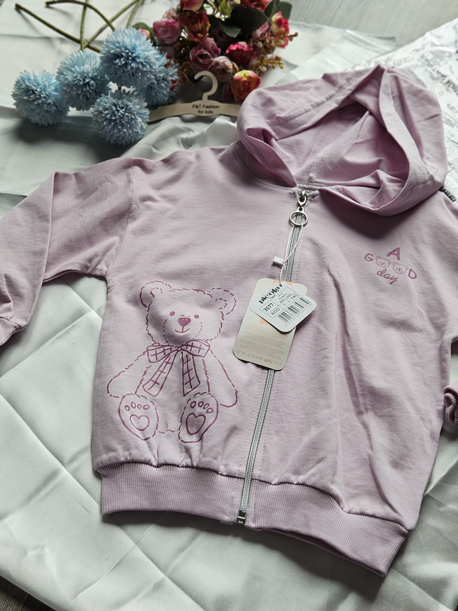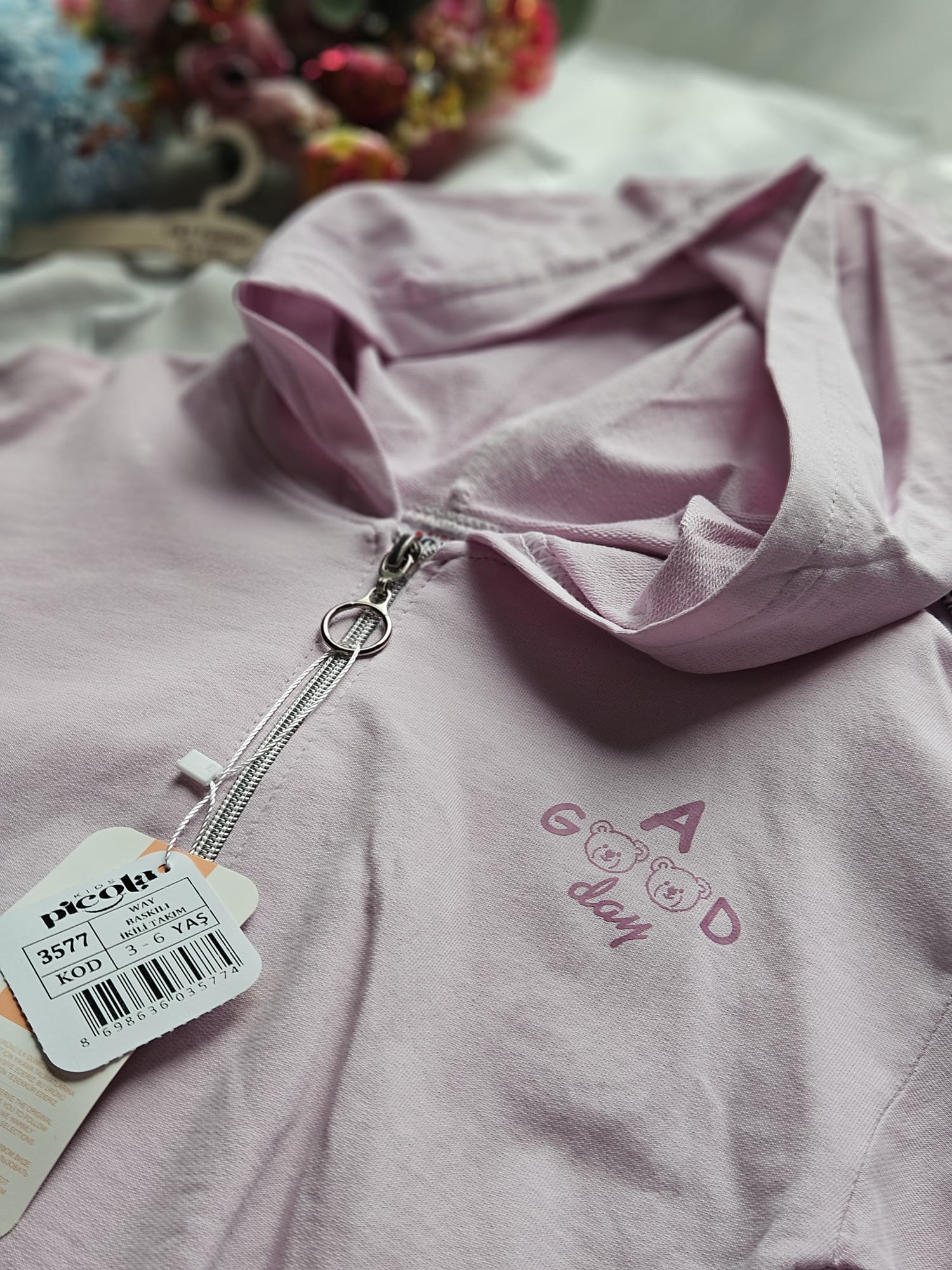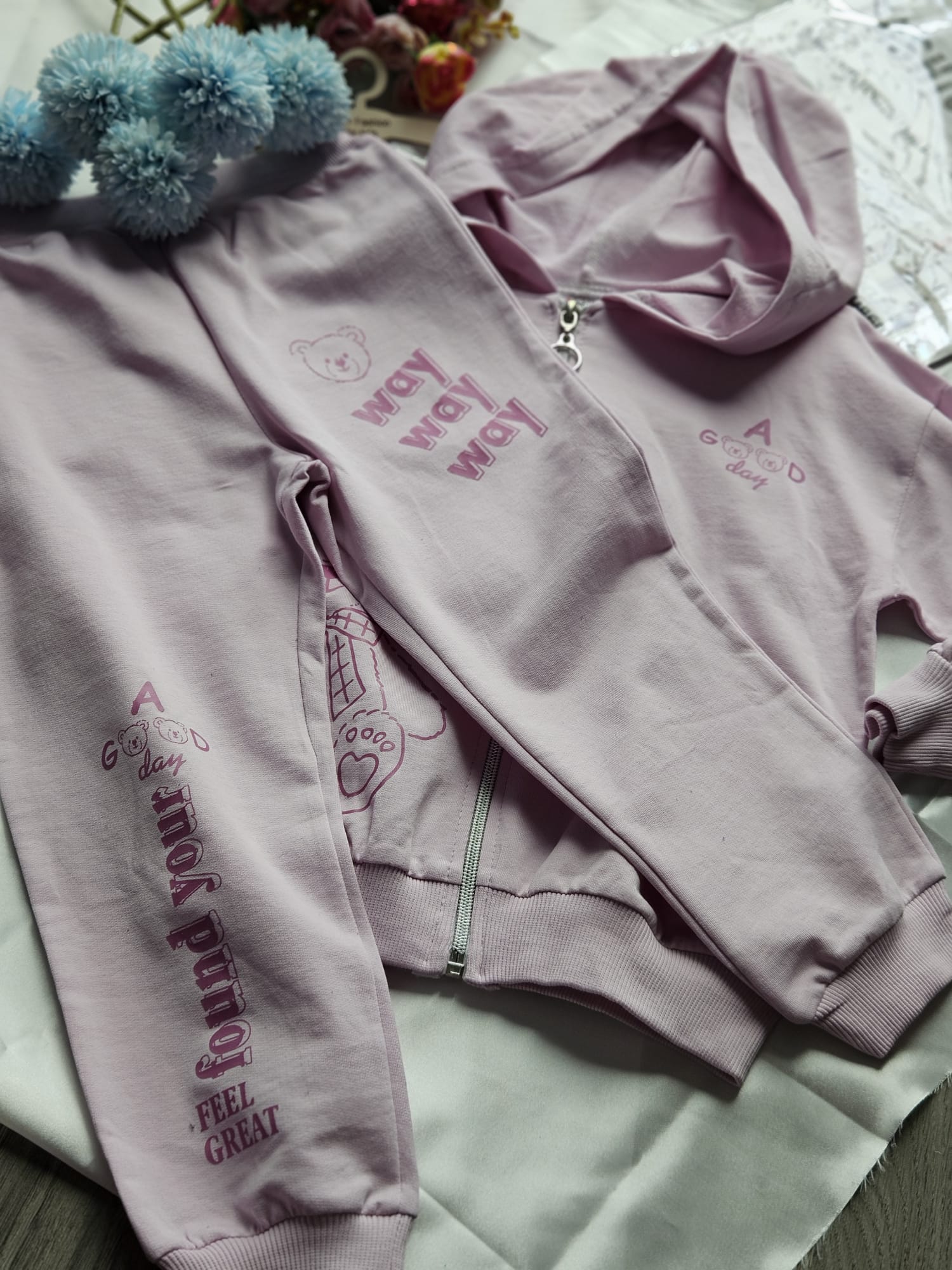 Stylowy komplet dresowy dla dziewczynki w subtelnym różowym kolorze. Bluza z kapturem zapinana na zamek, z delikatnym nadrukiem. Spodnie wygodne, z elastyczną talią, zapewniają swobodę ruchów.