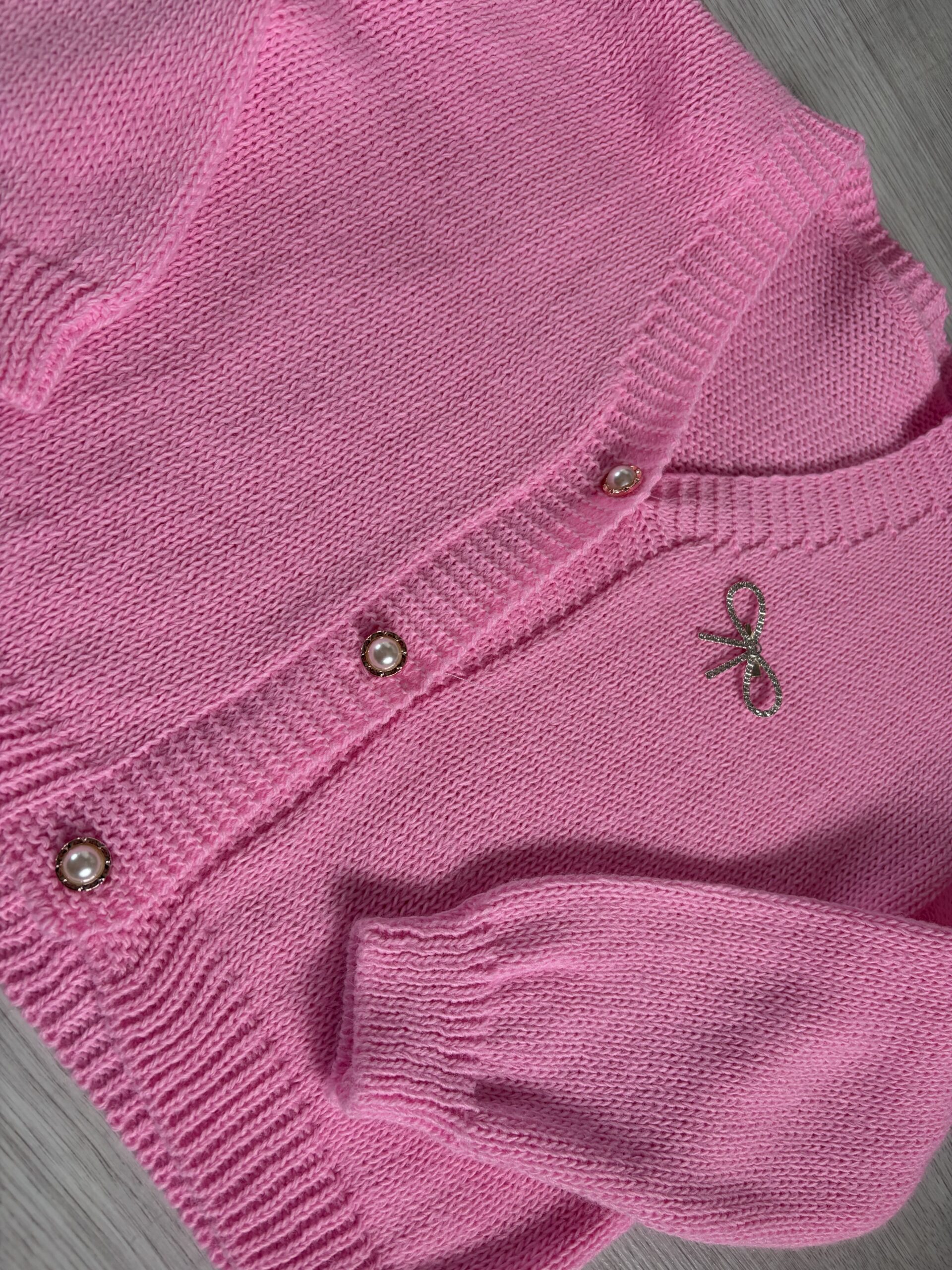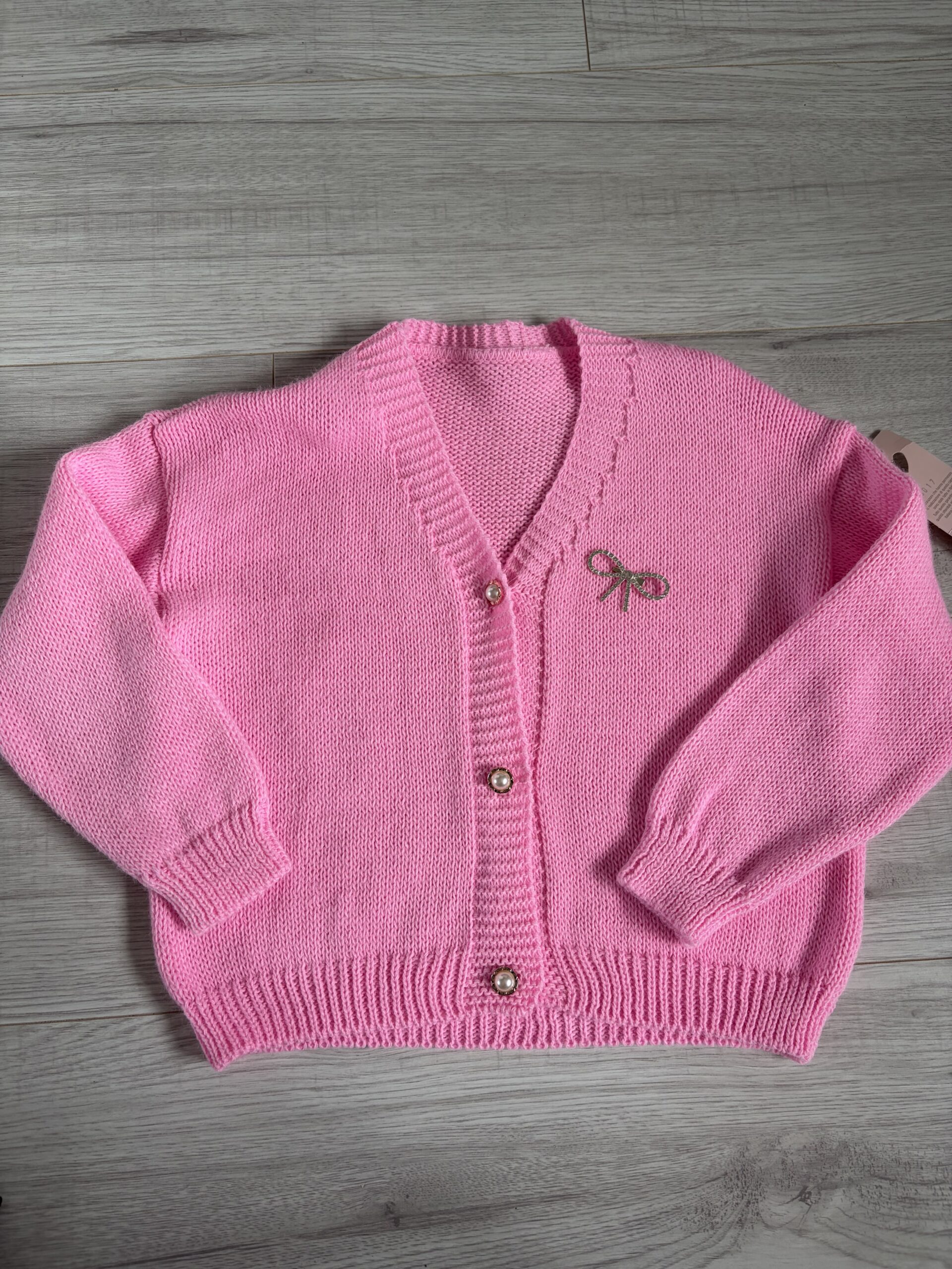 Stylowy sweter dziewczęcy w delikatnym różowym kolorze. Zapinany na guziki, idealny do sukienki, spódniczki lub jeansów.